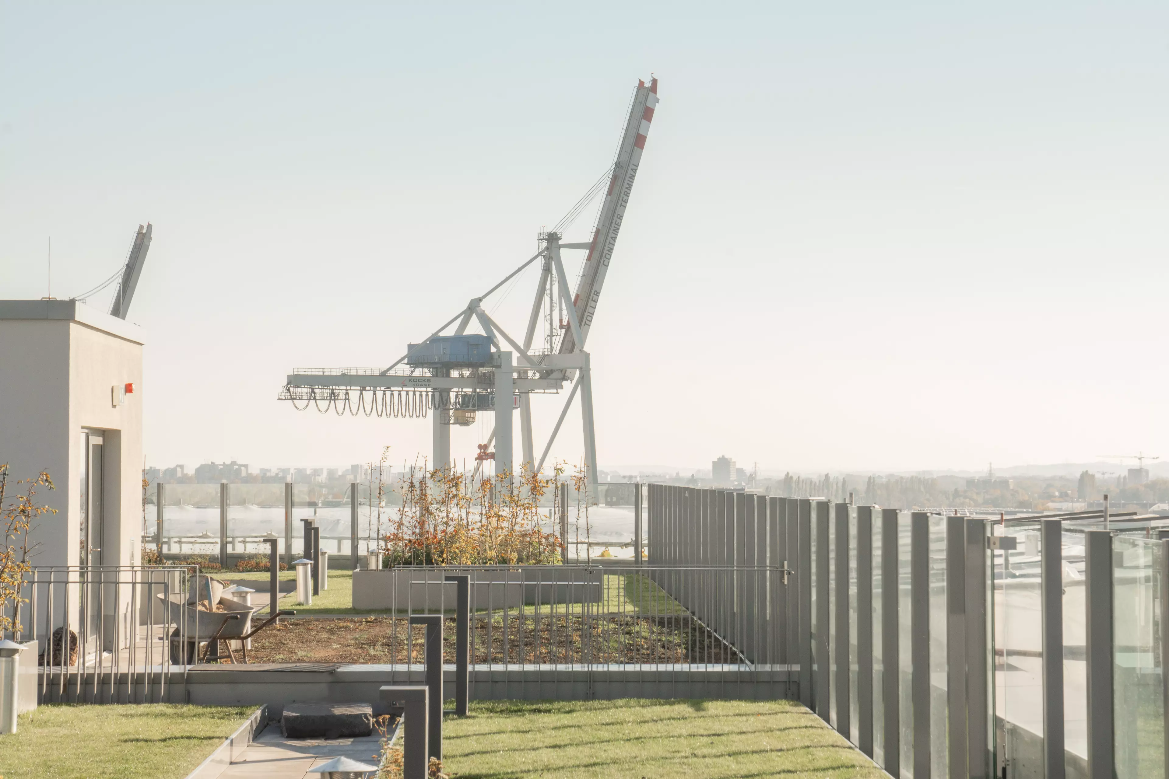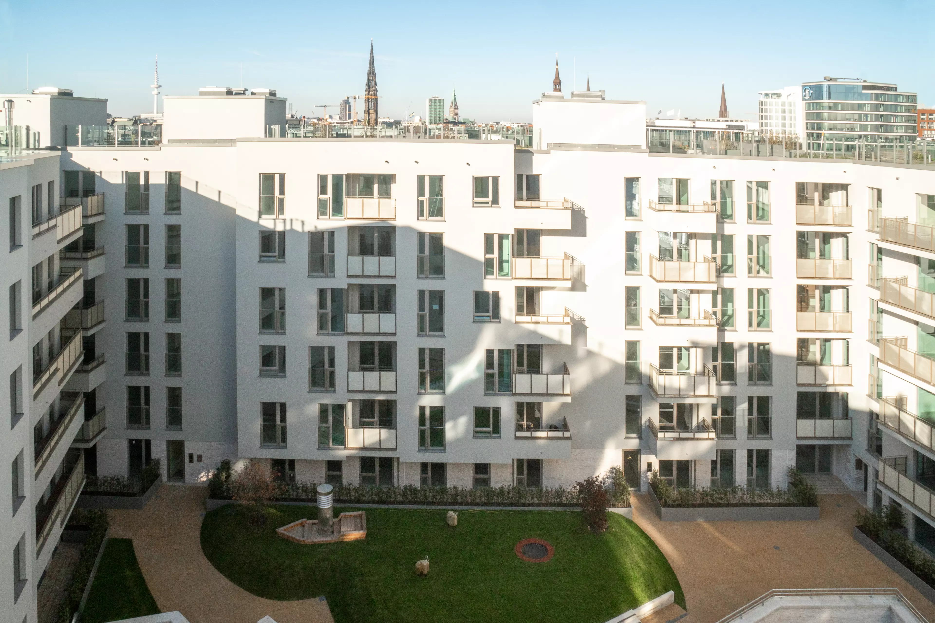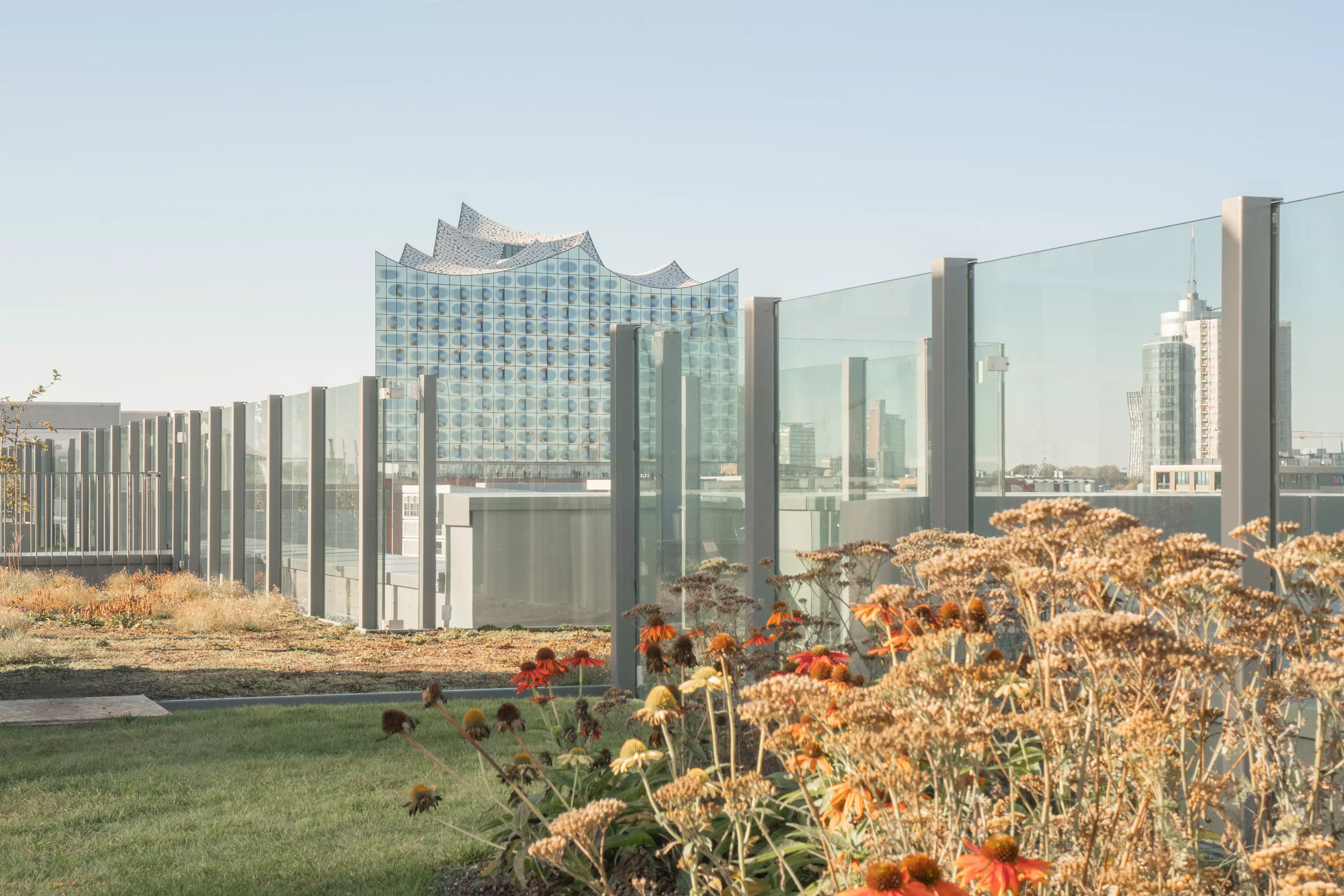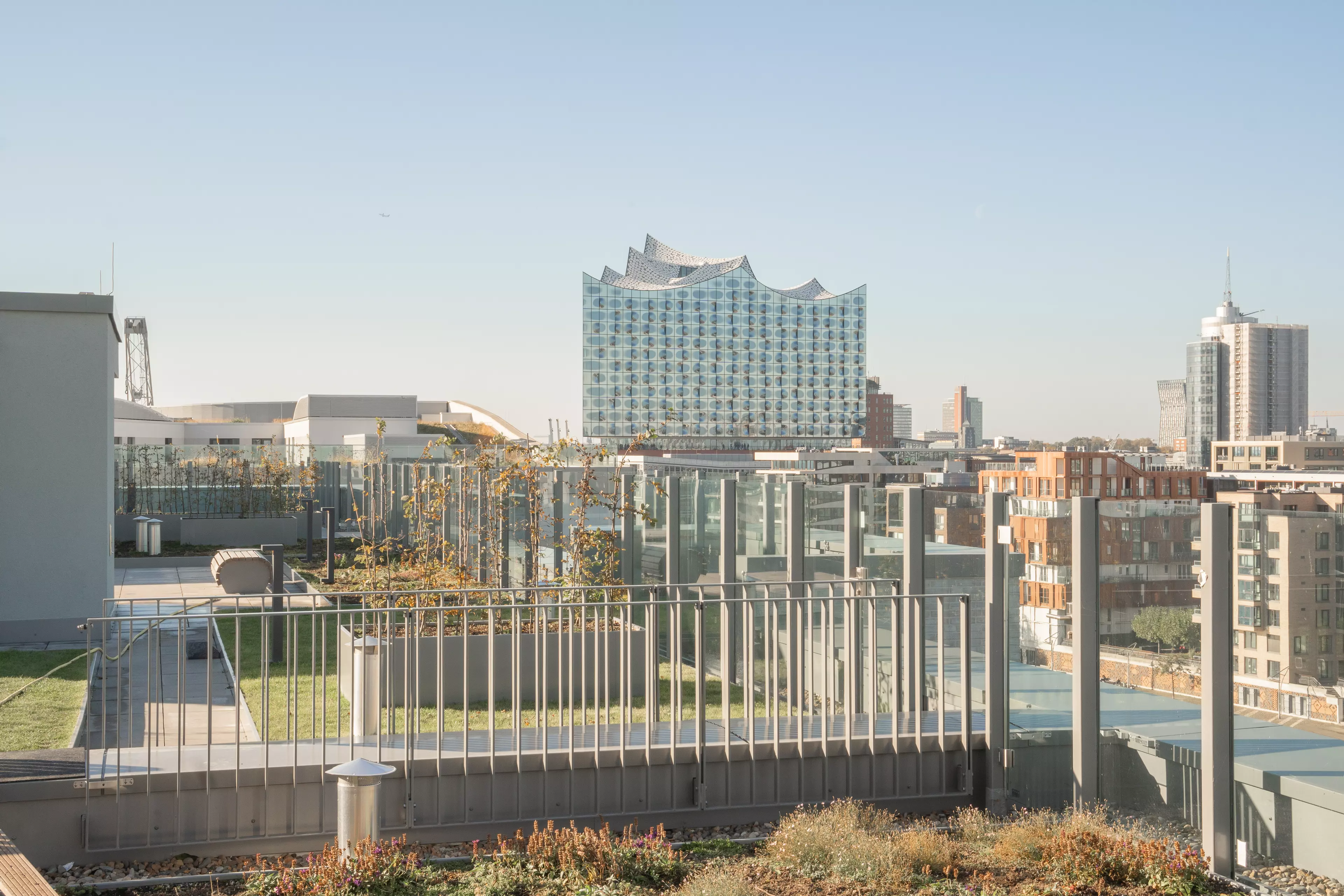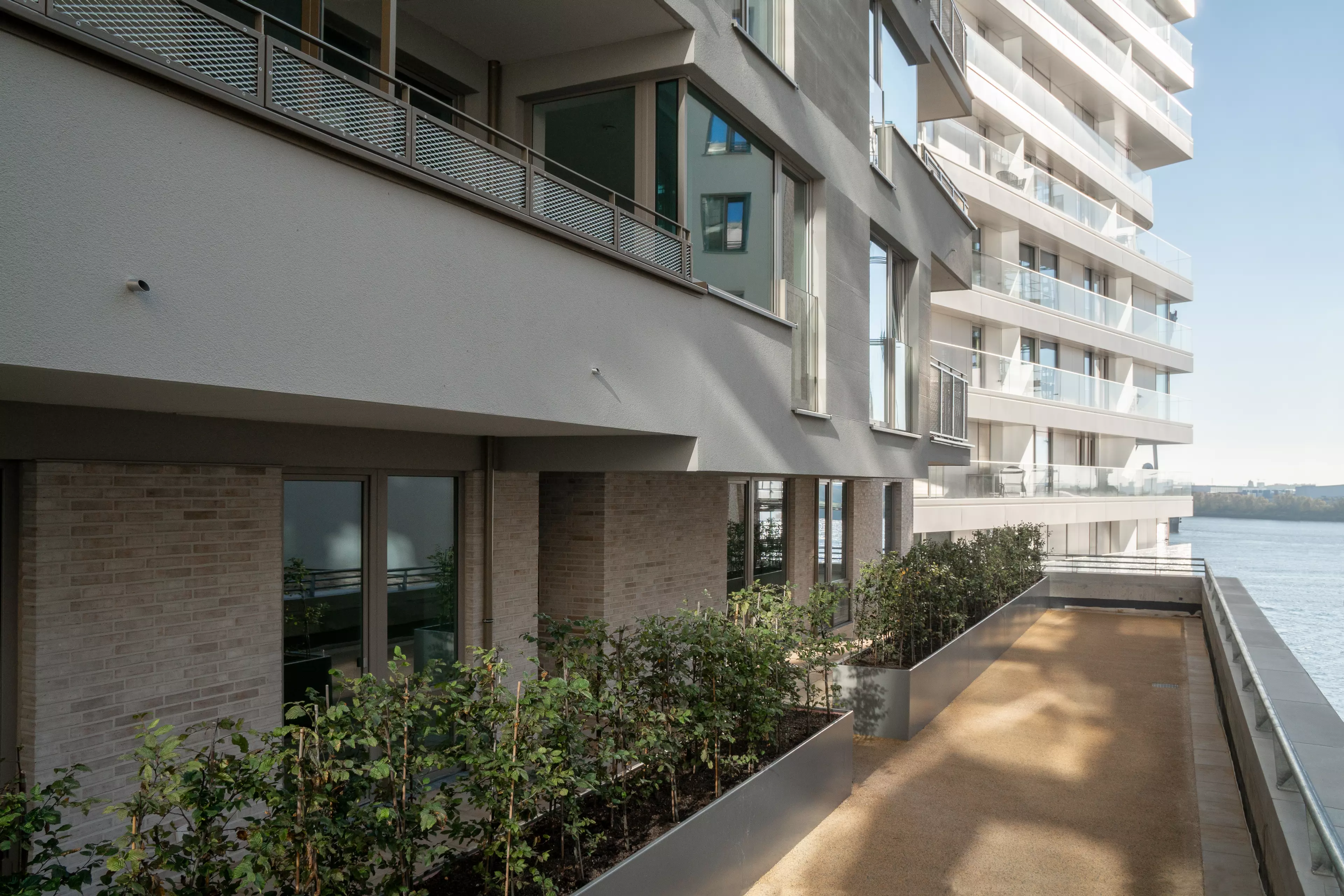 Jede Wohnung verfügt über einen windgeschützten, der Sonne zugewandten Freisitz mit unverstellter Sicht über die Norderelbe. Auf der Dachterrasse finden sich großzügige Spielflächen für Kinder und im Innenhof ein geschützter Raum für die Mieter. Anwohner und Besucher profitieren zudem von den öffentlichen Promenadenplätzen mit ihren zahlreichen Kulturangeboten, Restaurants, Sportmöglichkeiten und grünen Oasen.