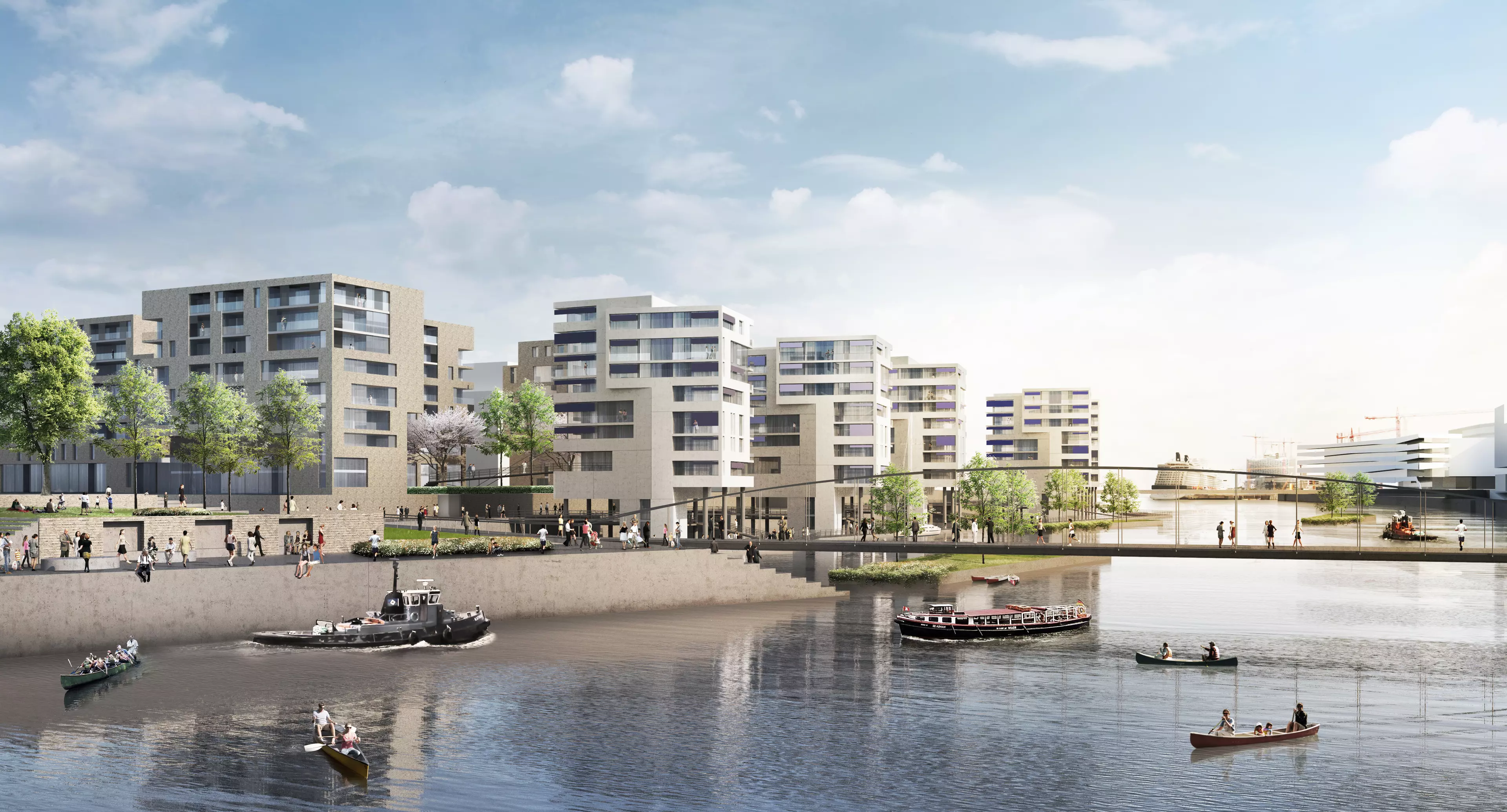 Das Quartier setzt ökologische und soziale Maßstäbe. Eine hohe Lebensqualität entsteht durch eine vielfältige Nutzung des Wasserraums, grüne Quartiersplätze und eine öffentlich zugängliche Promenade entlang der Wasserkante.