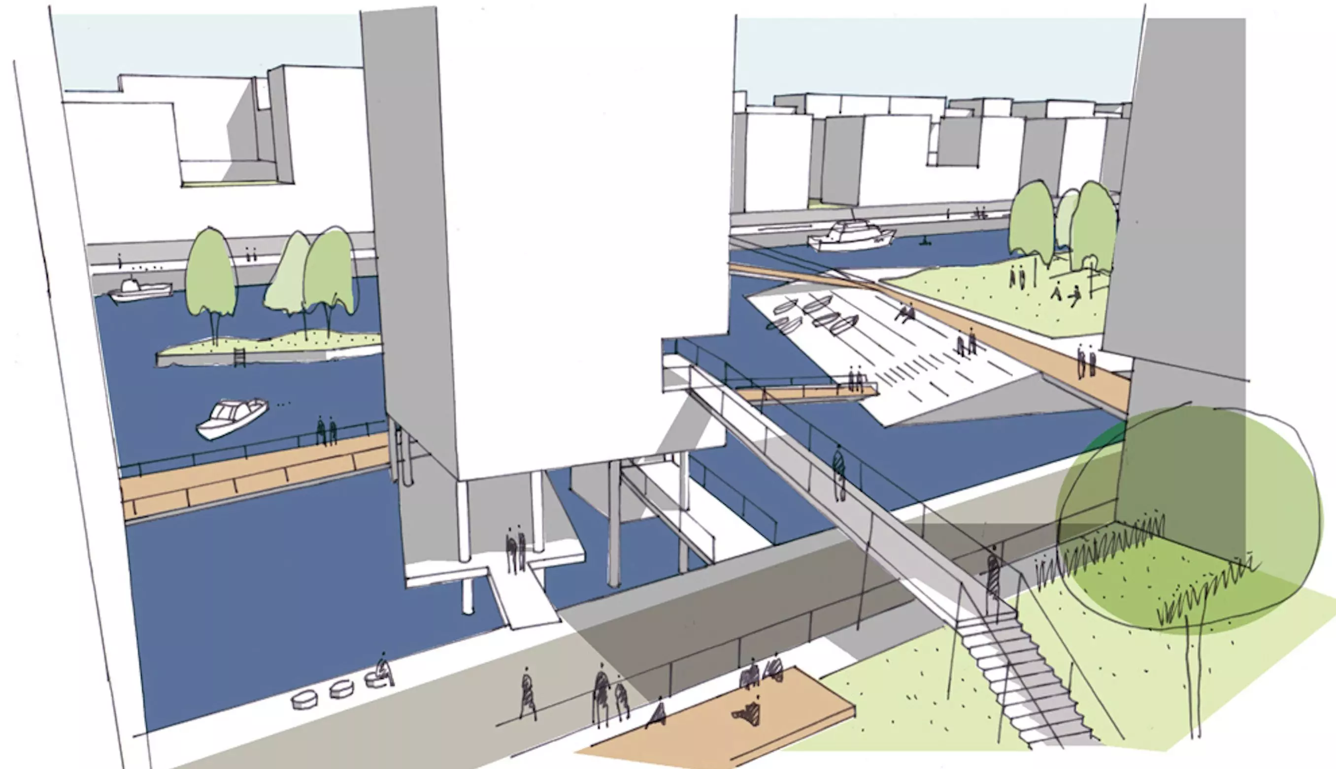 Höfe, Plätze und Parkanlagen bieten Raum für Begegnungen und Erholung. Ein System aus Brücken, Stegen, Rampen und Stufen ermöglicht den Bewohnern, die verschiedenen Ebenen des Quartiers zu erreichen und die Nähe zum Wasser zu genießen.