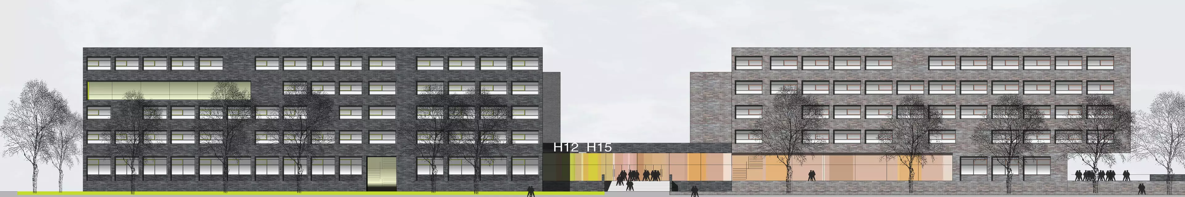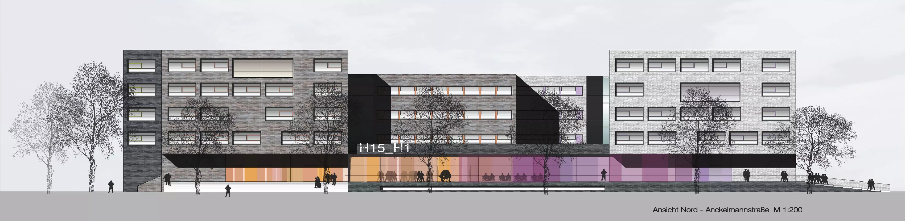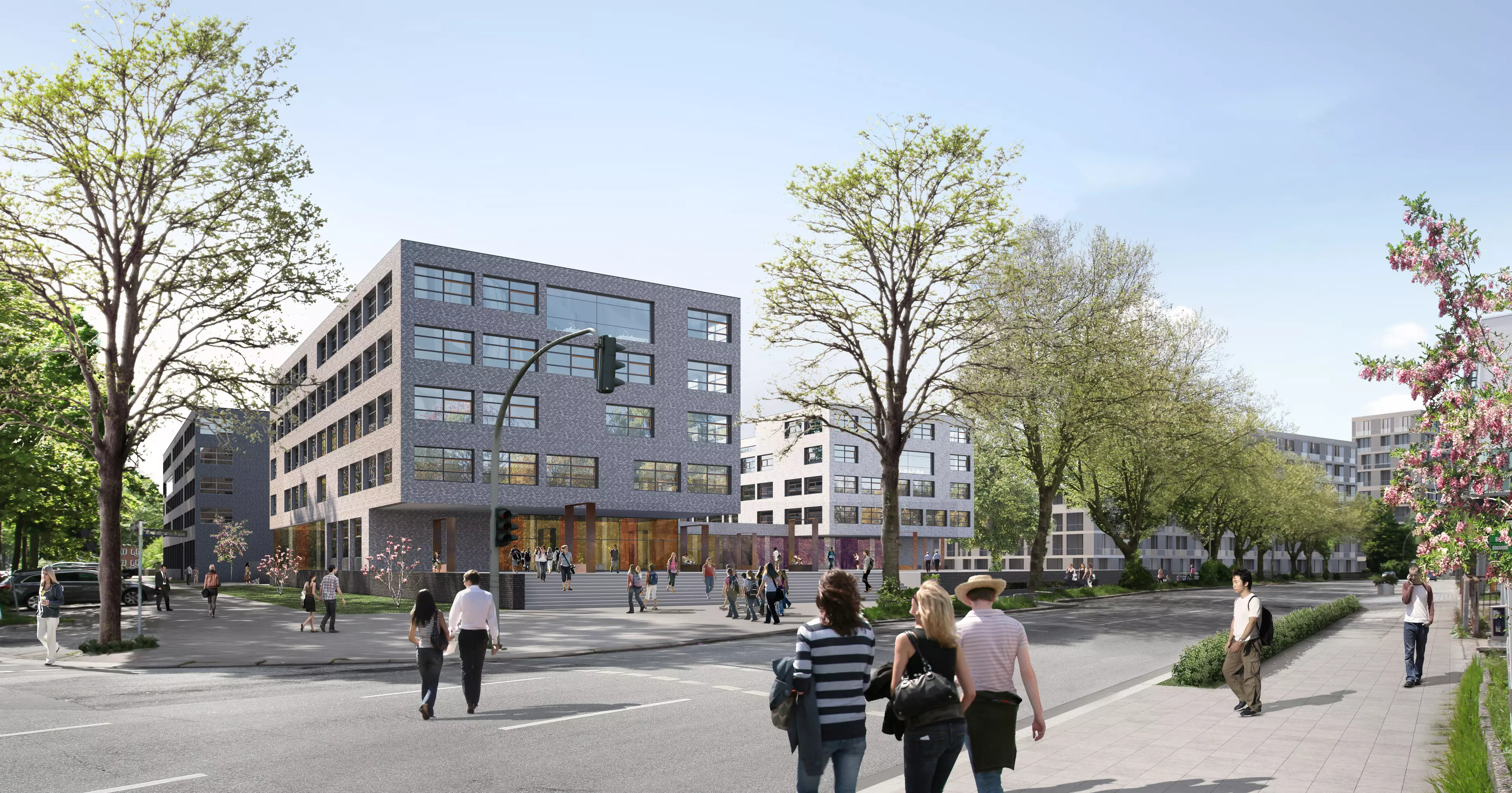 Der kompakte Schulkomplex ist strategisch im östlichen Teil des Grundstücks angeordnet, was Raum für hochwertige Bürogebäude im westlichen Bereich schafft und gleichzeitig eine harmonische Integration in die städtebauliche Umgebung ermöglicht. Durch die klare Ausrichtung der Gebäude zur Anckelmannstraße hin entsteht eine markante Sichtachse und eine einladende Adresse für Bildung und Innovation.