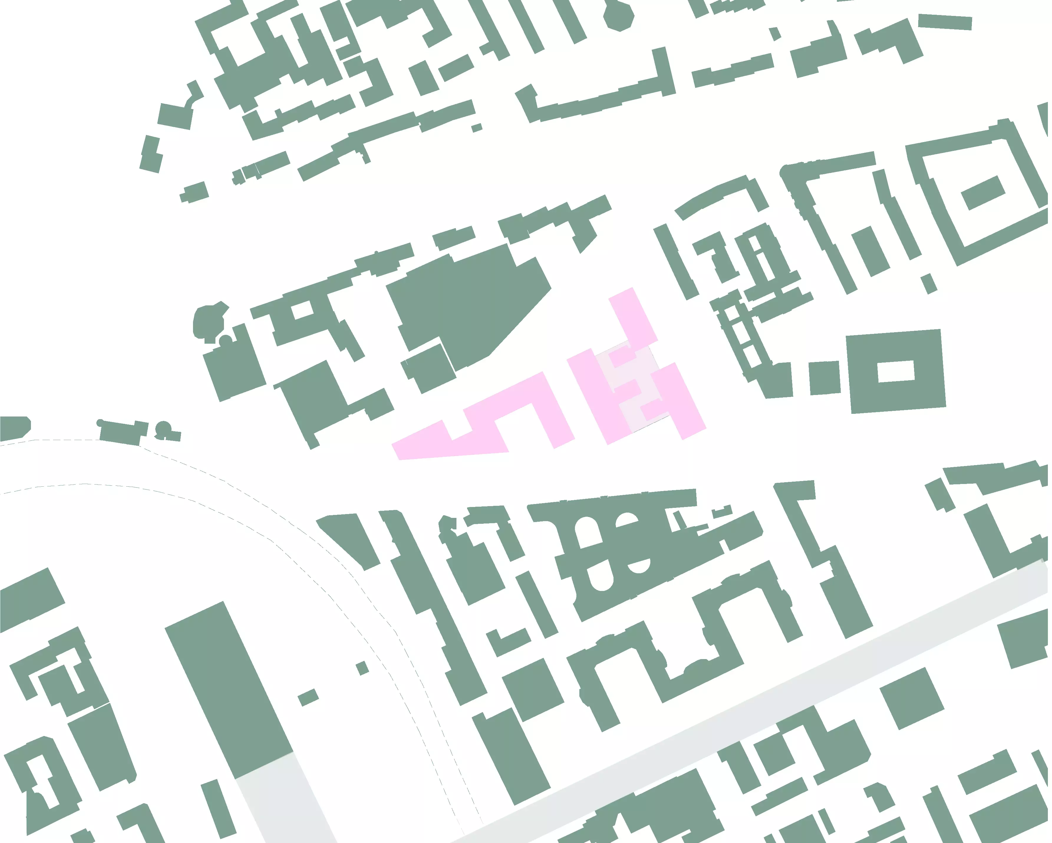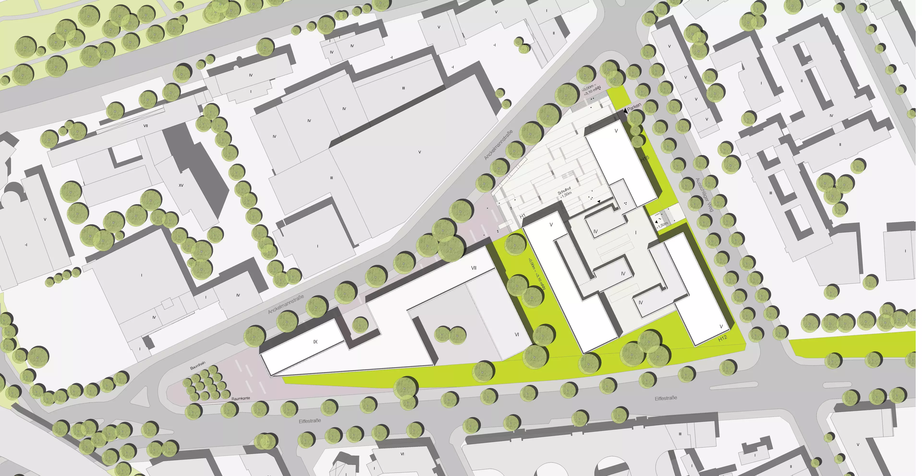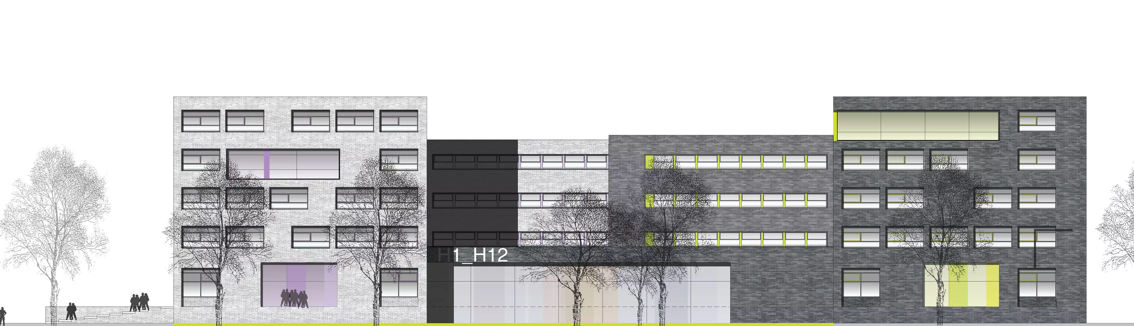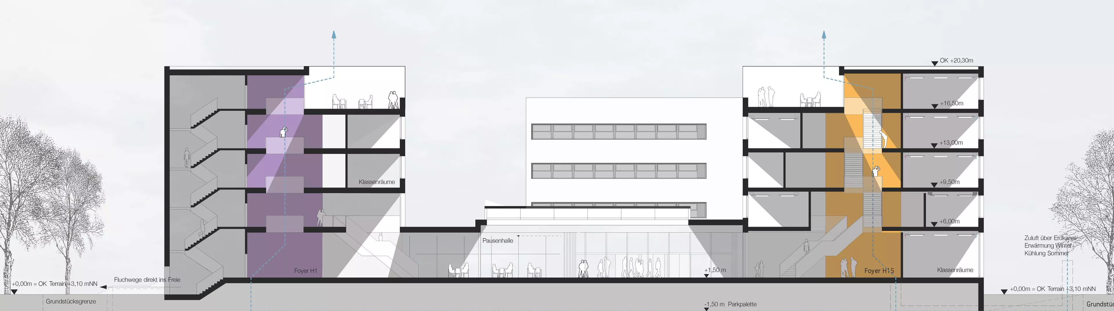 Der kompakte Schulkomplex ist strategisch im östlichen Teil des Grundstücks angeordnet, was Raum für hochwertige Bürogebäude im westlichen Bereich schafft und gleichzeitig eine harmonische Integration in die städtebauliche Umgebung ermöglicht. Durch die klare Ausrichtung der Gebäude zur Anckelmannstraße hin entsteht eine markante Sichtachse und eine einladende Adresse für Bildung und Innovation.