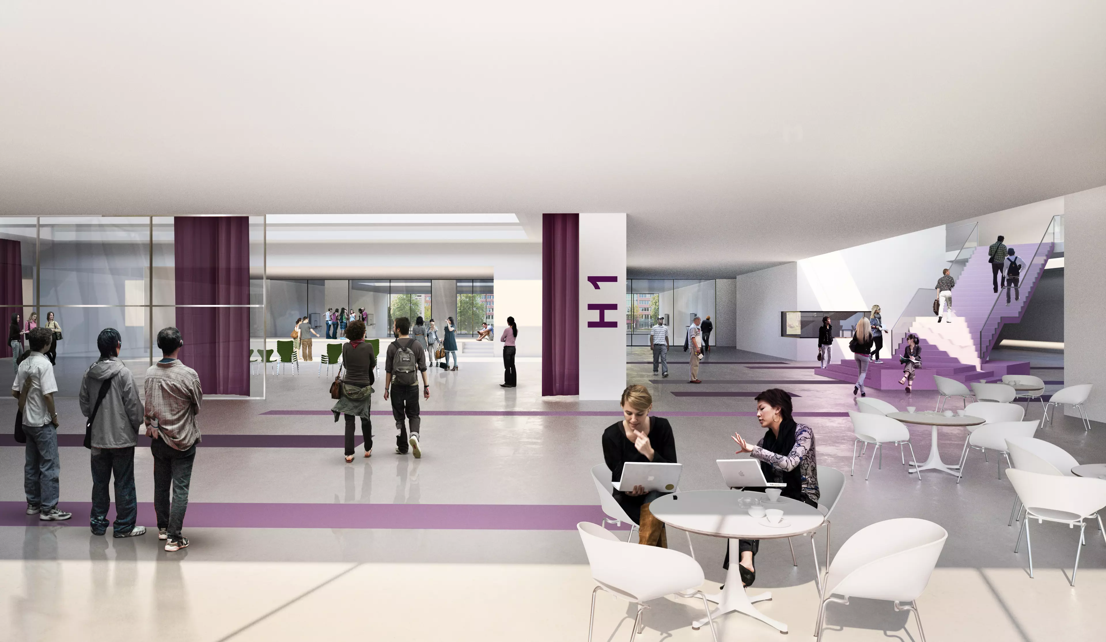 Das Herzstück des Bildungscampus bildet ein offenes Forum, das als lebendiger Treffpunkt und zentraler Platz für Schüler, Lehrer und Anwohner fungiert. Über großzügige Treppenanlagen gelangen Besucher auf eine erhöhte Plattform, die den Vorplatz der Schule definiert und mit farbigen Glasbausteinen gestaltet ist, die tagsüber Licht in die darunterliegende Parkgarage bringen und nachts für eine atmosphärische Beleuchtung sorgen. Das pädagogische Konzept des Campus vereint Kompaktheit mit Kommunikation und Individualität.