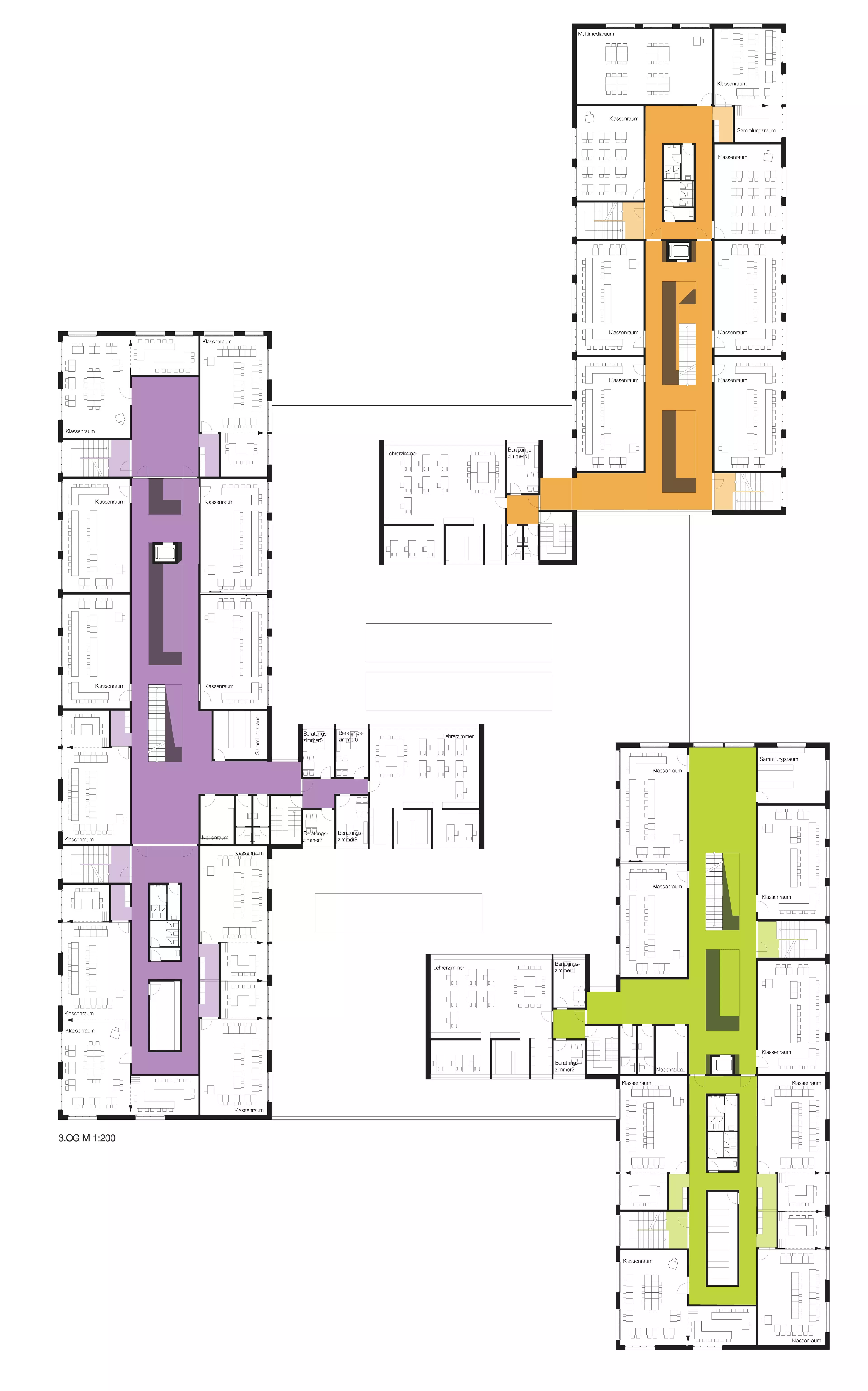 Die Architektur des Campus zeichnet sich durch ihre Komplexität und Vielfalt aus, wobei die drei Schulgebäude in ihrer Gestaltung deutlich voneinander ablesbar sind. Die Fassaden, bestehend aus einer Verblendung in verschiedenen Grautönen, verleihen dem Campus eine moderne Ästhetik, die sich harmonisch in das urbane Umfeld einfügt.
