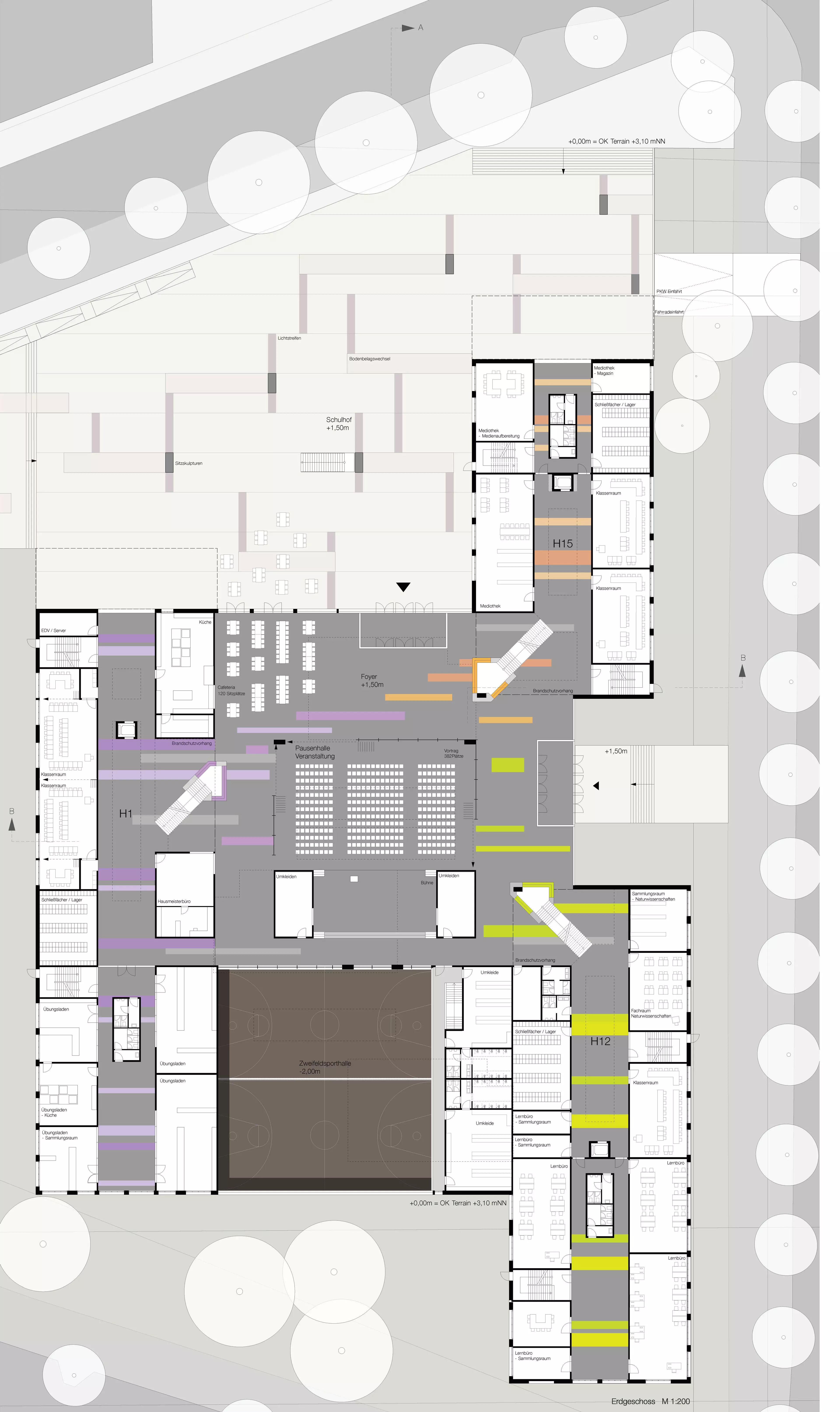 Die Schulgebäude sind auf einem erhöhten Plateau angeordnet und verfügen über ein gemeinsames Sockelgeschoss mit Cafeteria, Pausenhalle und Sporthalle. Offene Treppenhallen verbinden die einzelnen Schulen miteinander und schaffen eine dynamische Lernumgebung. Ein kostengünstiges Parkdeck unterhalb des Platzplateaus sorgt für ausreichend Parkmöglichkeiten und wird natürlich belüftet. Der erhöhte Vorplatz dient nicht nur als Schulhof, sondern auch als Treffpunkt und Begegnungsstätte für die gesamte Gemeinschaft. Unser Bildungscampus Anckelmannstraße steht für eine innovative Bildungskultur und eine lebendige städtische Entwicklung im Herzen Hamburgs.