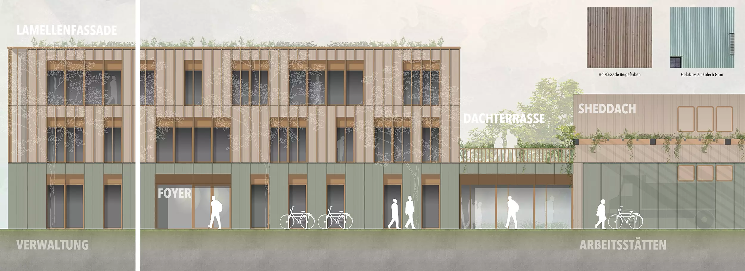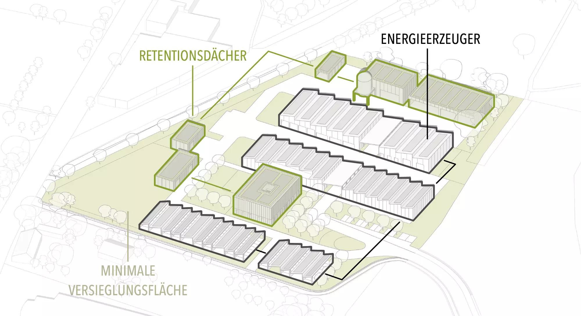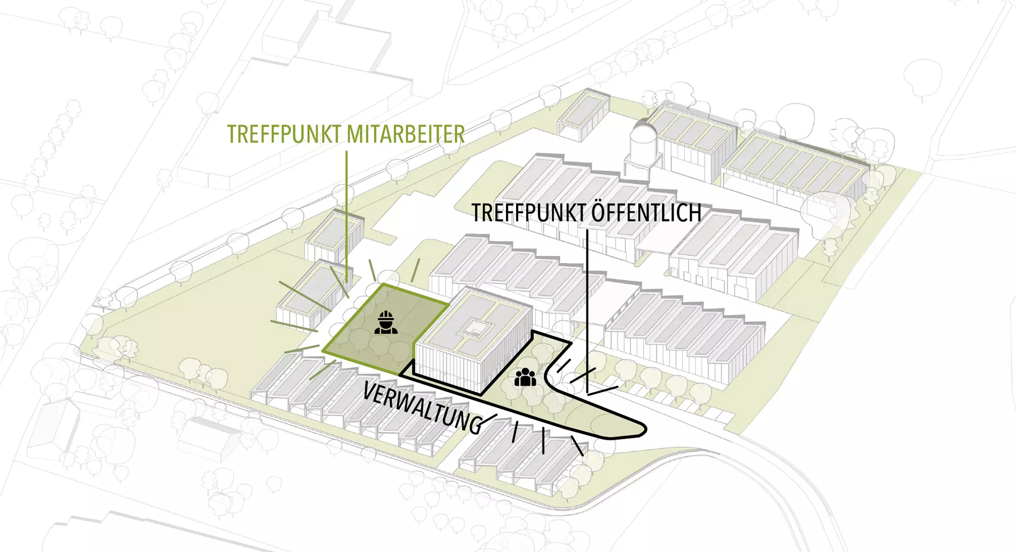 Ein zentraler Aspekt des Konzepts ist die kompakte Anordnung der Gebäude, um effiziente Verkehrswege und eine klare Trennung der Funktionsbereiche zu gewährleisten. Die Gebäudekubaturen wurden komprimiert, und versiegelte Flächen wurden nur dort angelegt, wo sie zwingend erforderlich sind. Grünflächen und begrünte Pergolen über den Verkehrsflächen schaffen eine angenehme Arbeitsumgebung und fördern die ökologische Nachhaltigkeit.