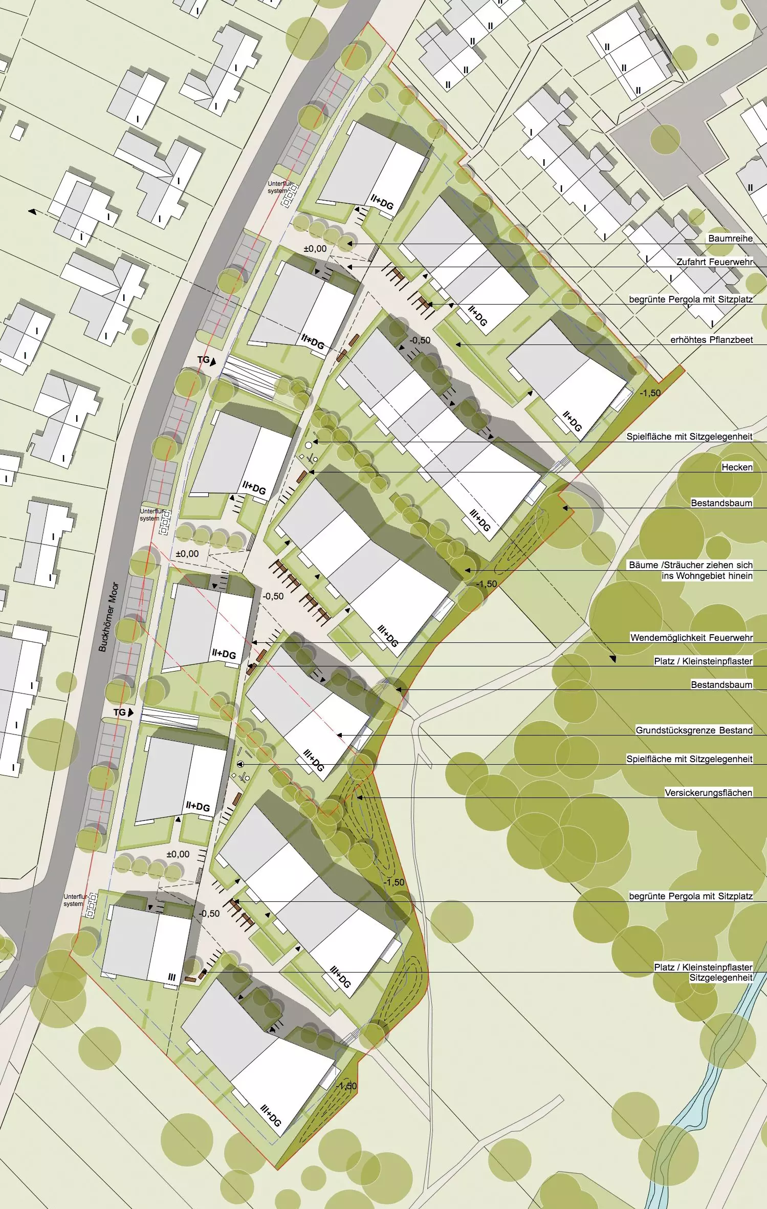 Das geplante Wohnquartier am Buckhörner Moor präsentiert eine innovative Interpretation der traditionellen Satteldach-Typologie, die sich harmonisch in die umgebende Bebauung einfügt. Die architektonische Gestaltung, inspiriert von den benachbarten Einzelhäusern, verleiht dem Wohnkomplex eine einladende Atmosphäre und eine charakteristische Silhouette.