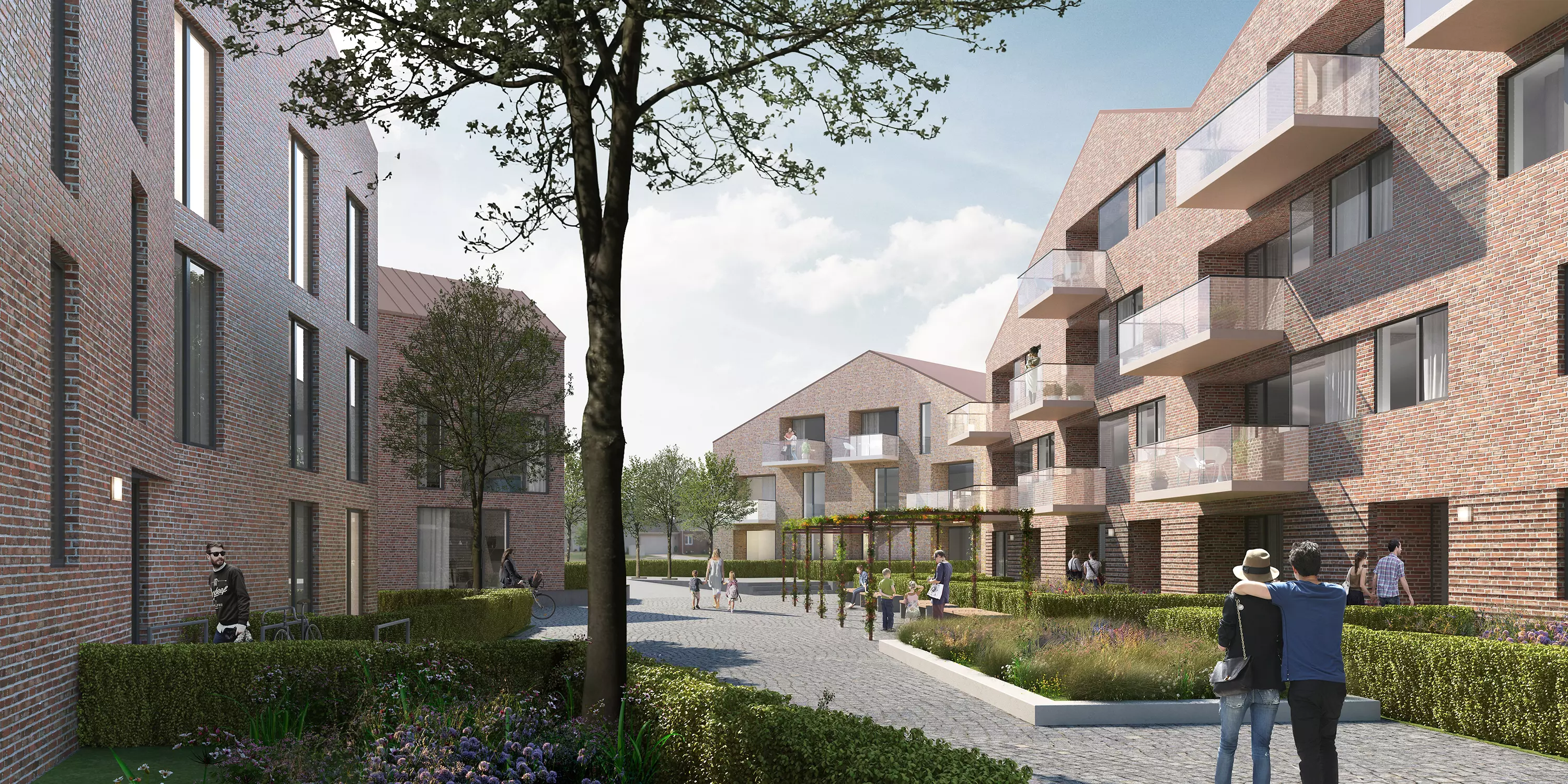 Im Inneren des Quartiers sind ca. 158 Wohnungen geplant, die eine vielfältige Mischung aus unterschiedlichen Wohnungstypen bieten. Besonderes Augenmerk liegt auf der Barrierefreiheit und Seniorengerechtigkeit der kleineren Wohnungen, die nach Bedarf auch rollstuhlgerecht umgebaut werden können. Die Schrägdachkonstruktion ermöglicht lebendige Kubaturen mit interessanten Raumhöhen und -formen in den obersten Geschossen.