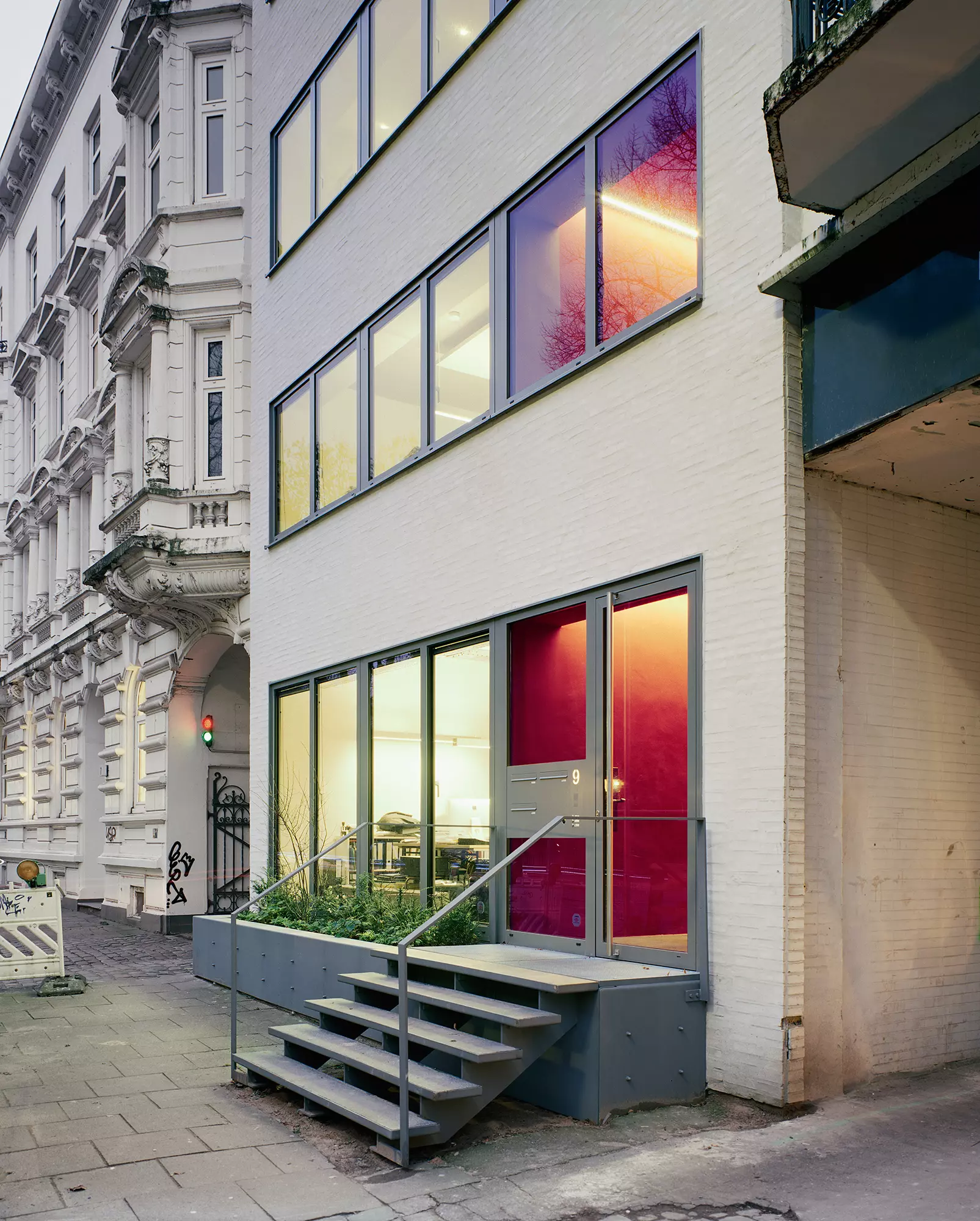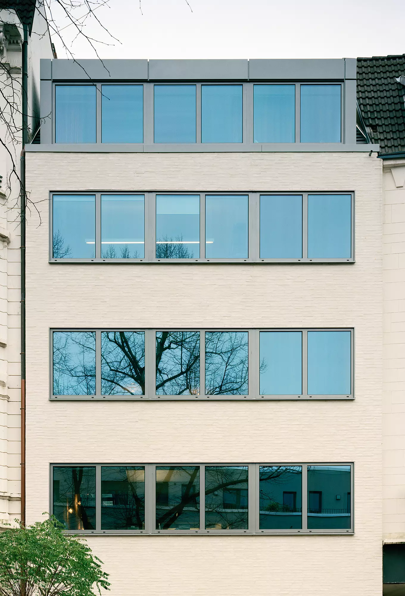 Das zwischen Gründerzeitbauten eingeschobene viergeschossige Bürogebäude mit Dach wurde 2016-17 umgebaut und aufgestockt. Ein eingeschossiger Anbau im Hof wurde um ein weiteres Geschoss erweitert, das eine gut nutzbare Dachterrasse bietet. Ein neuer Deckendurchbruch zwischen dem 1. und 2. Obergeschoss verbessert die interne Verbindung.
