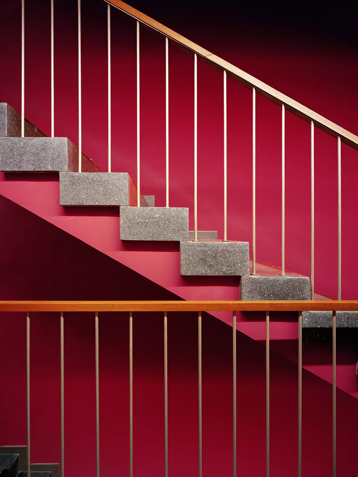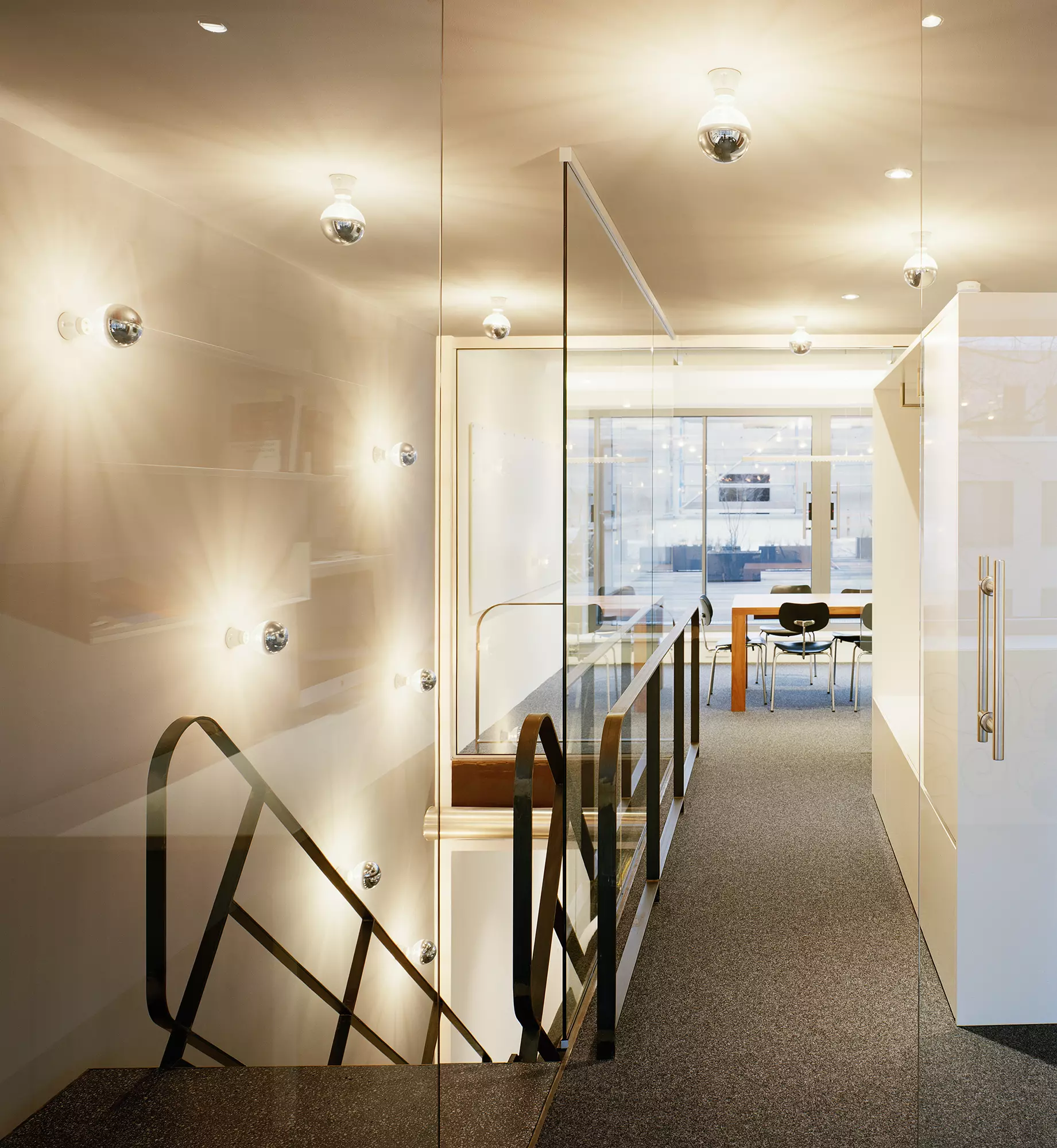 Die Bürofläche erstreckt sich über mehrere Geschosse, die durch freischwebende Innentreppen verbunden sind. Eine durchgehende Illumination der Treppenwand betont die vertikale Verbindung und schafft eine warme Lichtatmosphäre. Im Erdgeschoss befinden sich der Officebereich und ein langer Tresen, der als Kommunikationsort dient. Zwei große Arbeitsräume im Erdgeschoss und 1. Obergeschoss sowie diverse offene Zwischenräume bieten flexible Besprechungs- und Arbeitsbereiche. Das 2. Obergeschoss mit Pantry, zwei Besprechungsräumen und Dachterrasse dient als gemeinschaftlicher Meeting-Point.