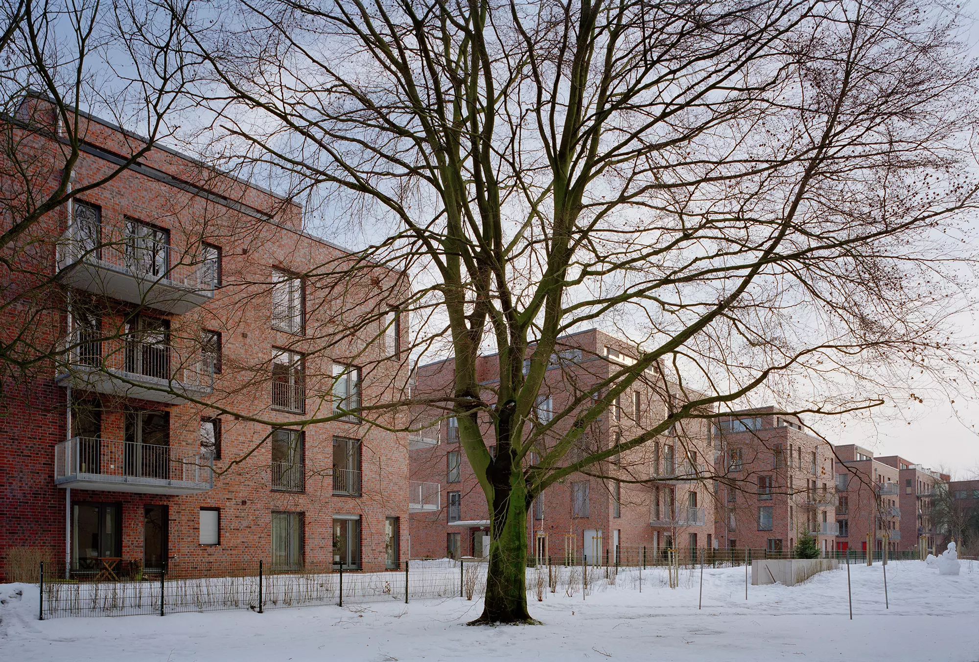Die Wohnungen verfügen über Terrassen, Balkone oder Dachterrassen mit Blick ins Grüne. Die Erdgeschosswohnungen haben kleine Gärten. Die Innenhofgestaltung ist autofrei, mit einladenden Fußwegen und Sitzbänken.