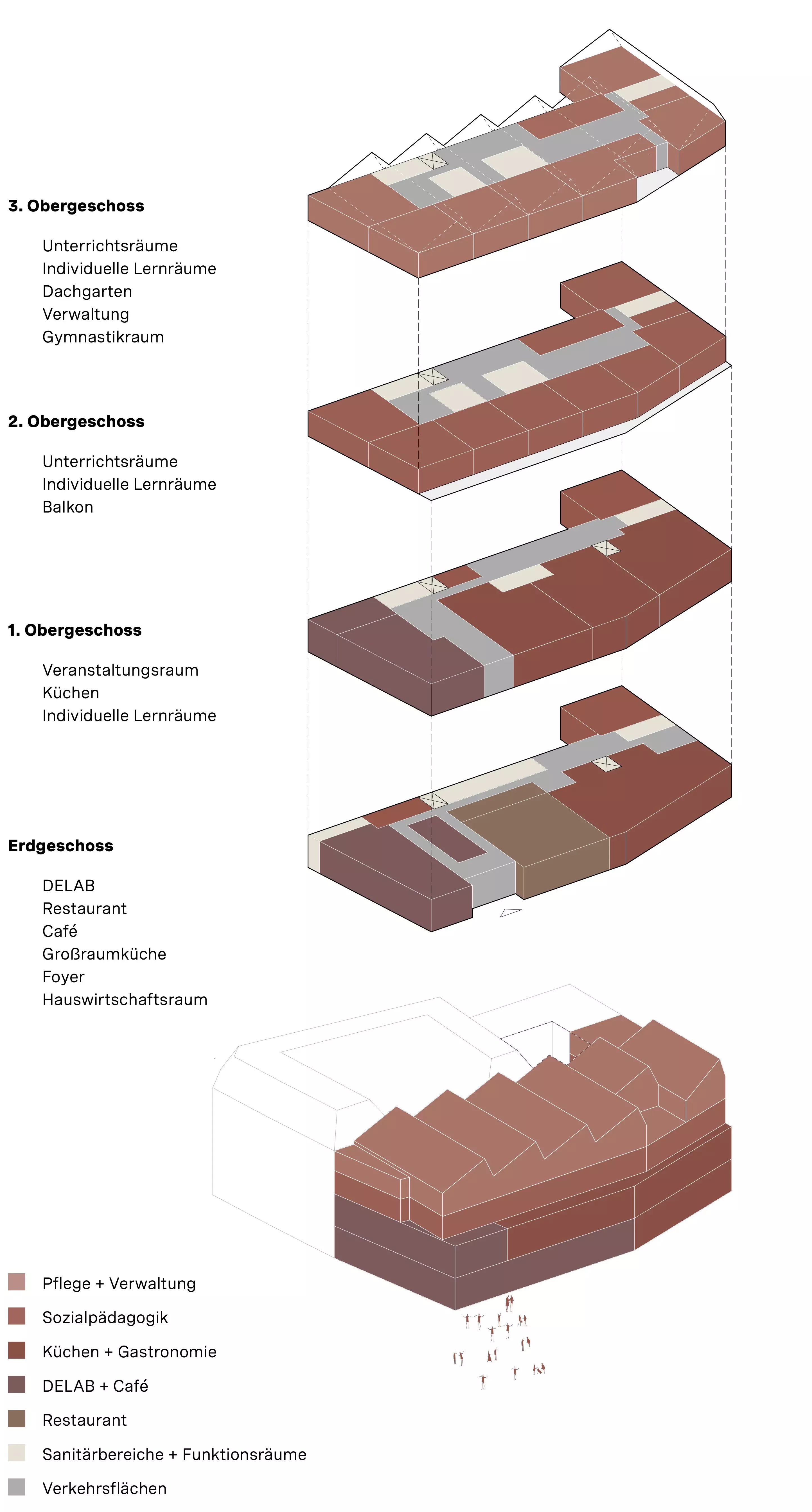 Neben Lern- und Unterrichtsbereichen entstehen öffentlich zugängliche Räume wie ein digitales Entdeckerlabor, eine Showküche für Kurse und Veranstaltungen sowie ein Veranstaltungsraum, der über eine großzügige Sitztreppe im Eingangsbereich erschlossen wird. Im obersten Geschoss lädt ein Gymnastik- und Yogaraum mit Ausblick auf die Stadtkirche zur Nutzung ein.