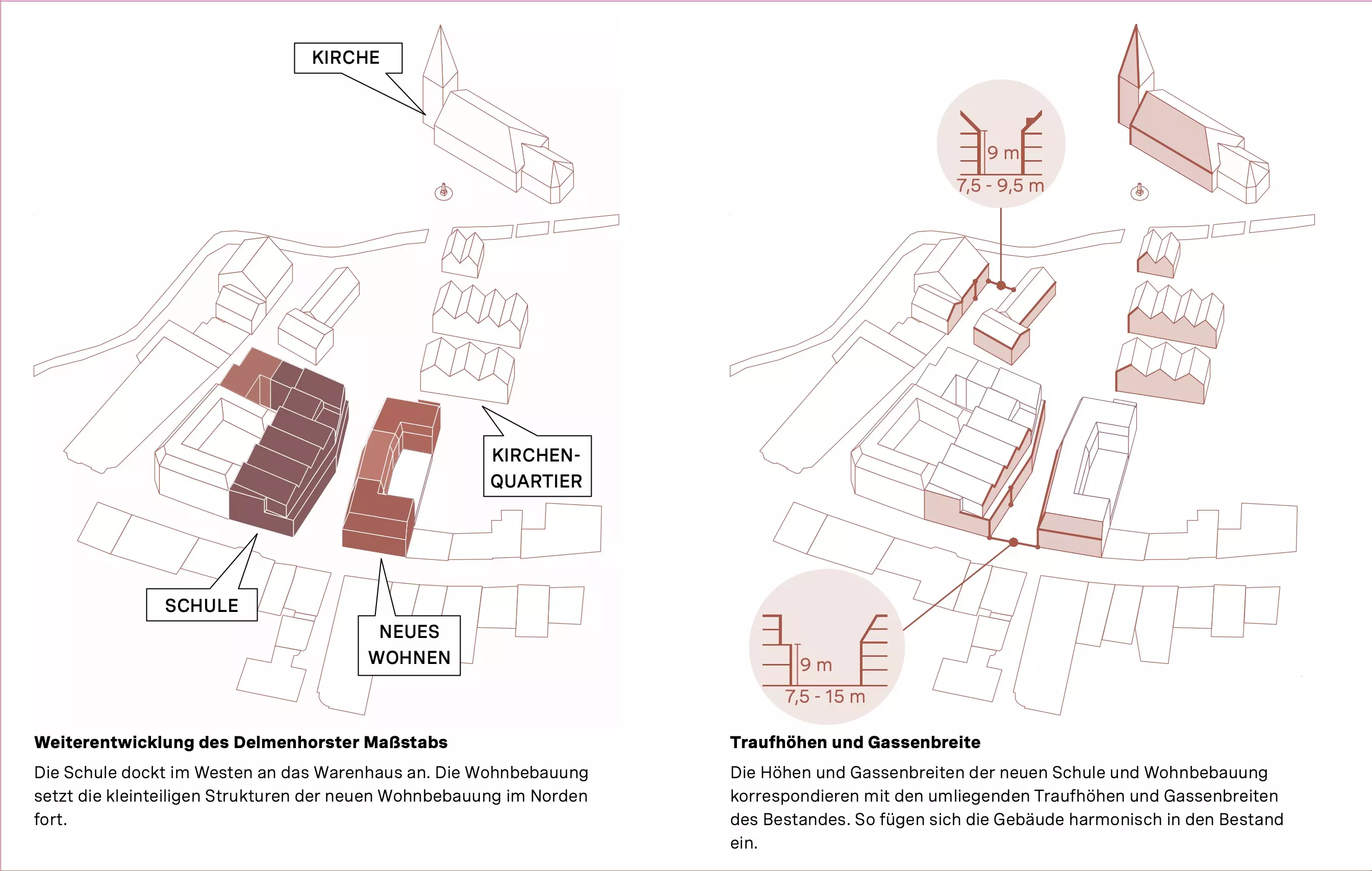 Das städtebauliche Konzept orientiert sich bewusst an der gewachsenen Struktur der Delmenhorster Altstadt. Charakteristische Elemente wie Gassen, Traufhöhen und die Maßstäblichkeit historischer Gebäude werden aufgenommen und in zeitgemäßer Form weitergeführt.