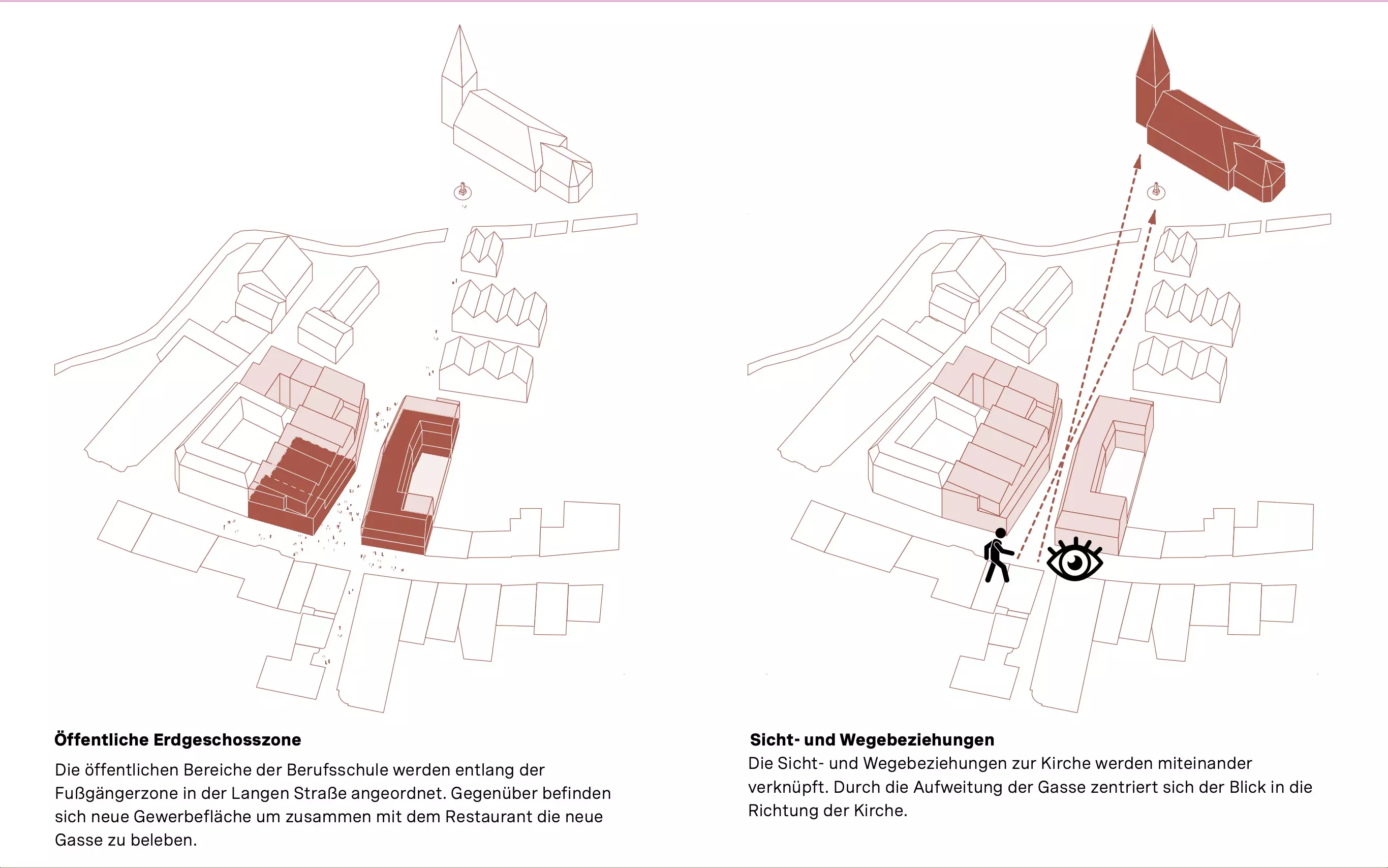 Ein besonderer Schwerpunkt liegt auf der Sicht- und Wegebeziehung zur Stadtkirche zur Heilige Dreifaltigkeit. Durch die beidseitige trichterförmige Aufweitung der neuen Gasse entstehen zwei platzartige Situationen: zur Langen Straße hin öffnet sich der Raum einladend in Richtung Kirchenquartier, zur Bebelstraße hin markiert die Aufweitung einen städtebaulichen Übergang und lädt zum Eintreten ins Quartier ein.