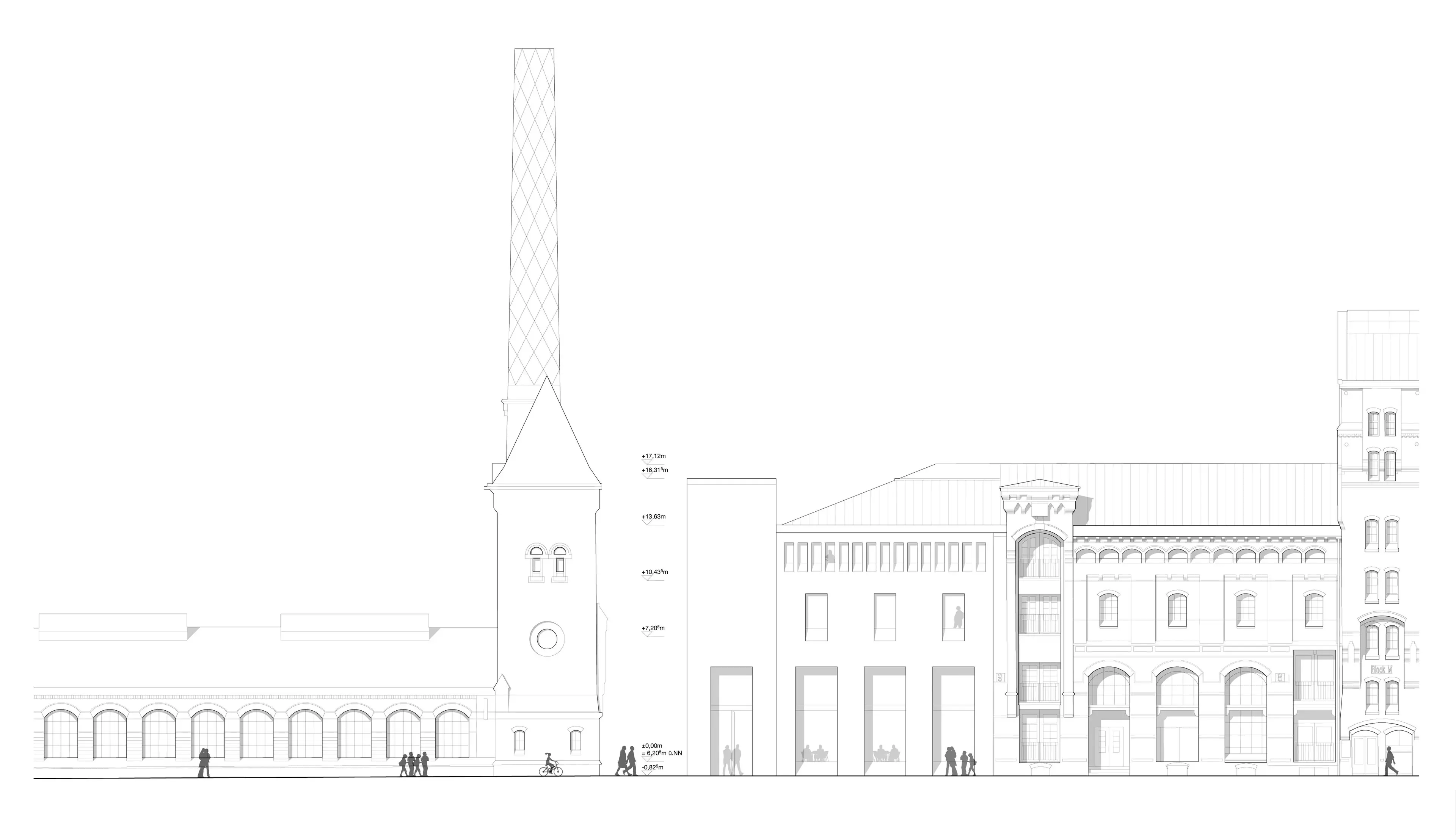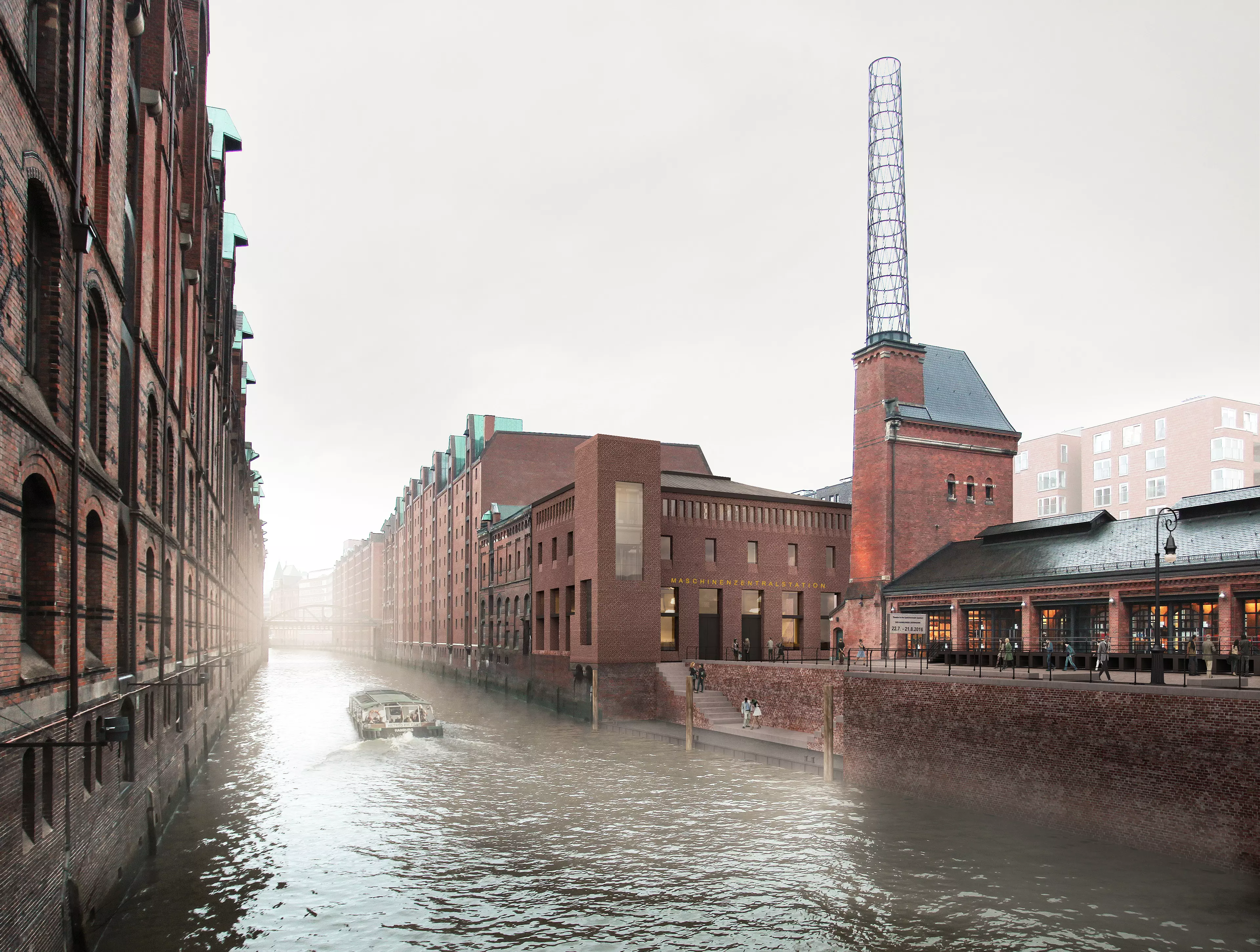 Als architektonische Hommage an die Geschichte schafft der neue Turm ein harmonisches Zusammenspiel mit dem benachbarten Kesselhaus und prägt den neu gestalteten Platz nördlich davon. Der Platz zwischen Fleet und Kesselhaus wird neu gestaltet, der historische Fleetanleger wiederbelebt. Der Haupteingang des Neubaus definiert zusätzlich die Ostseite des Platzes. Die Platzgestaltung orientiert sich an den historischen Vorgaben und schafft eine einladende Atmosphäre für die öffentlichen Nutzungen. Die Fassaden des Neubaus nehmen die vertikalen Fensterformate der Speicherstadt auf und schaffen eine harmonische Verbindung zum Altbau. Die tragenden Bauteile des Neubaus folgen dem bewährten Konstruktionsprinzip des Bestandes, wodurch eine plastische Ähnlichkeit entsteht. Ein Lichtatrium verbindet Alt- und Neubau und sorgt für eine optimale Belichtung aller Geschosse. Im Erdgeschoss entsteht ein Veranstaltungs- und Gastronomiebereich, der die Atmosphäre der ehemaligen Maschinenhalle aufgreift. Ein Hochwasserschutz im Untergeschoss sowie Brandschutzmaßnahmen gewährleisten die Sicherheit des Gebäudes. Die wirtschaftliche Bauweise des Neubaus ermöglicht eine kostengünstige Ergänzung des Bestandes und schafft in den Obergeschossen hochwertige Büronutzungen.