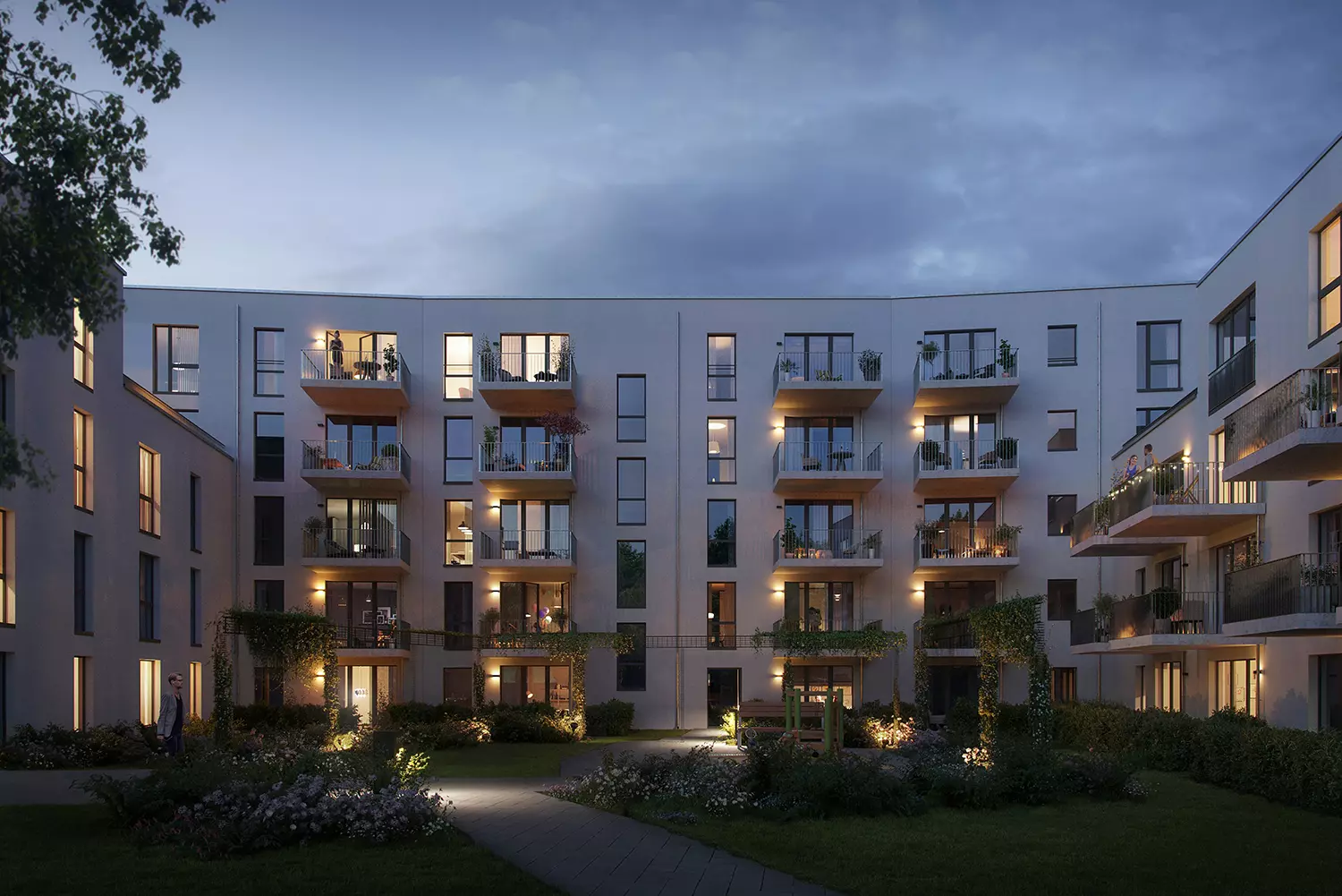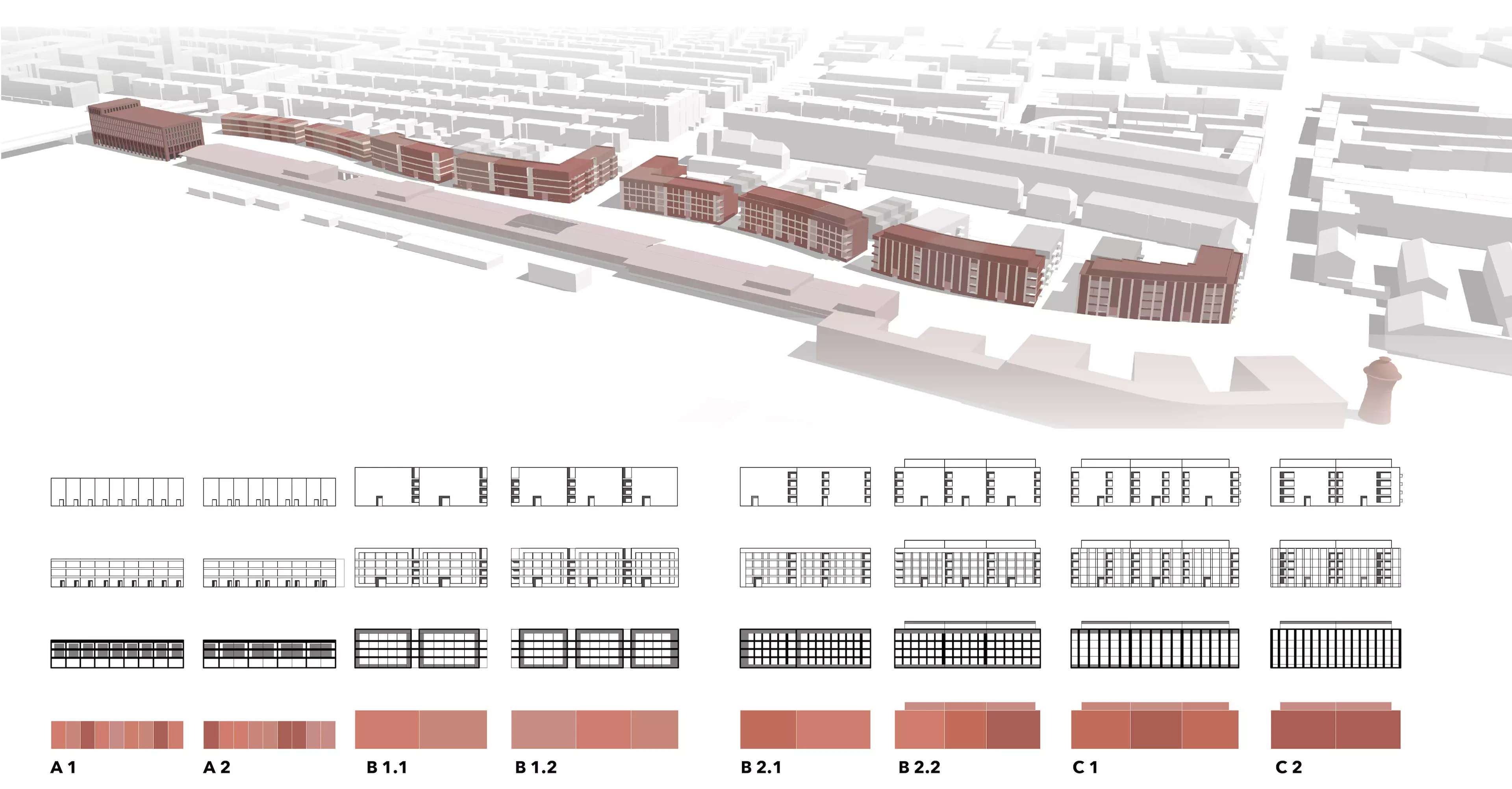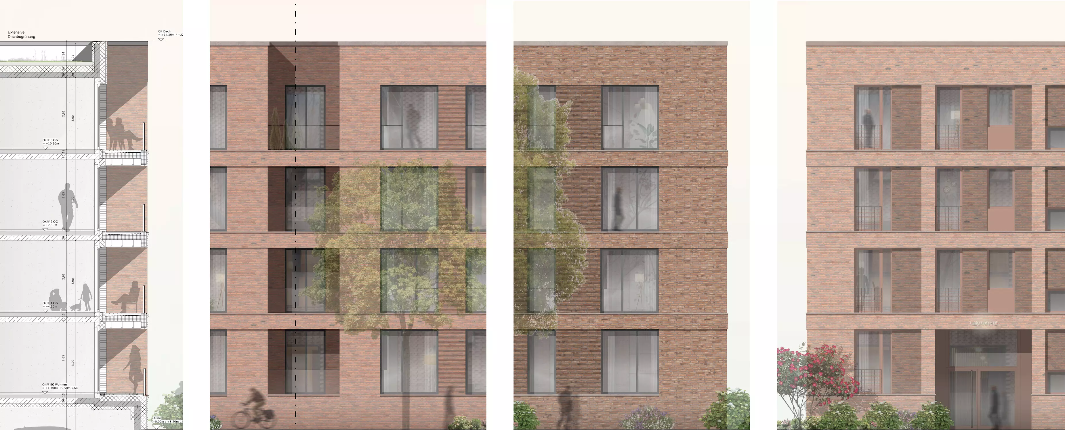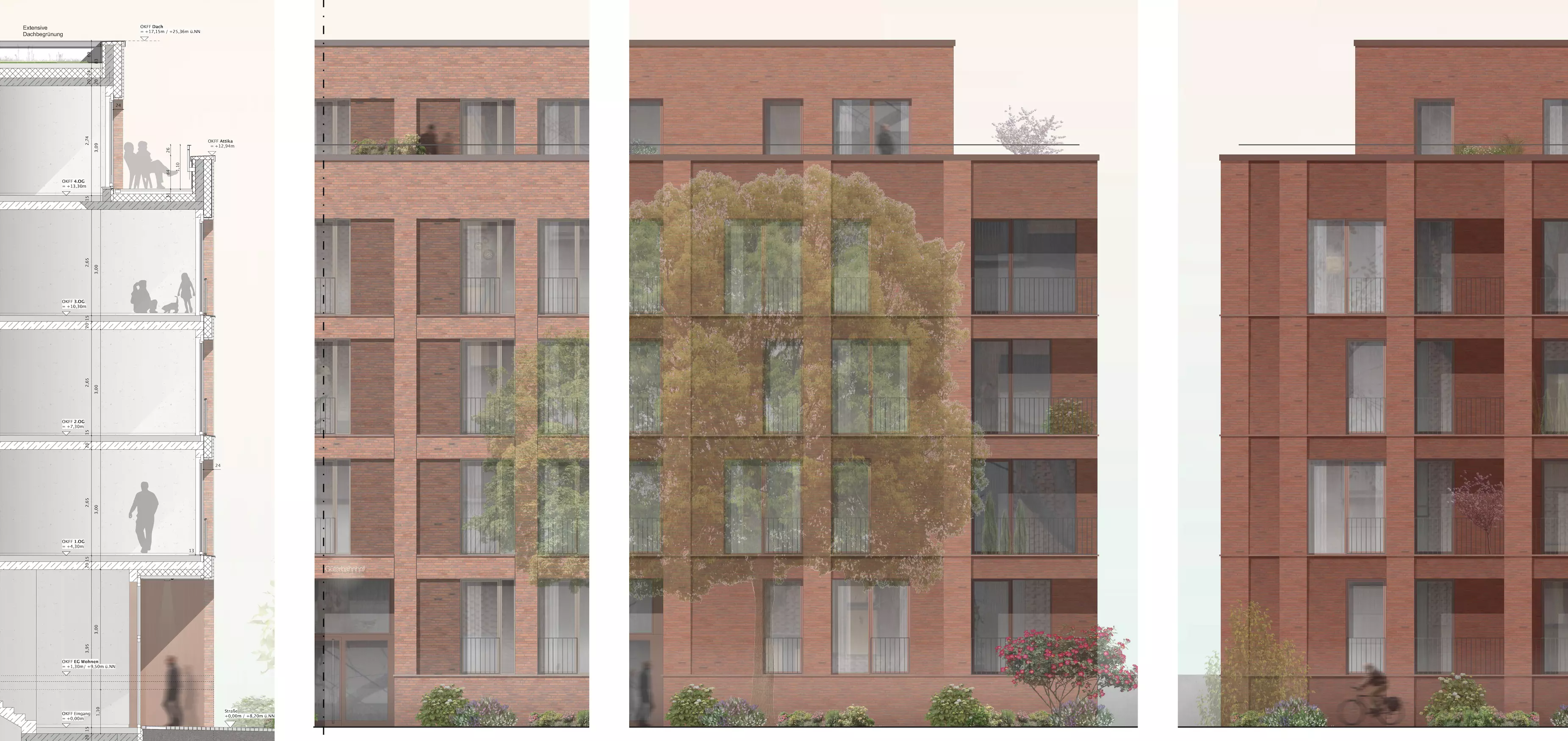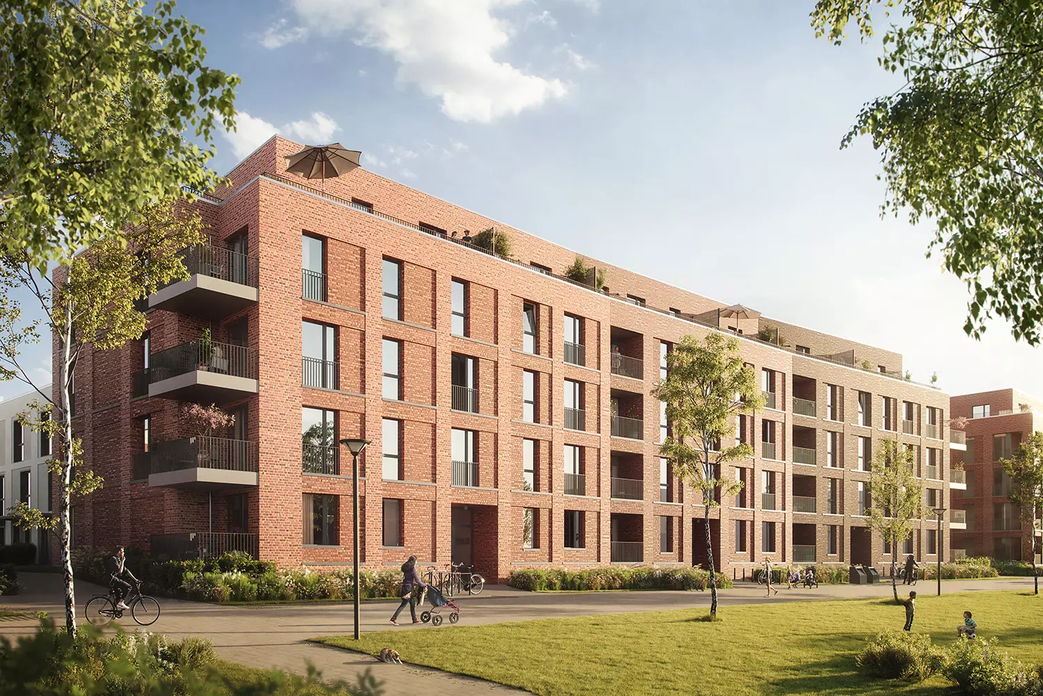 Wohnbebauung im Süden: Hier entstehen 339 Wohneinheiten in zwei Gebäudetypen: eine rot geklinkerte Häuserzeile mit drei bis vier Geschossen und ein Staffelgeschoss sowie weiß verputzte Gebäude mit Stadthäusern. Alle Wohnungen verfügen über Terrassen, Balkone oder Loggien.