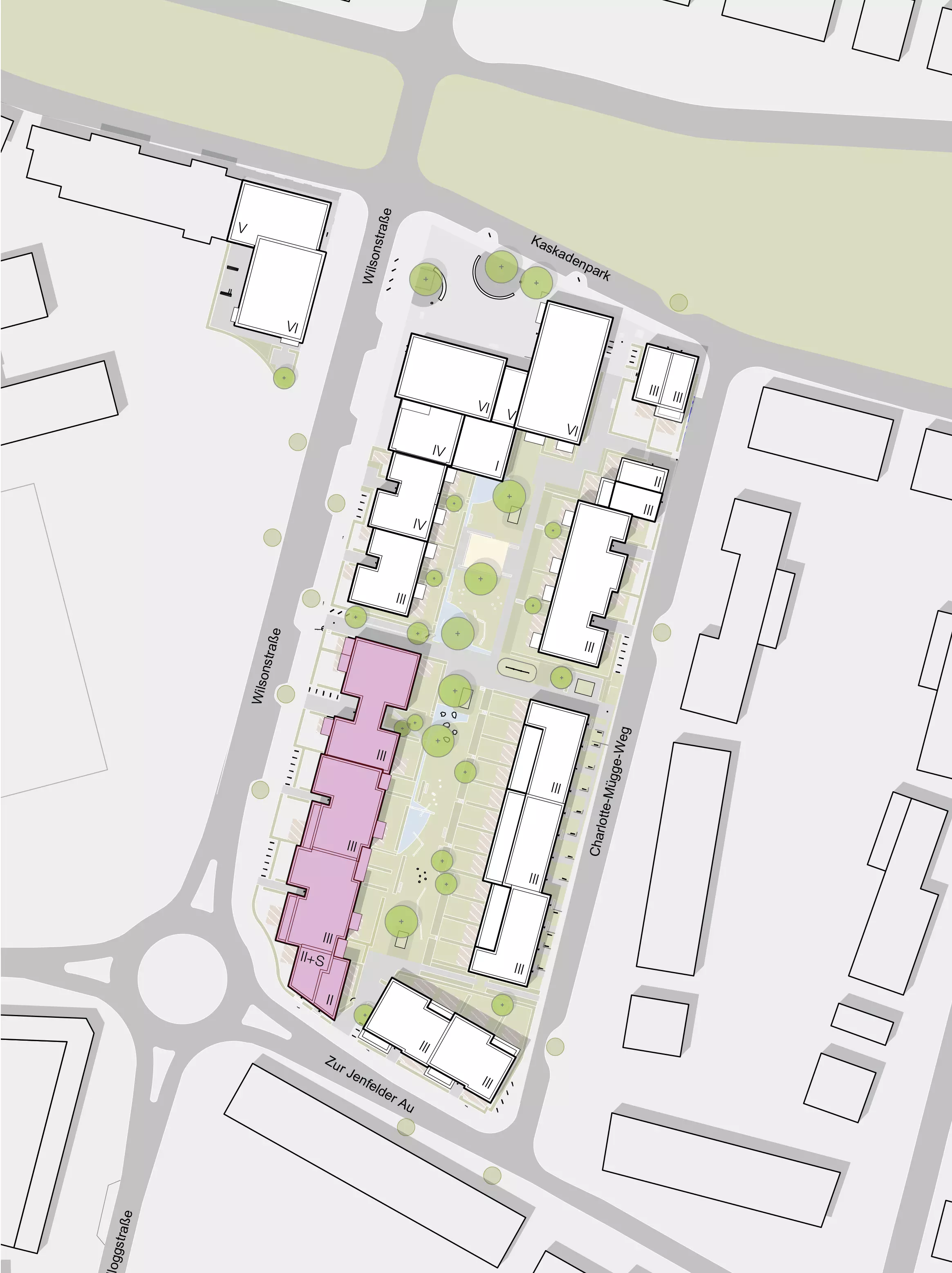 Die Lage inmitten eines grünen Quartiers mit über 1.200 Wohneinheiten bietet eine ideale Umgebung für urbanes Wohnen im Einklang mit der Natur. Das städtebauliche Konzept sieht eine abwechslungsreiche Bebauung mit urbanen Stadthäusern vor, die ein vielfältiges und lebendiges Stadtbild schaffen. Die zentrale Grünachse mit einem neu angelegten Teich bildet dabei das Herzstück des Viertels und bietet höchste Aufenthaltsqualität für die Bewohner.