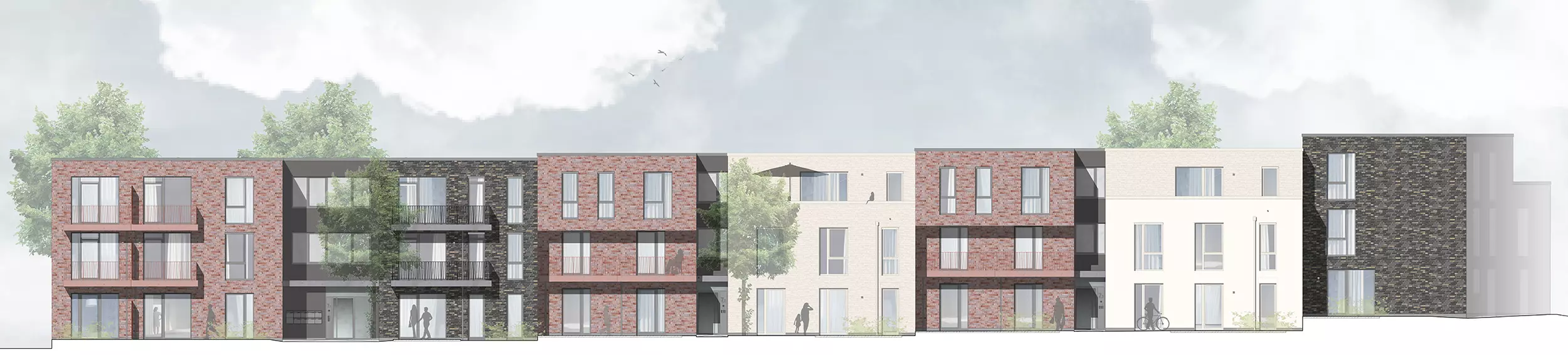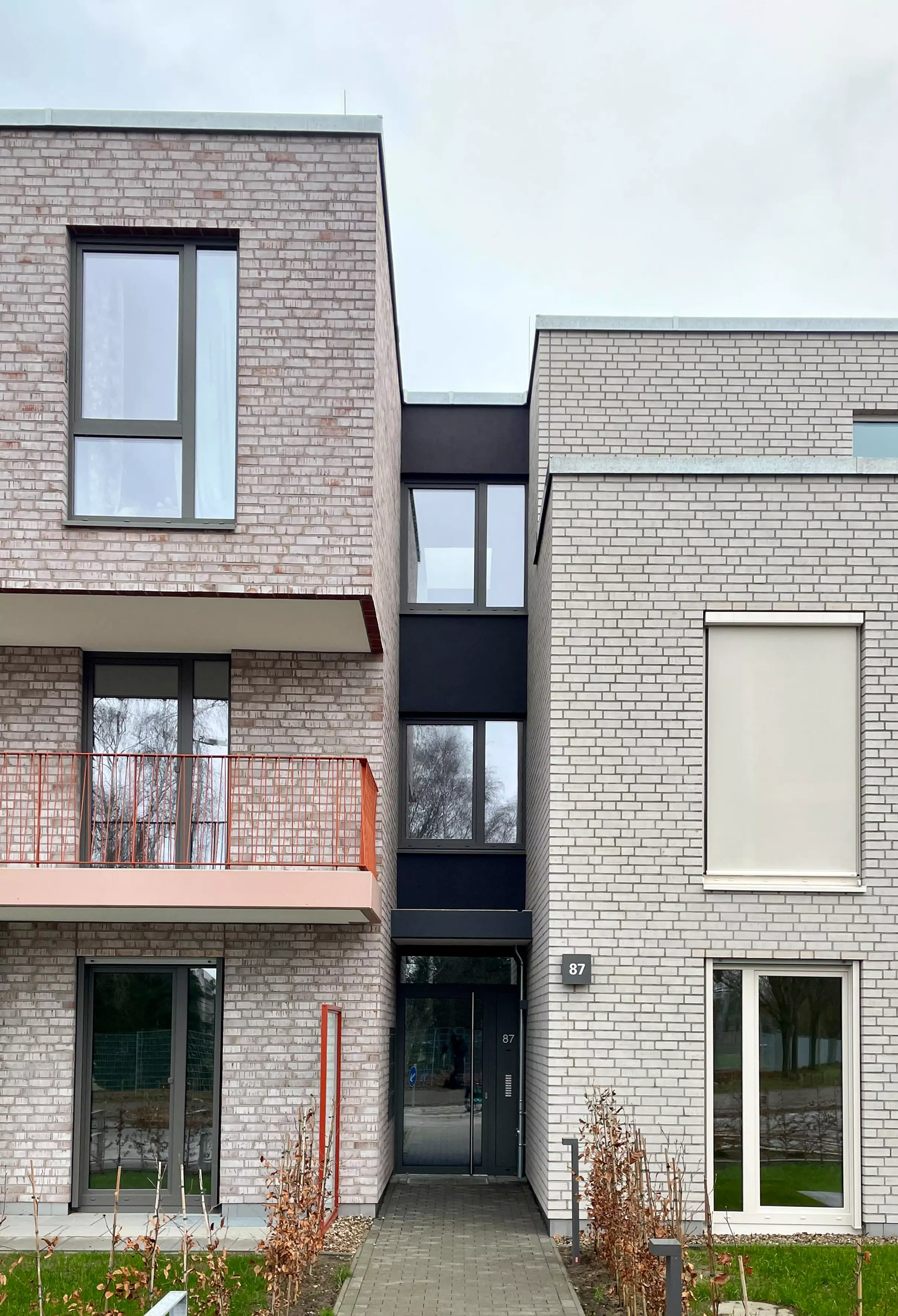 Die Straßenfassaden zeichnen sich durch ihre Plastizität und Vielfalt aus. Durch Gebäudeeinschnitte und zurückversetzte Eingangsbereiche entsteht eine lebendige Fassadengestaltung, die den Eindruck einzelner, aneinandergereihter Baukörper vermittelt. Die Verwendung von Verbundmauerwerk und Putzflächen in einem abgestimmten Farbkanon verleiht der Fassade eine ansprechende Optik und trägt zur Gesamtharmonie des Gebäudes bei.