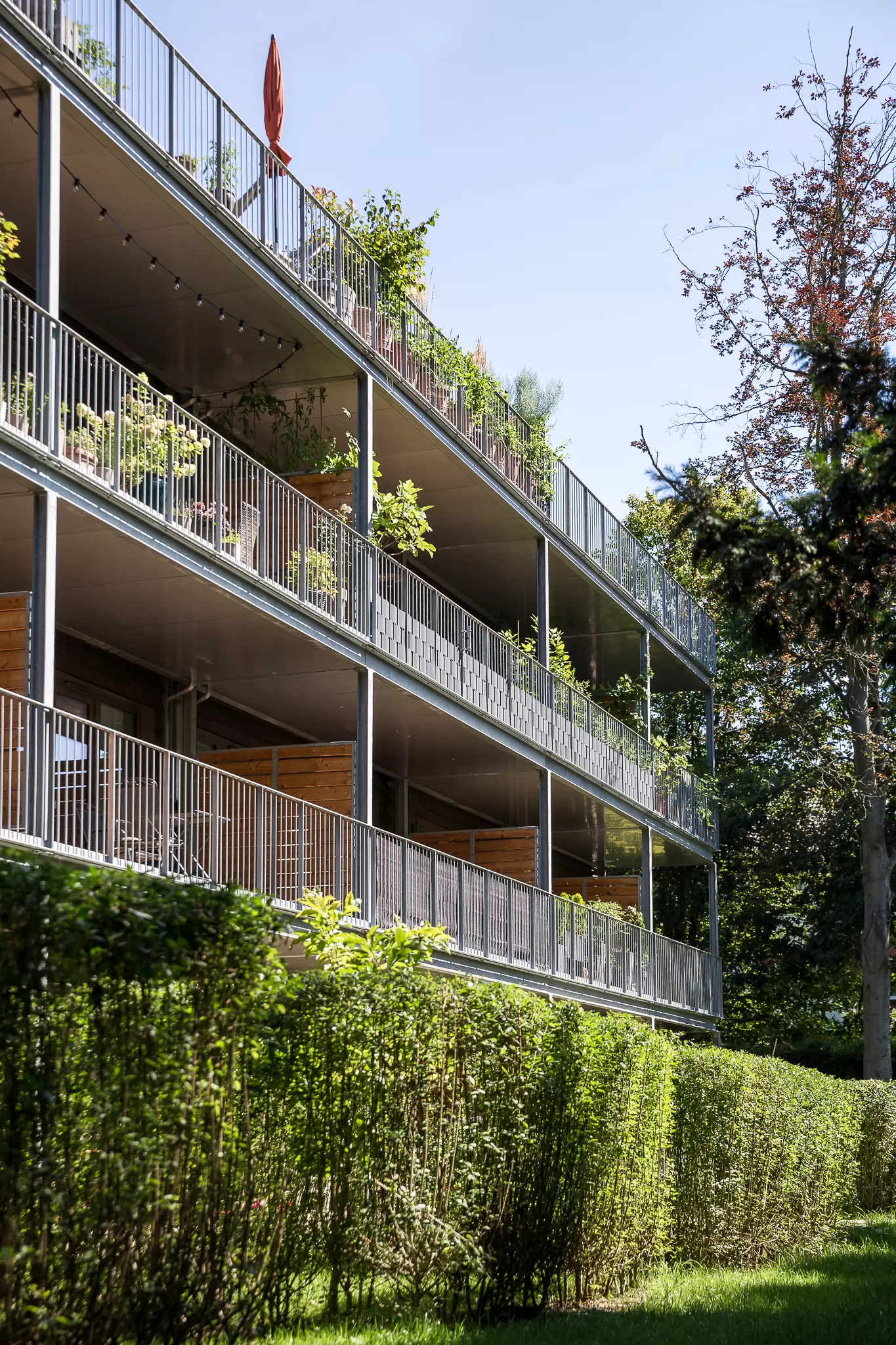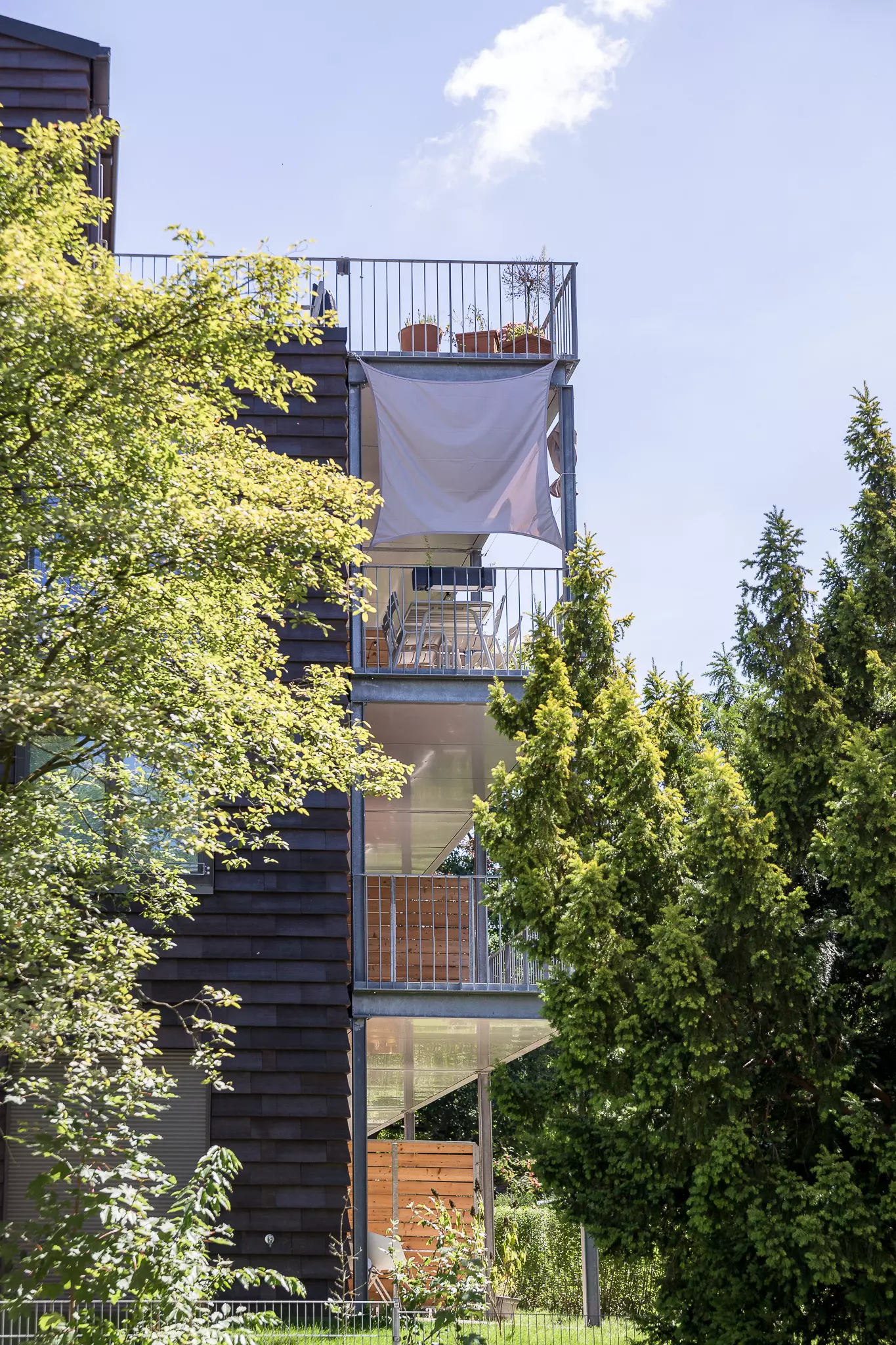 Der Neubau mit 16 lichtdurchfluteten Eigentumswohnungen ist ost-westlich ausgerichtet und öffnet sich mit großzügigen Freisitzen und Terrassen zum ruhigen Garten hin. Geplant wurde mit ebenso viel Weitsicht wie ökologischem Anspruch: Hochwertige Tonschindeln aus 50 Prozent recyceltem Klinker zieren die Hauswand. Die speziell angefertigte, dunkelgraue Fassade ist nicht nur ressourcenschonend, sondern eine innovative und zeitgemäße Alternative zum CO2-intensiven oder gar umweltschädlichen Fassadensystem.