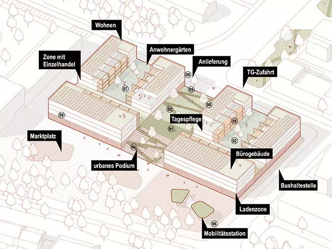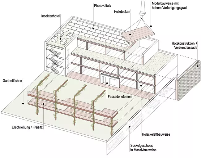 Das Erschließungskonzept sorgt für eine barrierefreie Zugänglichkeit der Wohnungen und bietet vielfältige Freiraumebenen durch Terrassierungen und Rampen. Zudem wird eine nachhaltige Bauweise mit Holz-Hybridbau und Materialien aus natürlichen, gesunden Baustoffen angestrebt.