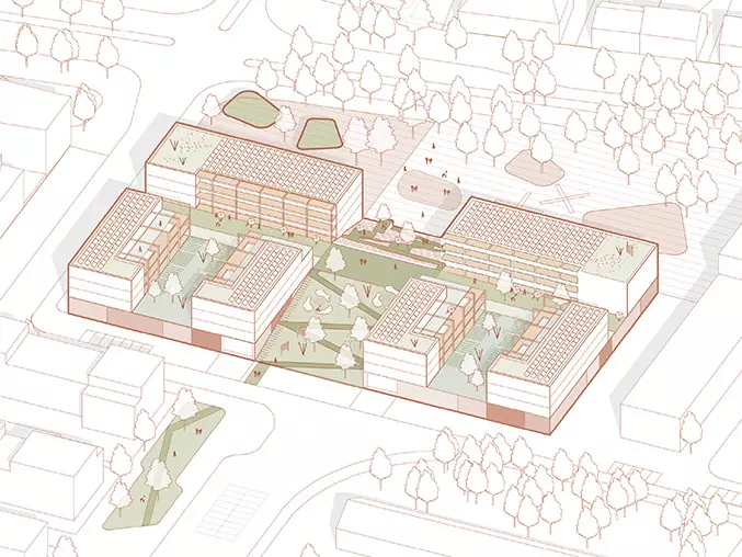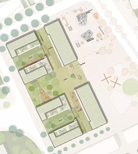 Besonderes Augenmerk liegt auf der thematischen Belebung der Freiräume, die neben Sport- und Kinderspielflächen auch landschaftliche und urbane Zonen umfassen. Ziel ist es, eine erlebbare Verbindung zwischen den Bereichen zu schaffen und Begegnungszonen für die Bewohner zu schaffen.