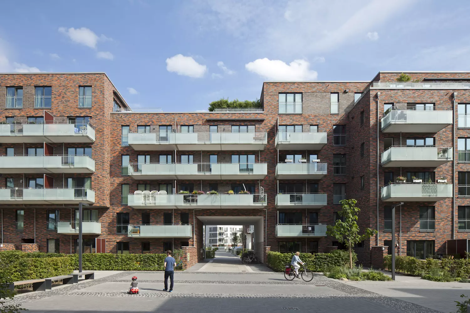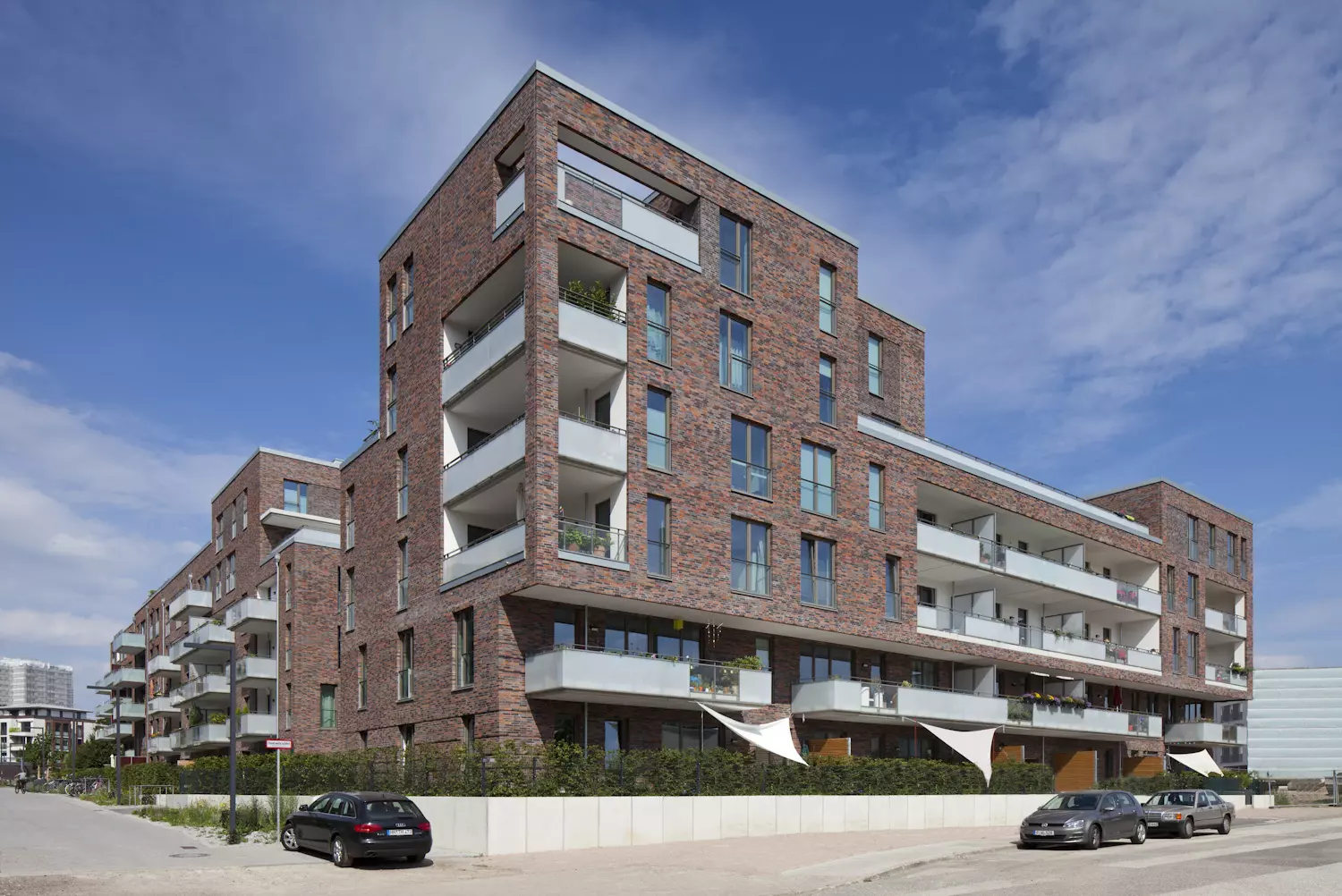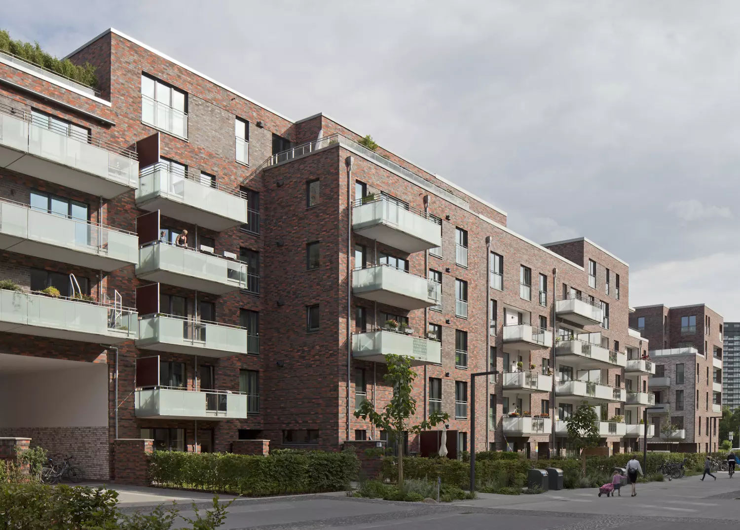 Im Eingangsbereich des neuen Wohnquartiers „Othmarscher Höfe“ bilden die Wohnhäuser den Auftakt der neuen „Grünen Mitte“ mit familiengerechten Wohneinheiten im Geschoßwohnungsbau.