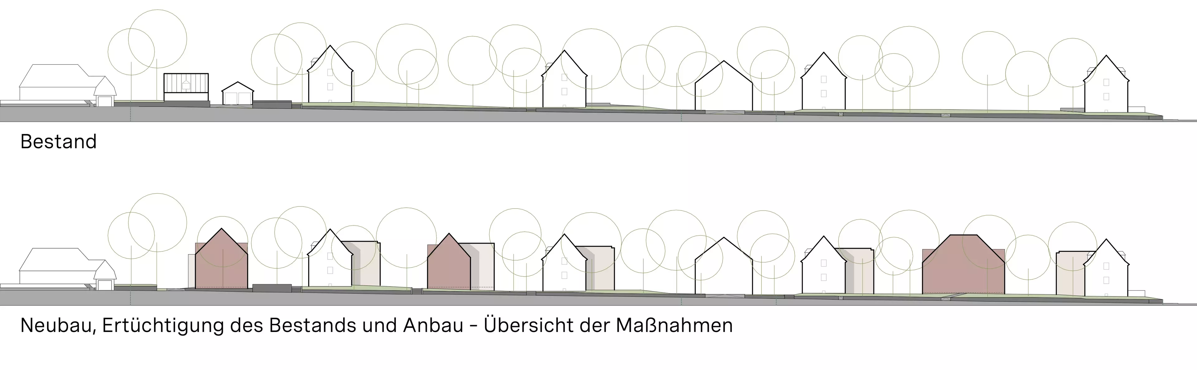 Die charakteristische Silhouette entlang der Tietzestraße bleibt beibehalten, indem Anbauten und Ergänzungen an den Bestandsgebäuden von den Giebeln abgerückt werden. Da die Grundstücke nur gering bebaut sind, haben wir Flächen identifiziert, auf denen moderat Gebäude ergänzt werden können. Zwei Neubauten werden vorgeschlagen, die sich in ihren Maßen, Proportionen und ihrer Geschossigkeit am Charakter des Bestands orientieren und notwendige barrierefreie Wohnungsangebote schaffen.