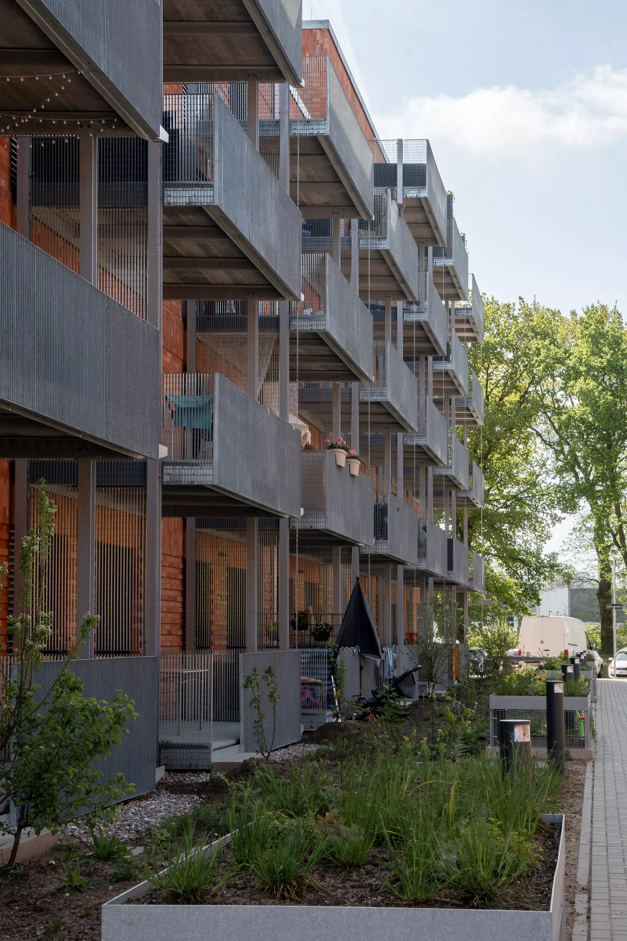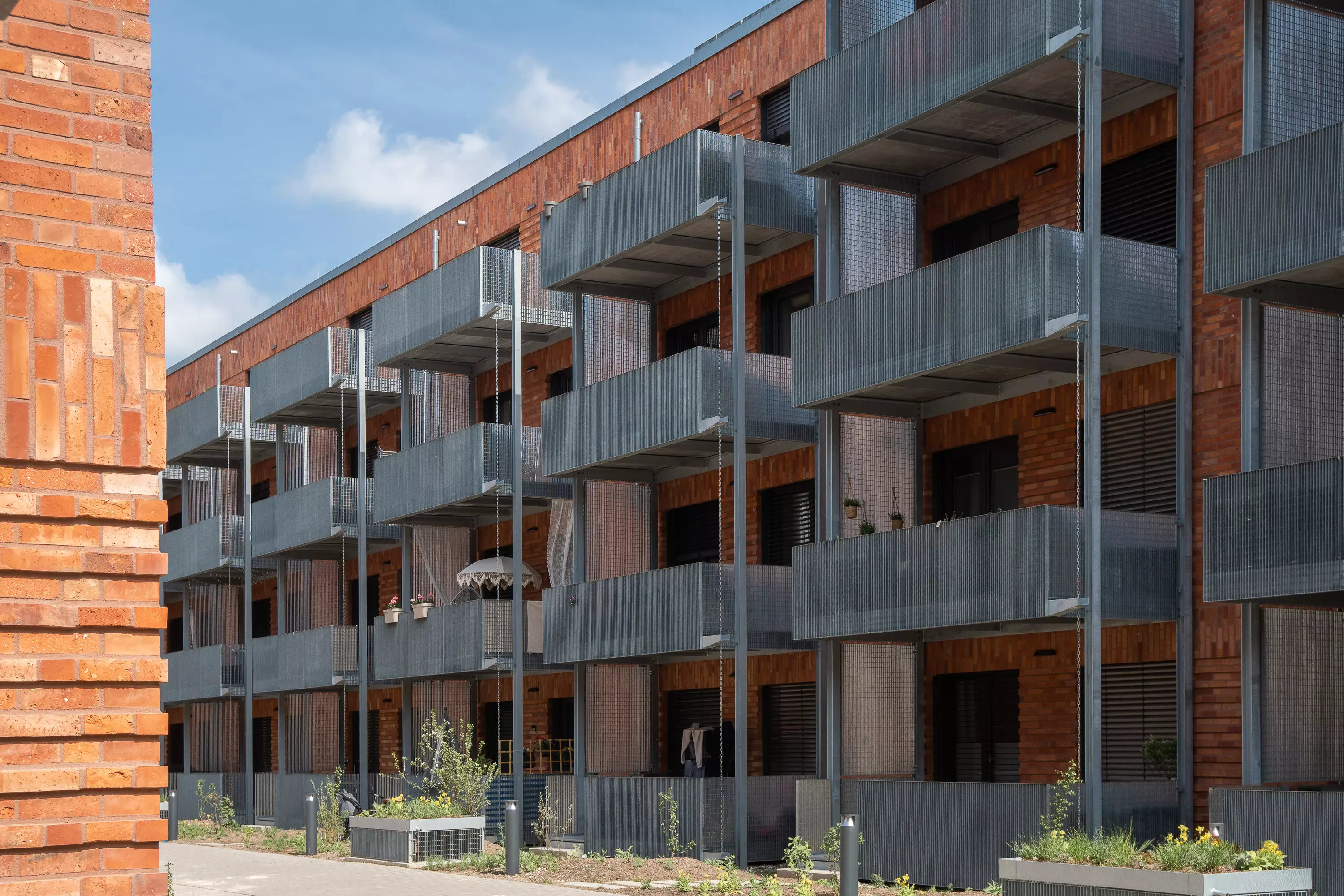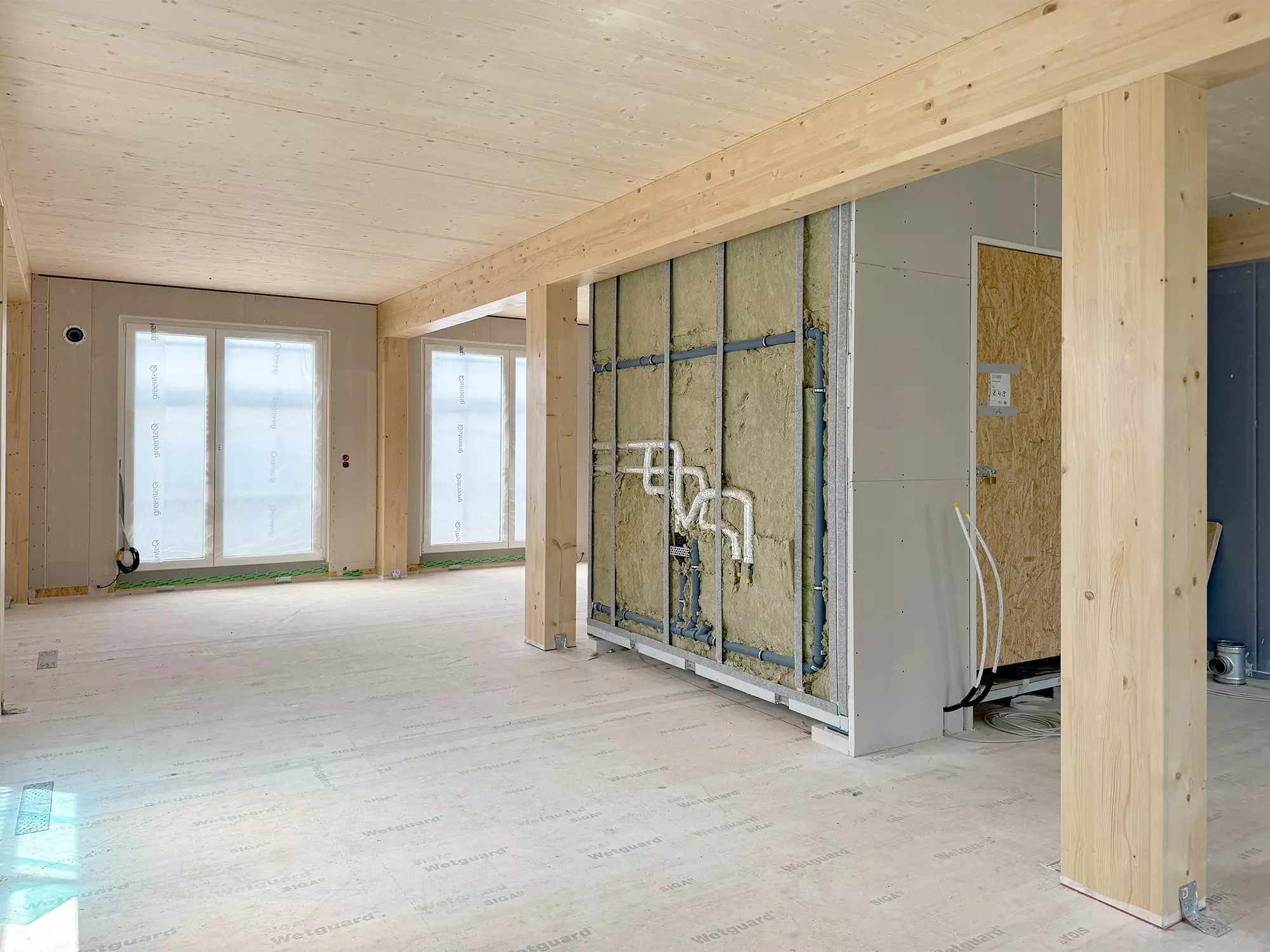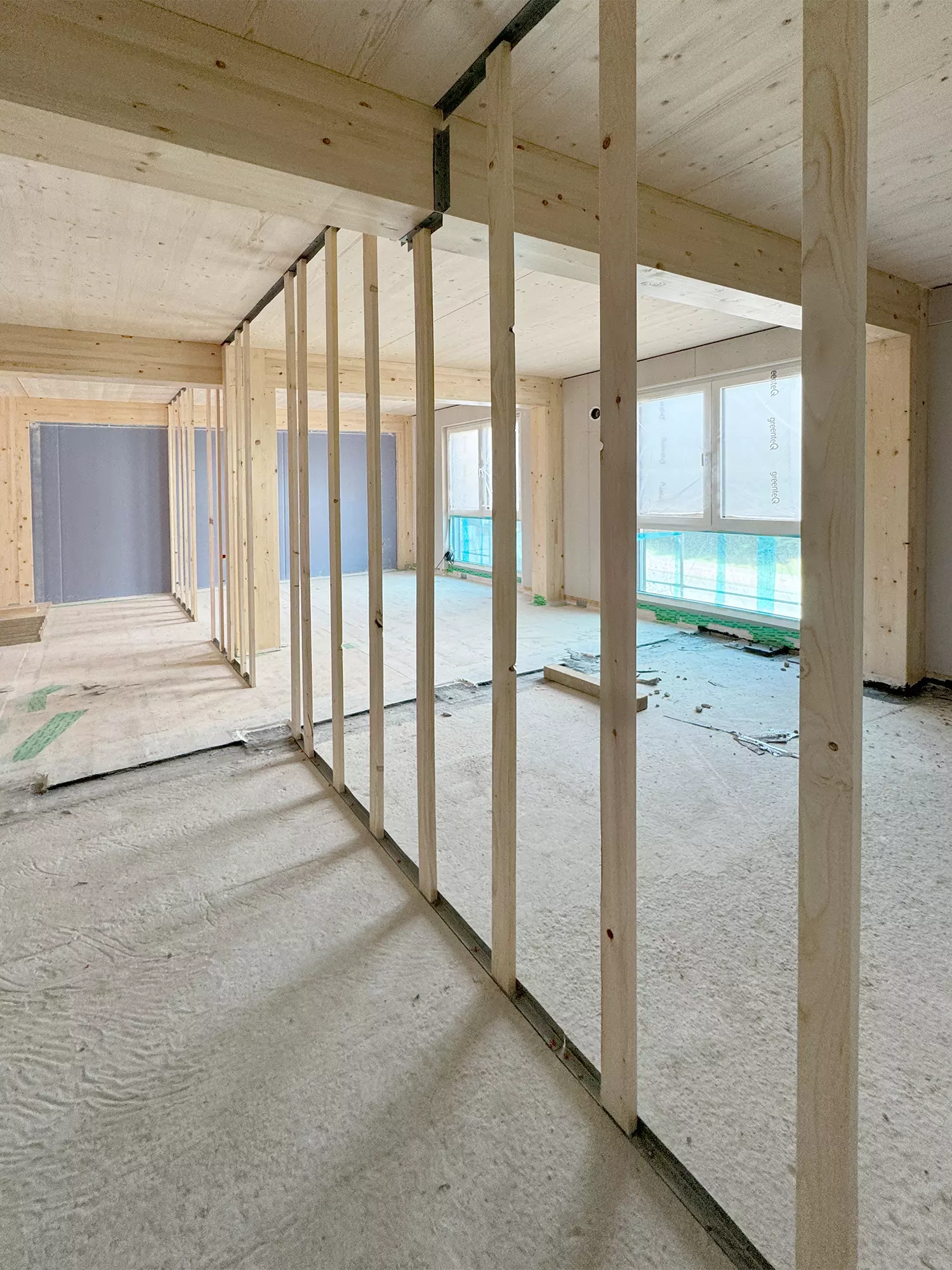 Die Wohnbereiche wurden nahezu vollständig in Holz errichtet, lediglich Untergeschosse und Treppenhäuser bestehen aus Beton. Für Außen- und Wohnungstrennwände kamen vorgefertigte Holzrahmenelemente mit Zellulosedämmung zum Einsatz. Der Innenausbau verzichtet auf klassische Gipskartonplatten – stattdessen kamen Strohbauplatten zum Einsatz: komprimiertes Stroh, frei von chemischen Bindemitteln, wärmedämmend und vollständig rückbaubar.