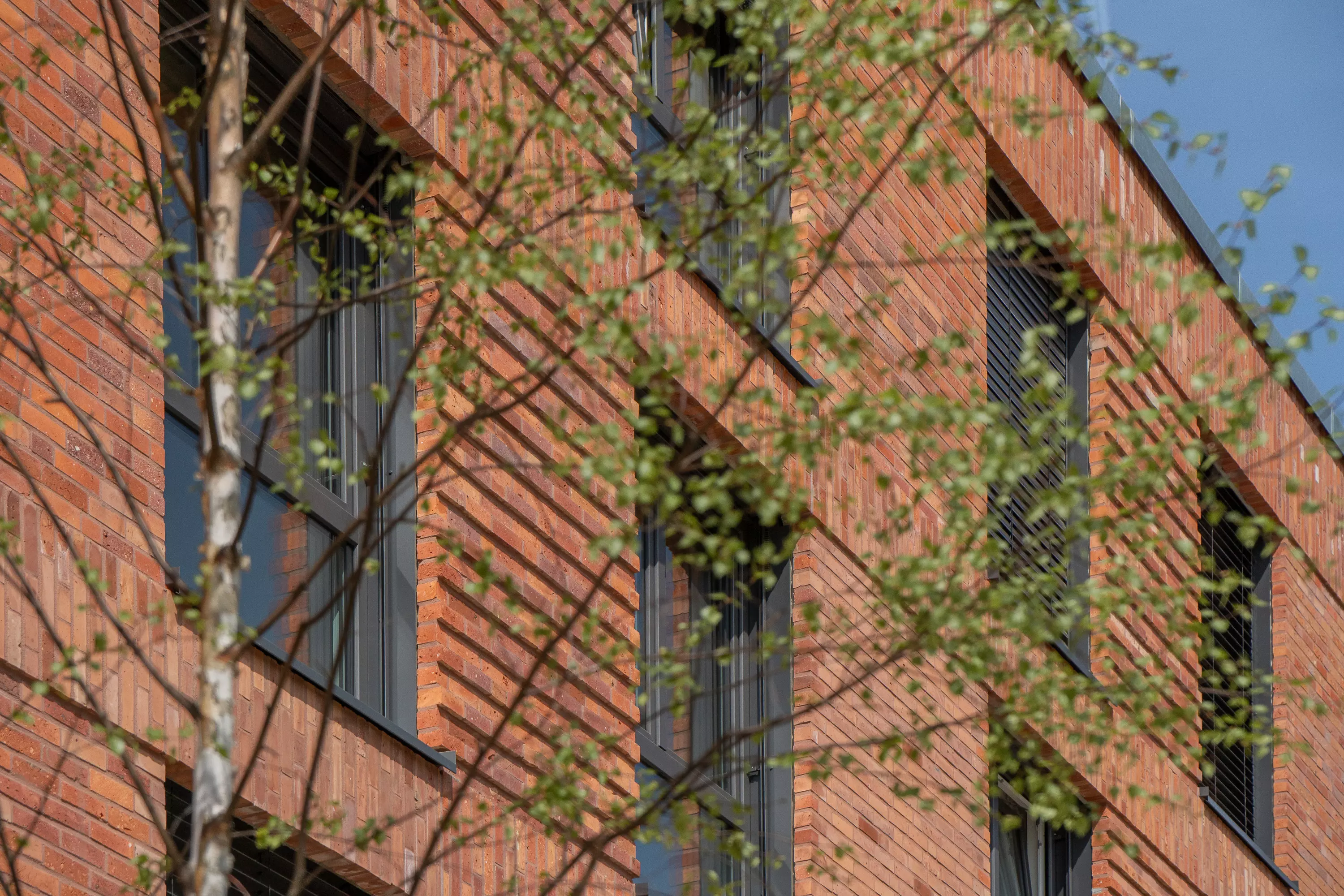 Die Fassade besteht aus sortierten und wiederverwendeten Klinkern aus Rückbauprojekten – ressourcenschonend, dauerhaft und ästhetisch hochwertig. Die Elemente sind so konstruiert, dass sie reversibel verbaut und später erneut verwendet werden können.