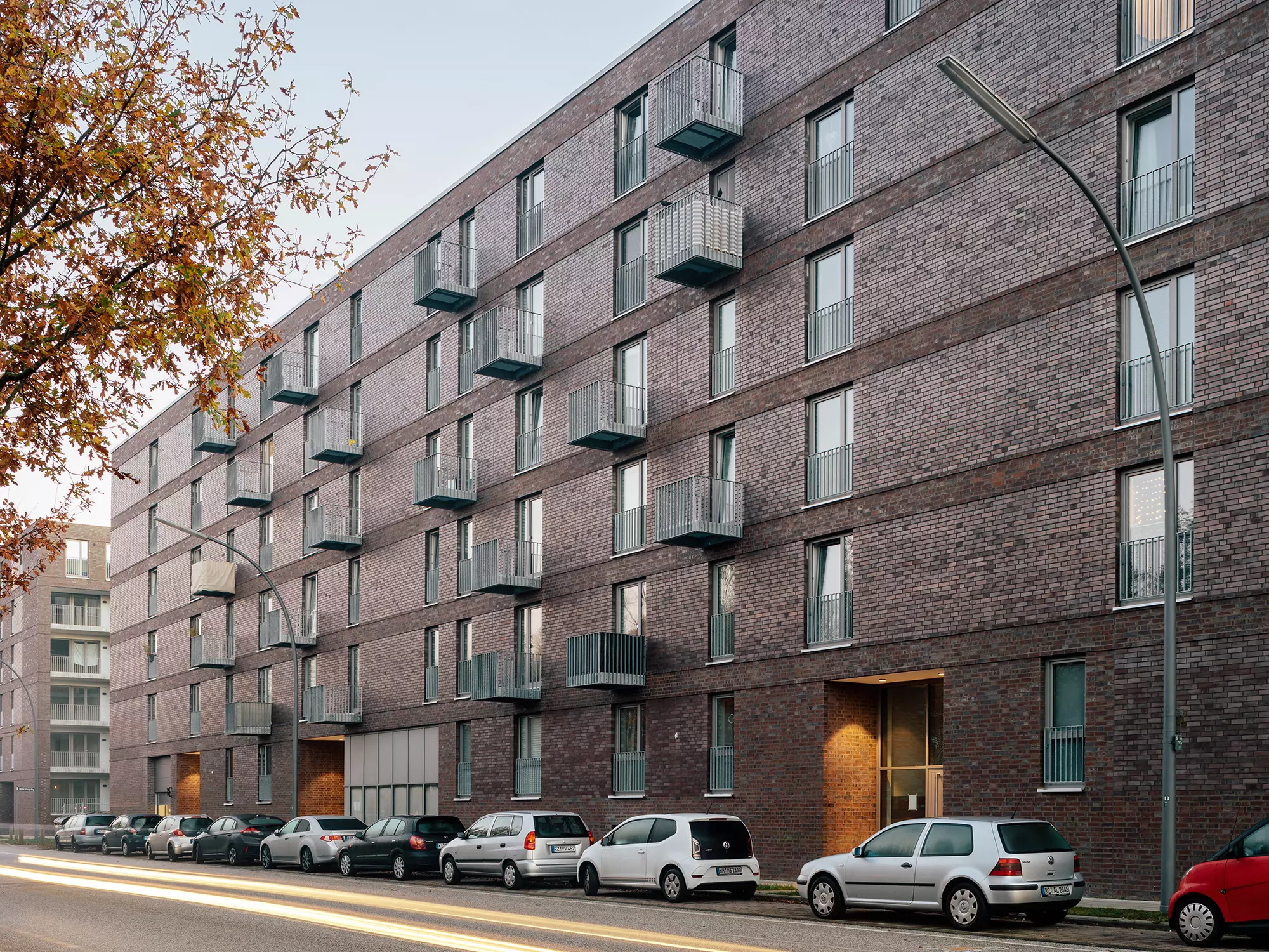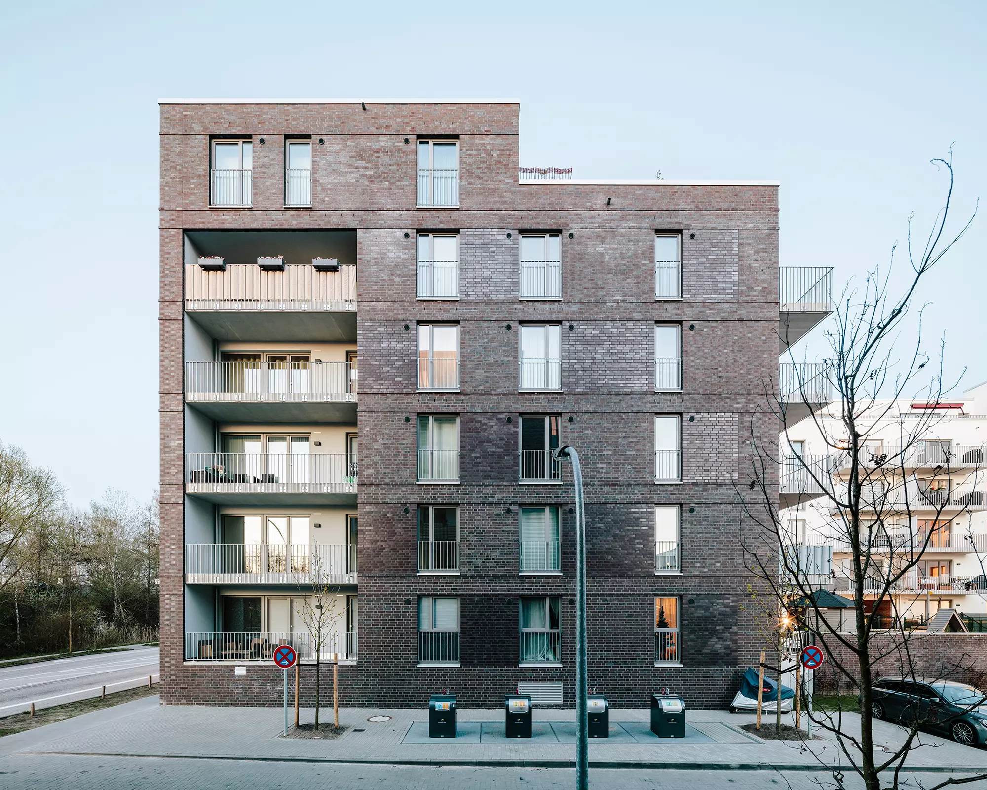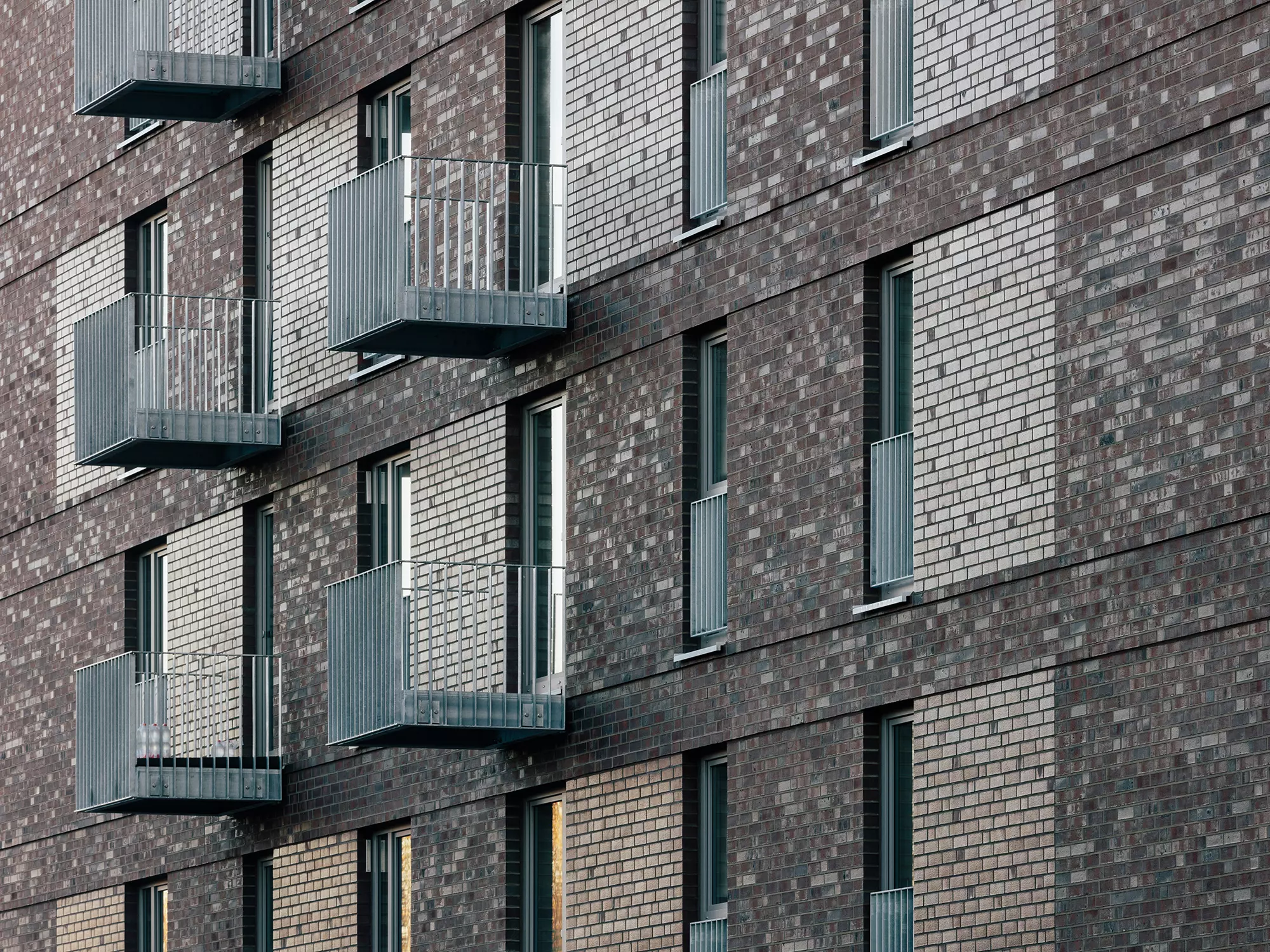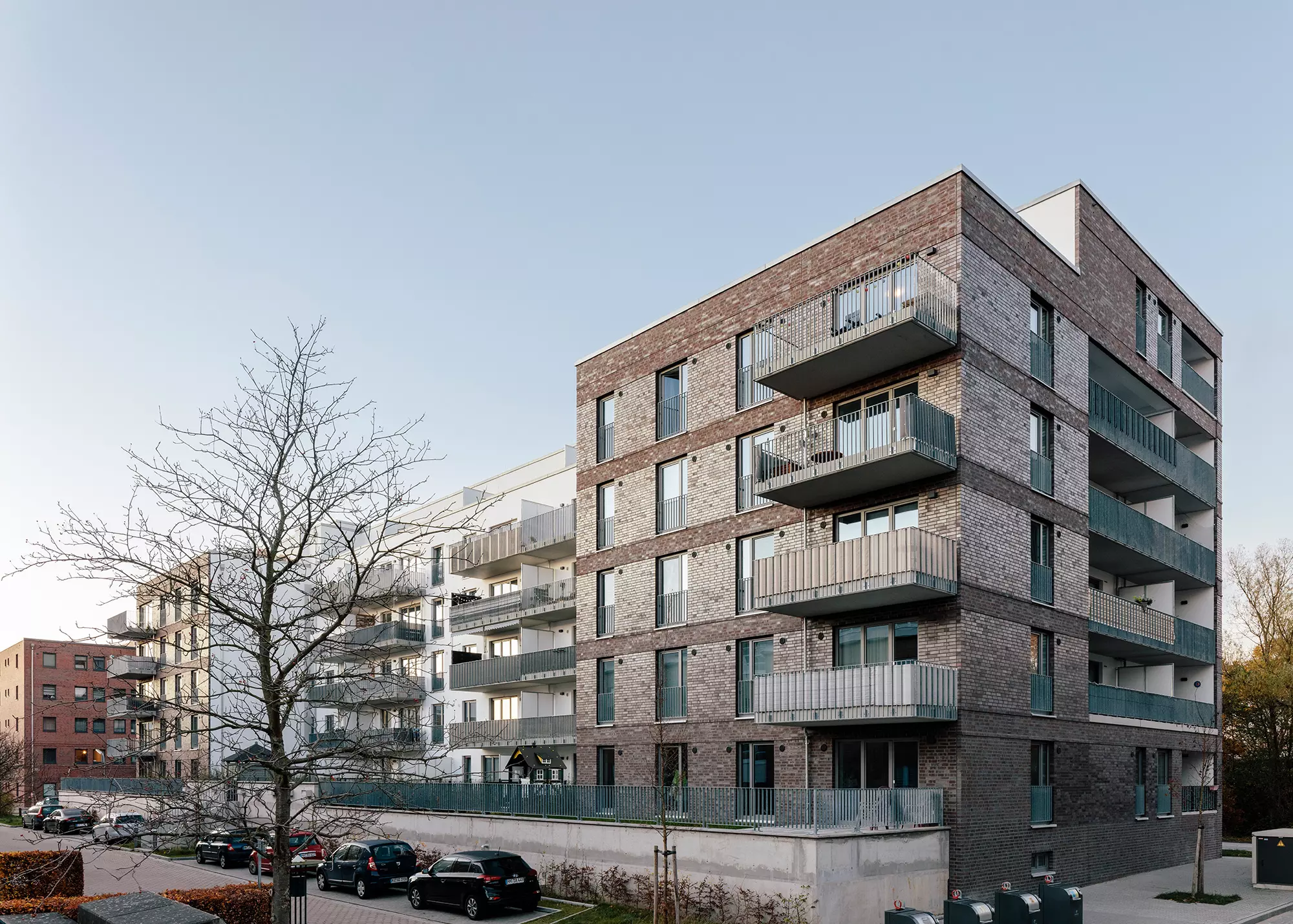 Die Fassaden entlang der Bahntrasse sind bewusst geschlossen gehalten, um den Lärm zu minimieren. Gleichzeitig wird der Blockrand durch Köpfe zur Hofseite und aufgeweitete Giebelseiten gestärkt. Stählerne Fluchtbalkone lockern die Klinkerfassaden auf und schaffen ein rhythmisiertes Bild. Reliefartige Gesimsbänder gliedern die Fassaden horizontal und setzen Kontraste zu den Fensterformaten. Die zurückgezogenen Freisitze an den Giebelseiten sind als elegante Loggien gestaltet. Die einheitlich auberginefarbenen Klinkerfassaden verleihen den Gebäuden ein einheitliches Erscheinungsbild als Ensemble, wobei unterschiedliche Glanzgrade der Verblendsortierung je nach Lichteinfall und Sonnenstand für spannende Kontraste sorgen.