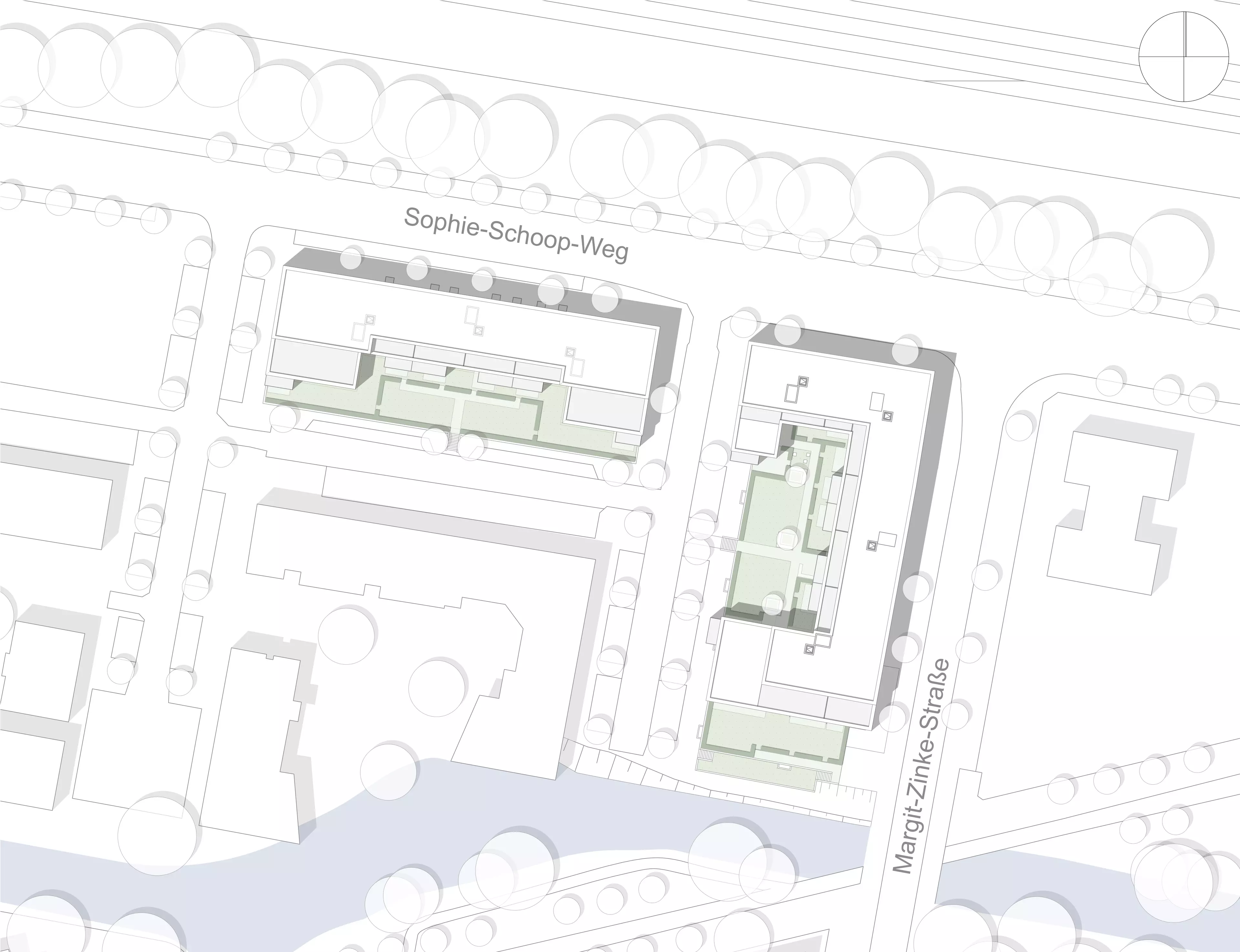 Das Projekt zeichnet sich durch seine klare Positionierung entlang der Bahntrasse aus, wodurch ein markanter Block entsteht. Trotz der potenziellen Belastung durch Lärmemissionen zeigt es auf beeindruckende Weise, dass hochwertiger und zeitgemäßer Wohnungsbau auch in herausfordernden urbanen Umgebungen möglich ist. Die neuen Gebäude dienen nicht nur als Schutz vor Lärm, sondern werten auch die umgebenden Bestandsbauten auf und schaffen ruhige Freiflächen auf der Südseite und im Hofbereich des Ensembles. Die Erhöhung des Erdgeschosslevels ermöglicht nicht nur eine effiziente Nutzung der Tiefgarage, sondern schafft auch private Bereiche im Erdgeschoss sowie in den Freiflächen.