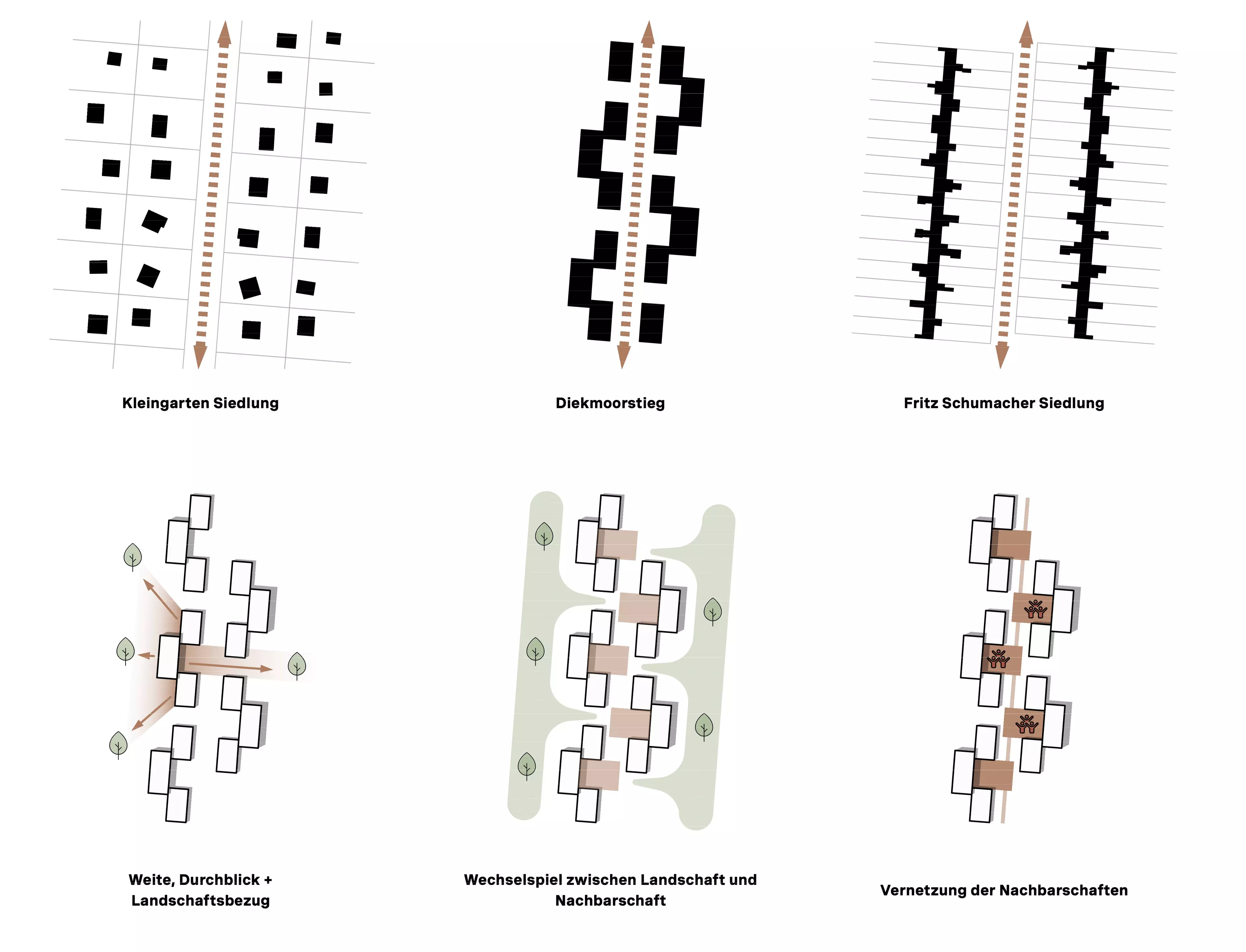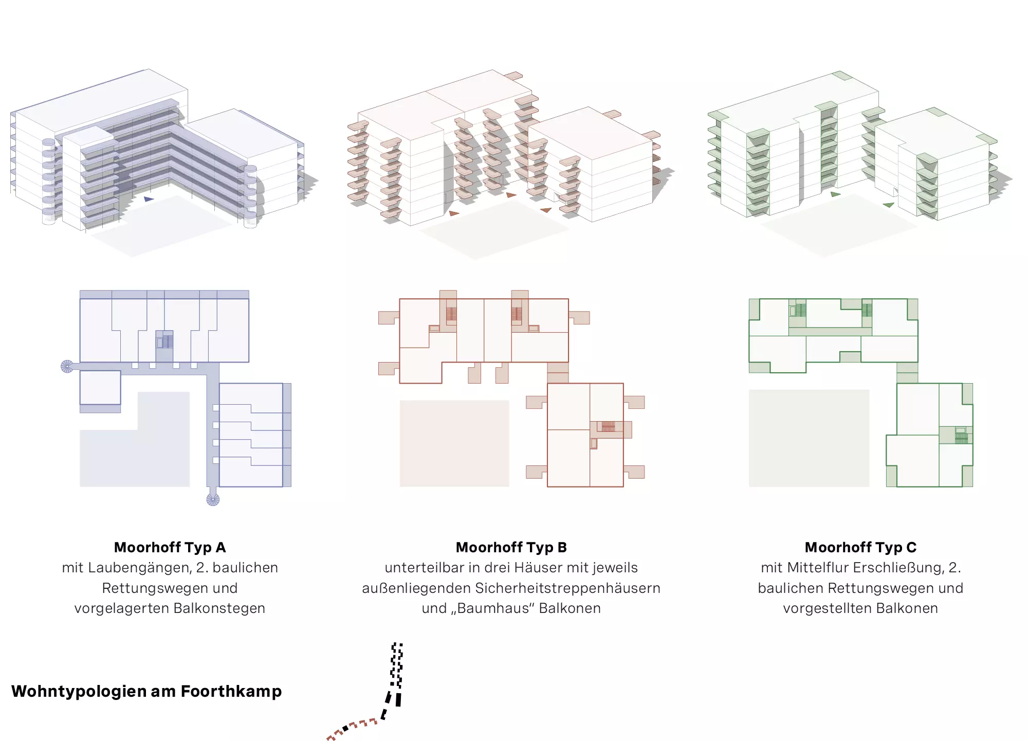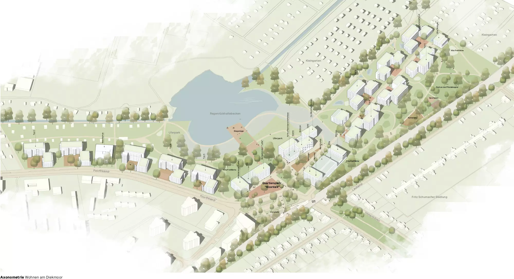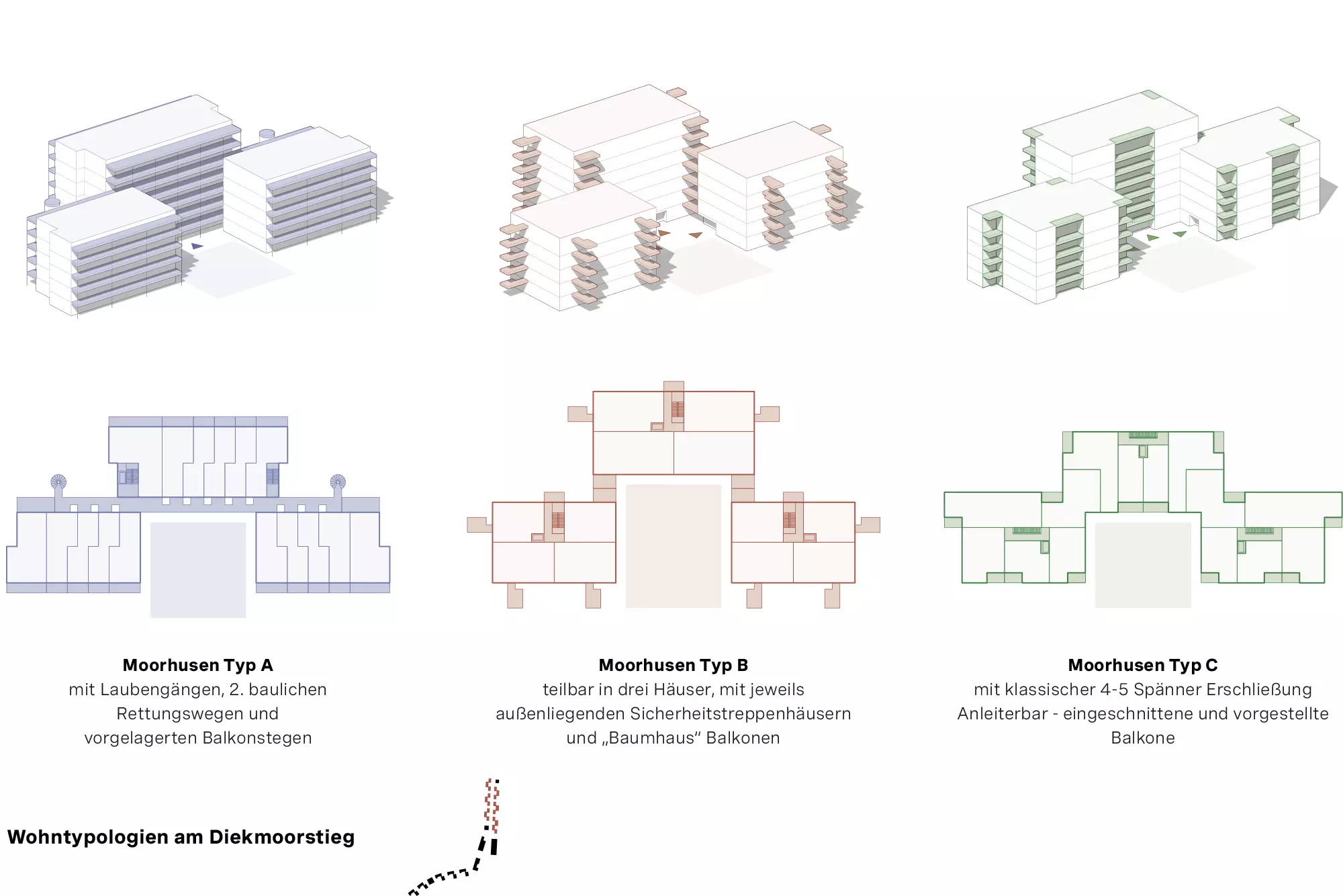 Kleine Hofgemeinschaften entlang des zentralen Diekmoorstiegs und modulare Bauweisen ermöglichen vielseitige Wohnangebote, die auf die Bedürfnisse verschiedener Lebensmodelle zugeschnitten sind. Regelmäßige Blickachsen zur Moorlandschaft und kleinteilige Freiräume stärken den Bezug zur Natur. Gemeinschaftliche Treffpunkte wie der Quartiersplatz „Moorkiek“ und vielfältige Freiflächen laden zur Interaktion ein und fördern ein lebendiges Miteinander, das an die Tradition der Schumacher-Siedlung anknüpft und diese zeitgemäß weiterentwickelt.
