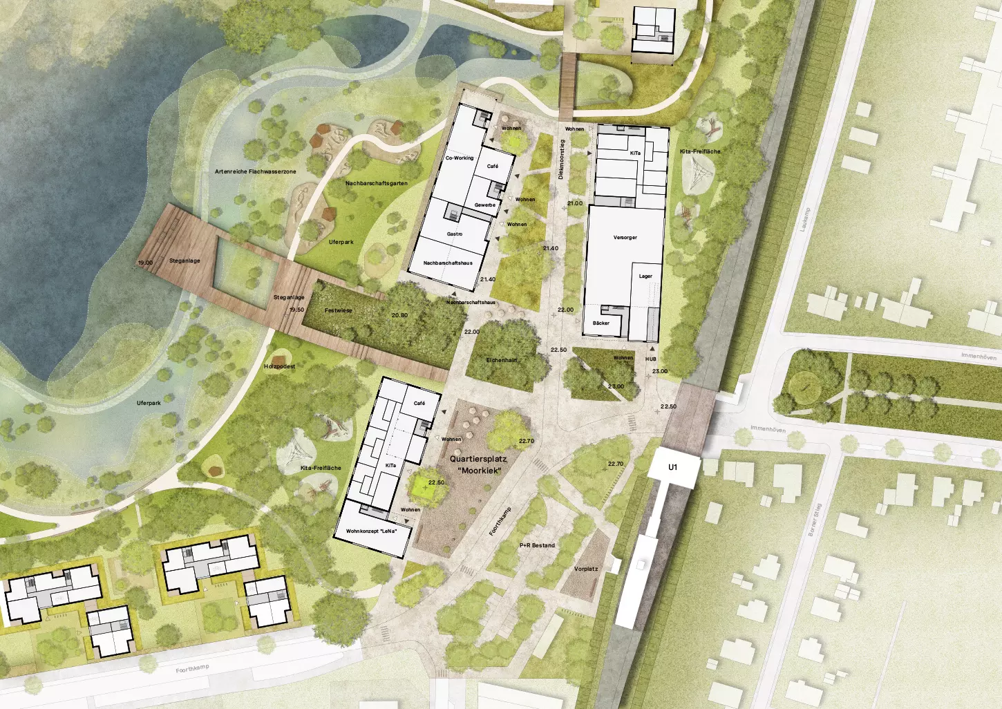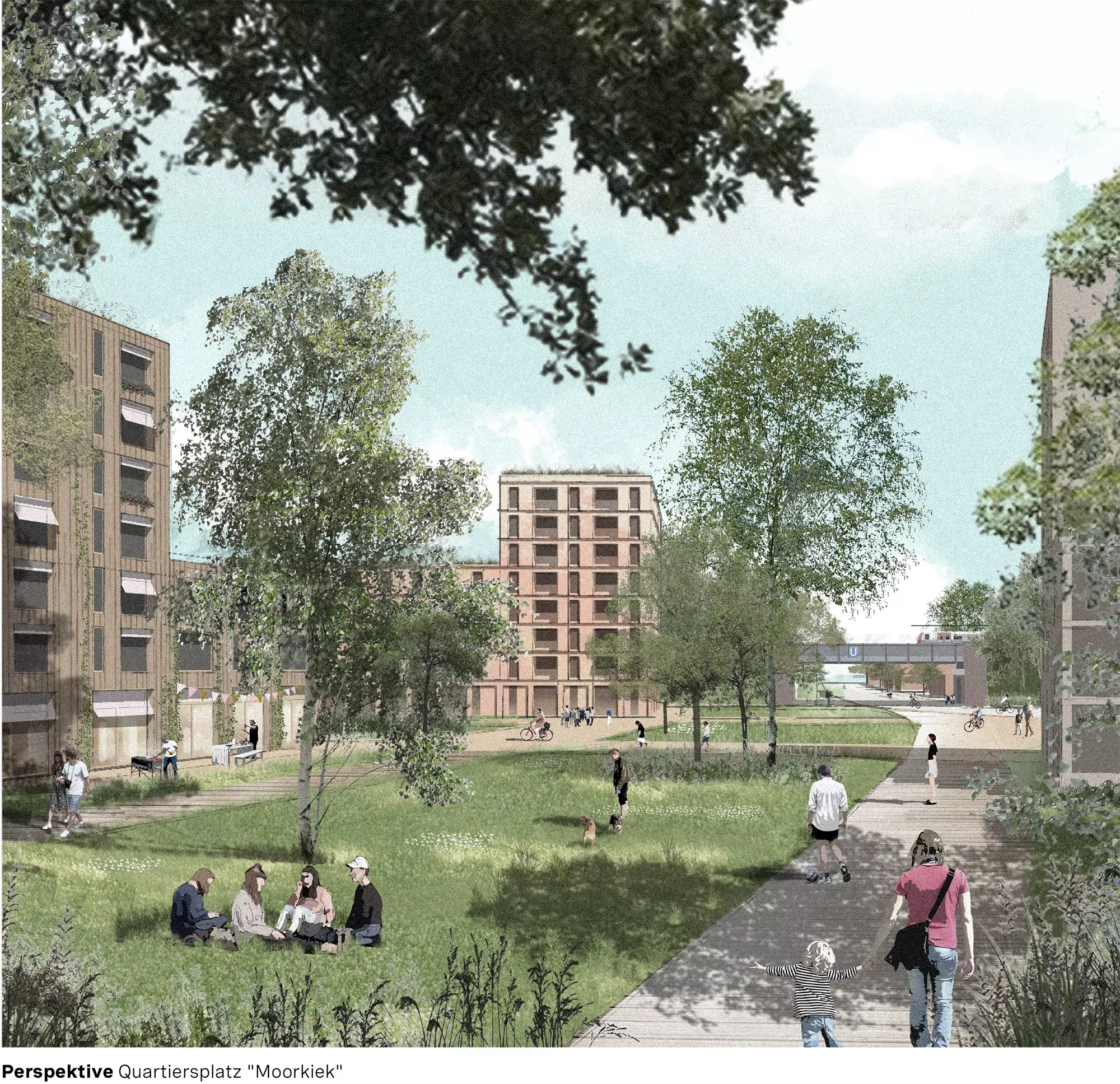 Neben einer effizienten Flächennutzung und dem Schutz wertvoller Biotope bietet das Quartier eine hohe Lebensqualität durch klare Nachbarschaftsstrukturen, vielfältige Wohnkonzepte und großzügige Erholungsräume. Der zentrale Quartiersplatz „Moorkiek“ verbindet Wohnen, Arbeiten und Freizeit und fungiert als lebendiges Zentrum. Naturnahe Parkanlagen, durchdachtes Regenwassermanagement und nachhaltige Bauweisen unterstreichen das Leitbild eines klimabewussten, lebenswerten und zukunftsorientierten Wohnquartiers.