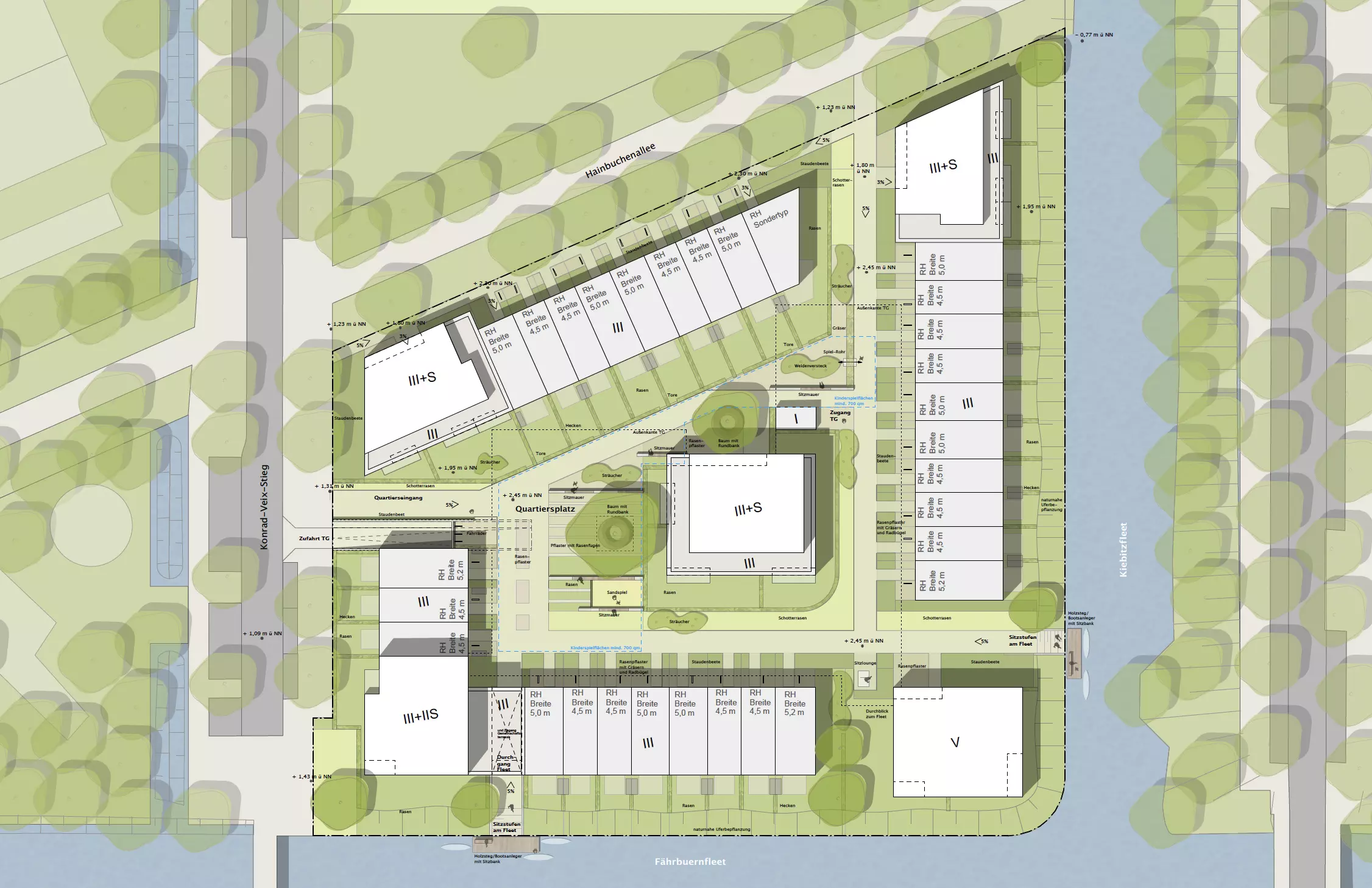 Ein zentraler Quartiersplatz mit Kinderspielflächen und Sitzgelegenheiten dient als Treffpunkt für Bewohner. Zugänge zu den Fleeten und Bootsanleger bieten zusätzliche Möglichkeiten für Freizeitaktivitäten.