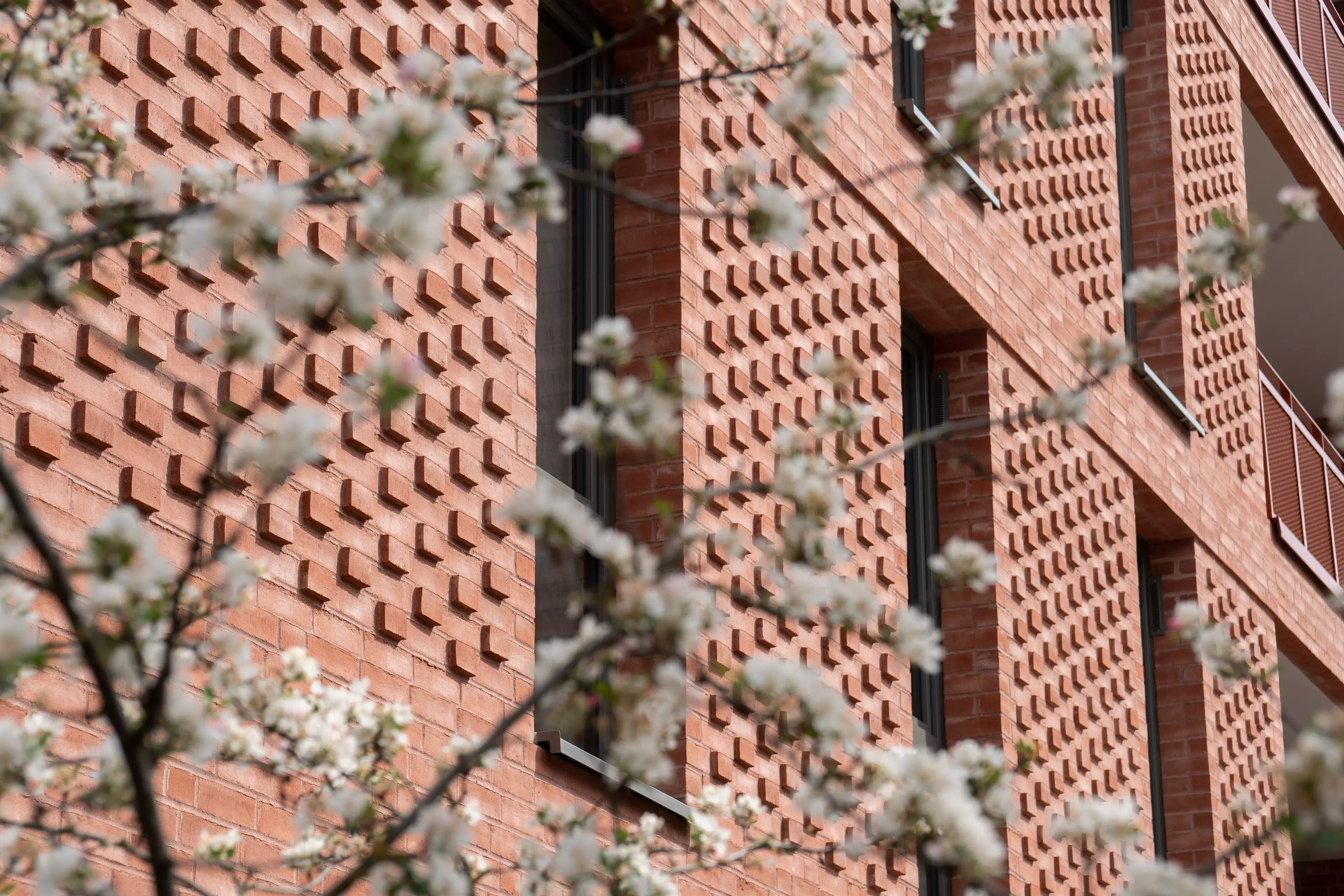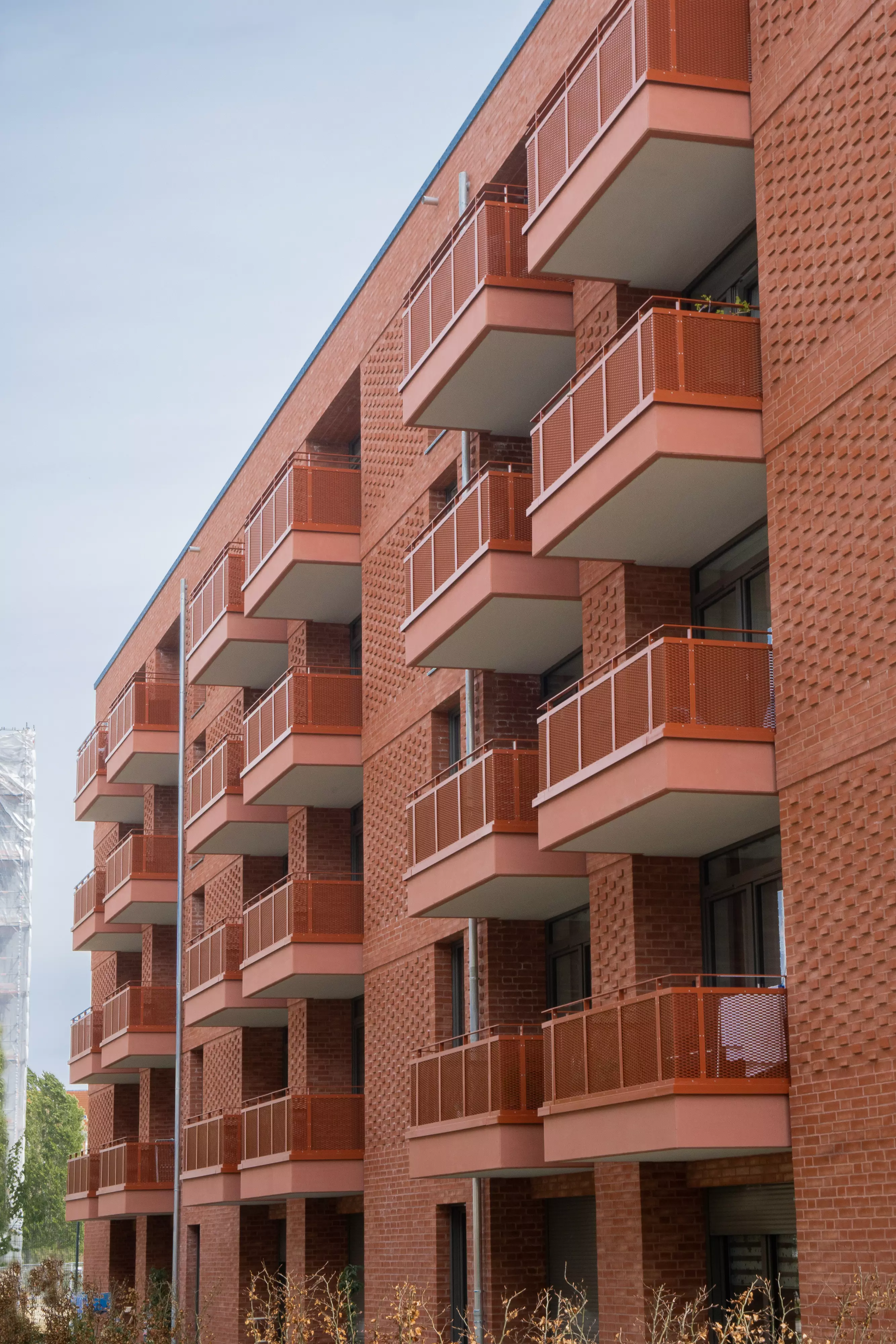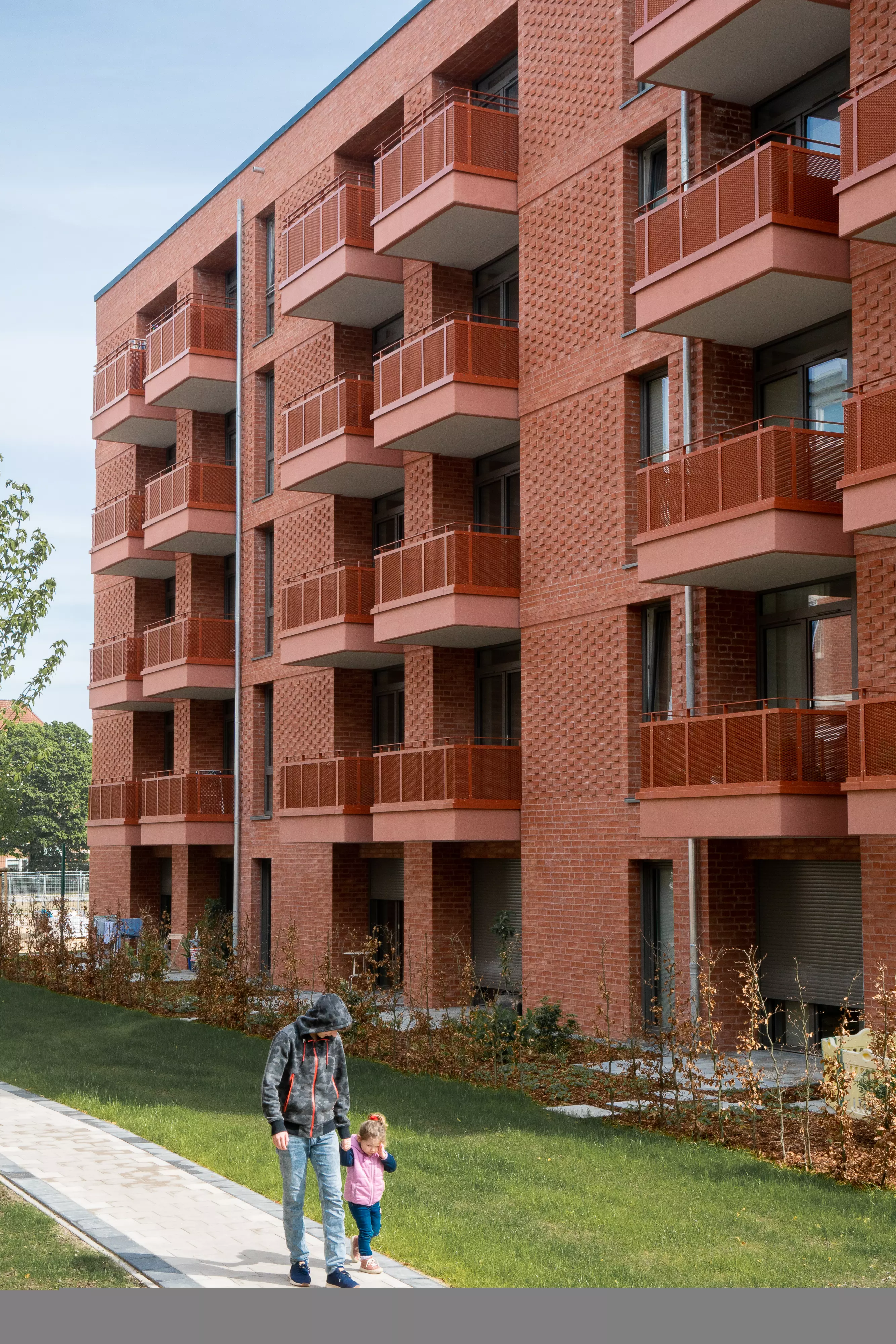Als ortstypische Fassade wurde ein hochwertiger roter Verblender mit Akzenten zeitgenössischer Mauerwerkskunst gewählt. Die roten Mauerwerksfugen und die rötlichen Betonbalkone erzeugen eine homogene Wirkung. Die Verwendung von roten Metallgeländern setzt einen weiteren Akzent und rundet das harmonische Gesamtbild ab.