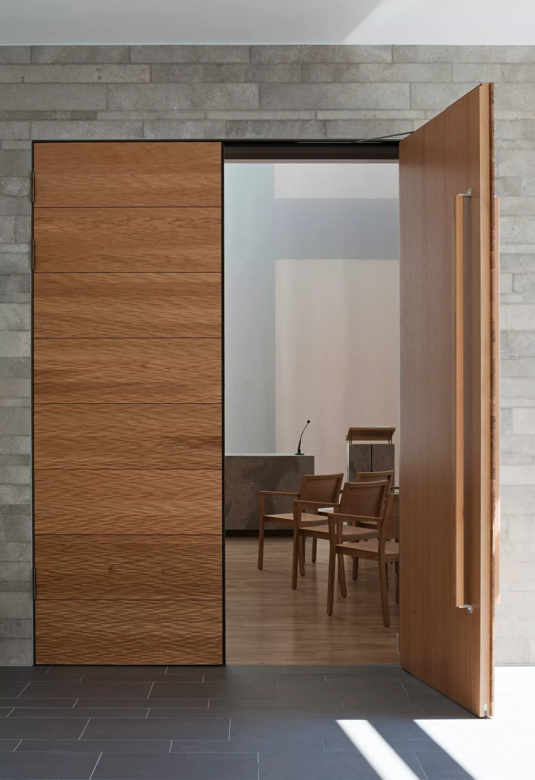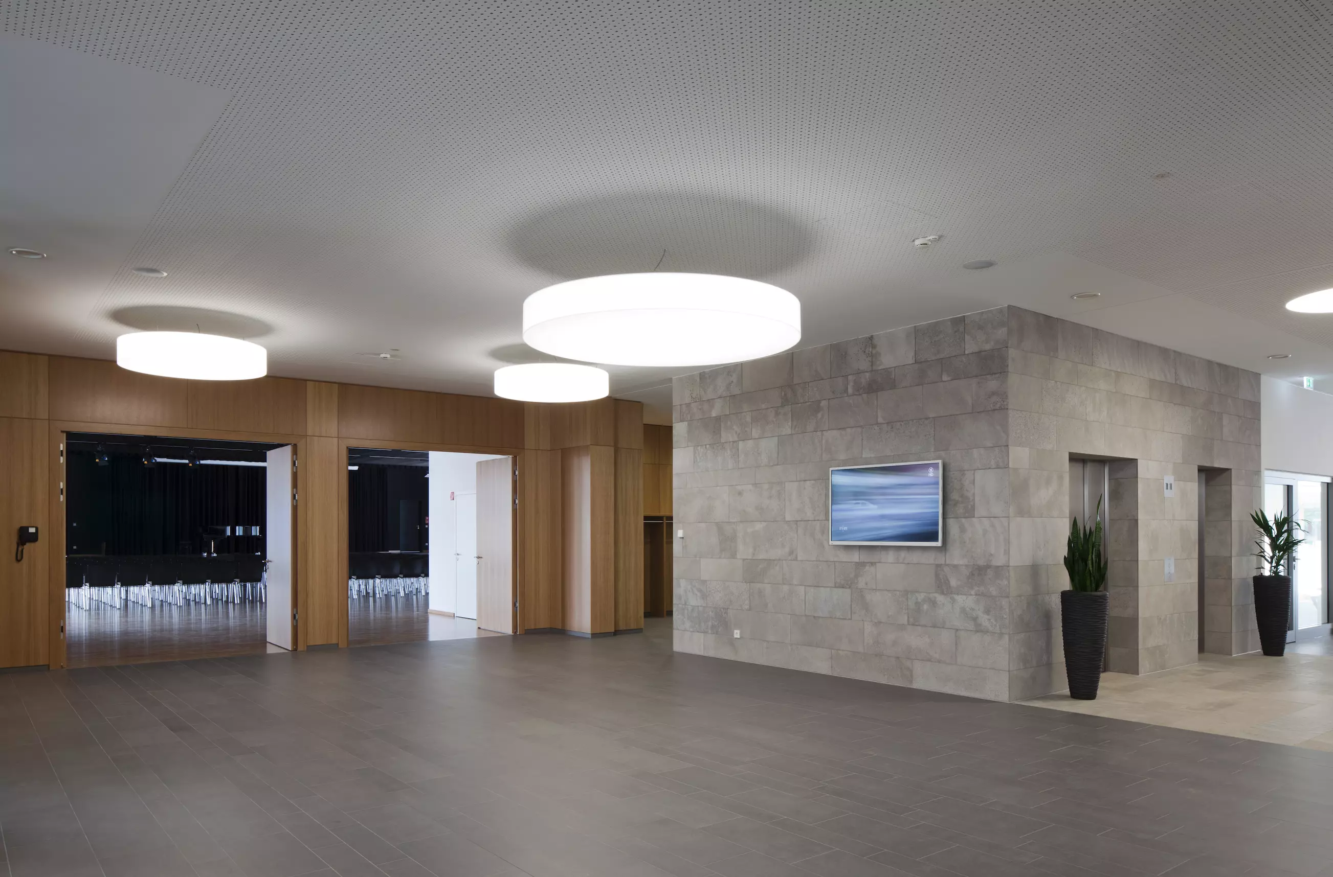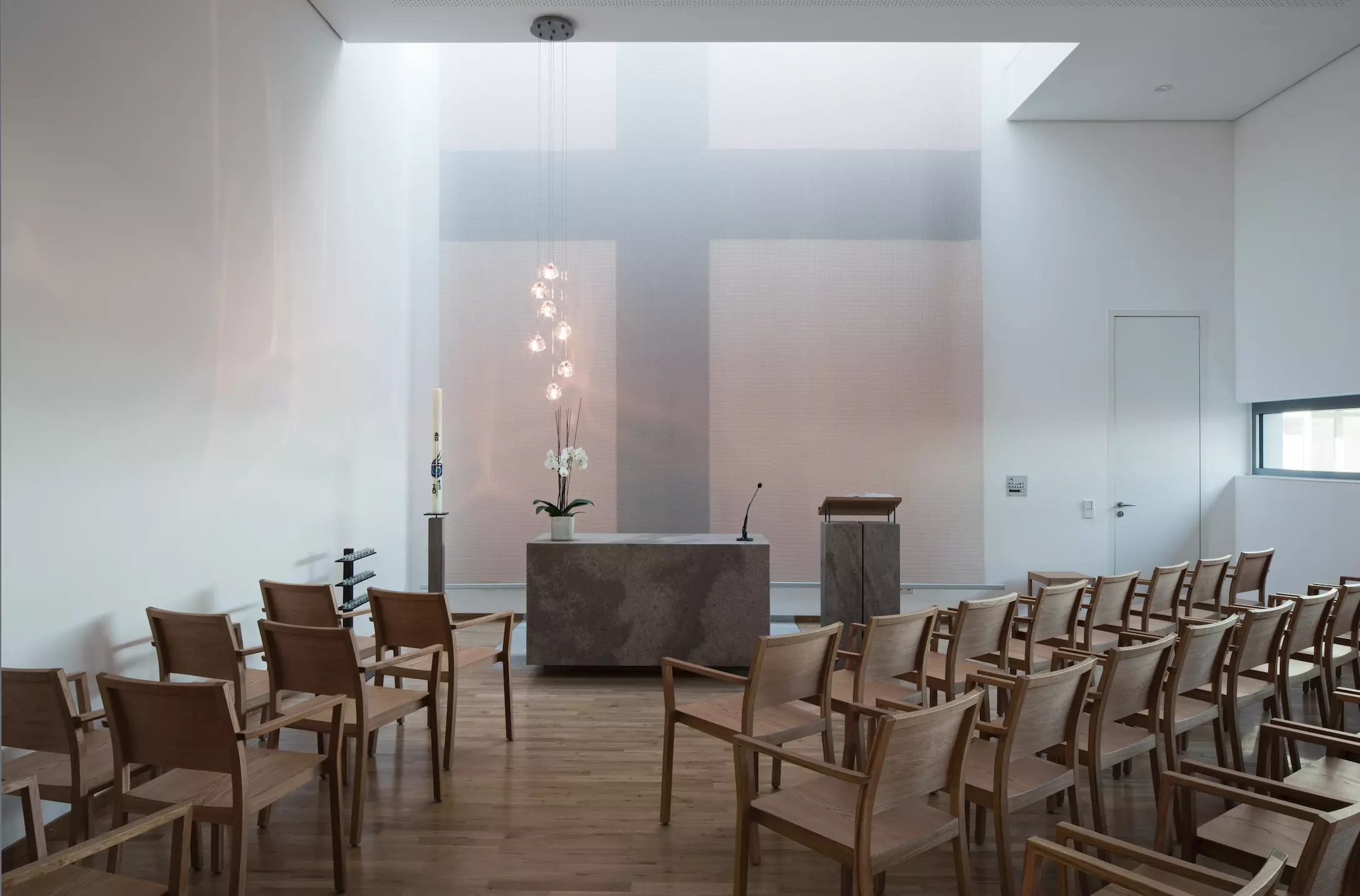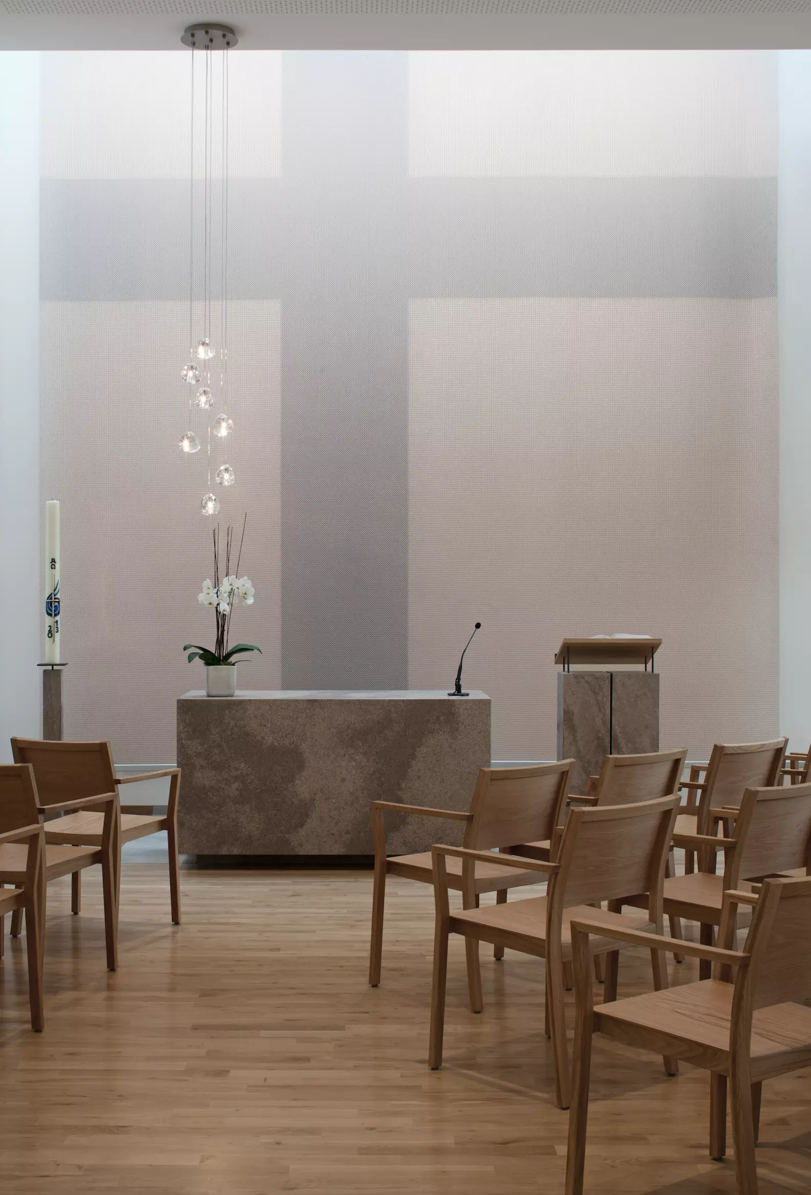 Der Materialkanon nimmt sowohl im Innenraum als auch in der Fassade durch die Verwendung eines lokalen Muschelkalksteins Bezug zum Ort auf.