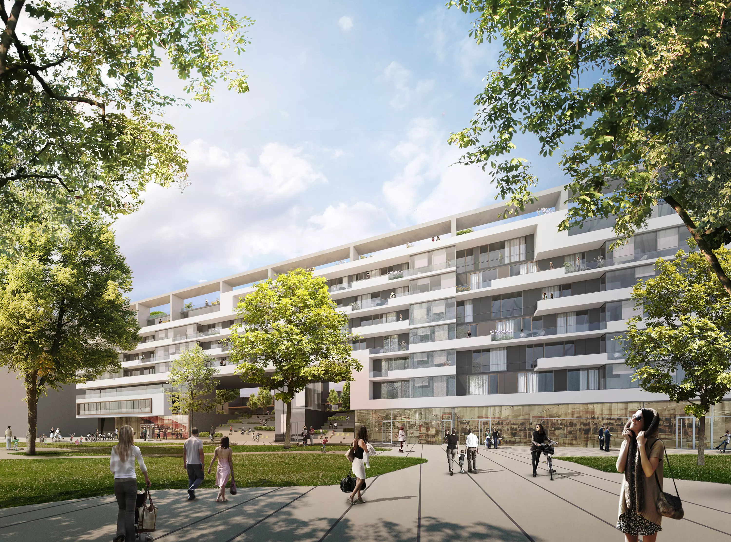 Ein buntes Wohnungsschlüsselkonzept ermöglicht eine flexible Gestaltung der Wohnungsgrößen und -typen, während eine differenzierte Fassadengestaltung die Vielfalt des Gebäudekomplexes unterstreicht. Von außen präsentiert sich der Komplex mit einer einheitlichen Gesamtkubatur, während zur Parkseite hin eine auskragende Loggien-Vorhangfassade eine elegante Erscheinung verleiht.