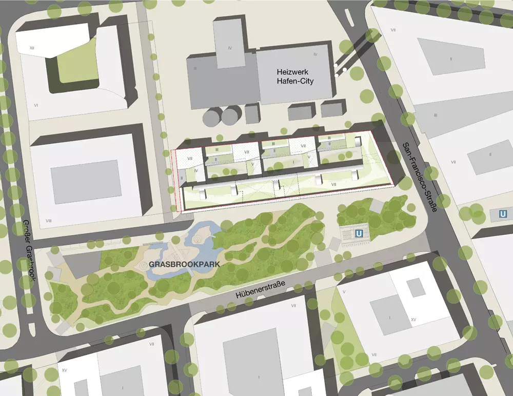 Wohnvielfalt am Grasbrookpark - Die städtebauliche Gestaltung des Gebäudekomplexes orientiert sich an einer geordneten Fassade zur San-Francisco-Straße hin und schafft zugleich eine klare Raumkante zum angrenzenden Grasbrookpark. Besonderes Augenmerk liegt auf einer großzügigen Öffnung des südlichen Baukörpers zum Park hin, welche durch eine einladende Freitreppe betont wird. Diese Verbindung zwischen Stadt und Natur bildet das Herzstück unseres Konzepts und lädt Bewohner und Besucher gleichermaßen zum Verweilen und Genießen ein.
