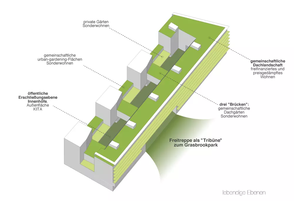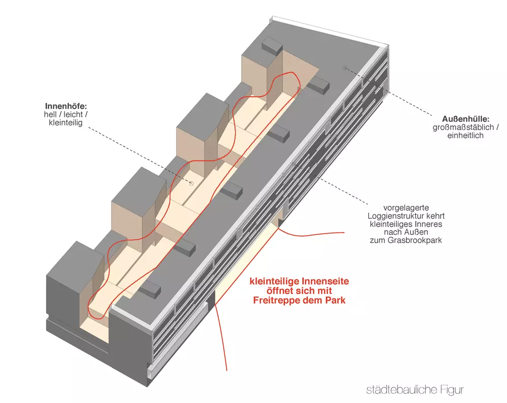 Das innovative Hofkonzept zeichnet sich durch eine hohe Dichte mit maximaler Weite aus, wobei quer verlaufende, zweigeschossige Brücken drei kleine Innenhöfe schaffen. Durch solitäre "Sonderwohntürme" an der Nordseite wird eine optimale Durchlüftung und Belichtung der Höfe gewährleistet, während gleichzeitig eine angenehme Wohnatmosphäre geschaffen wird.