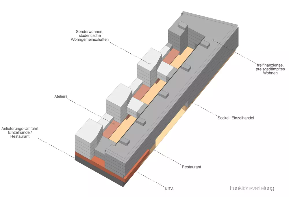 Unser minimiertes Erschließungskonzept trägt nicht nur zur Effizienz des Gebäudekomplexes bei, sondern belebt auch die Innenhöfe durch direkte Zugänge zu Treppenhäusern und Fahrstühlen. Die differenzierte Nutzungsverteilung im Sockelgeschoss reagiert sensibel auf die Bedürfnisse der Bewohner und der umliegenden Nachbarschaft, indem Einzelhandel, Kita und Gewerberäume direkt zugänglich sind.