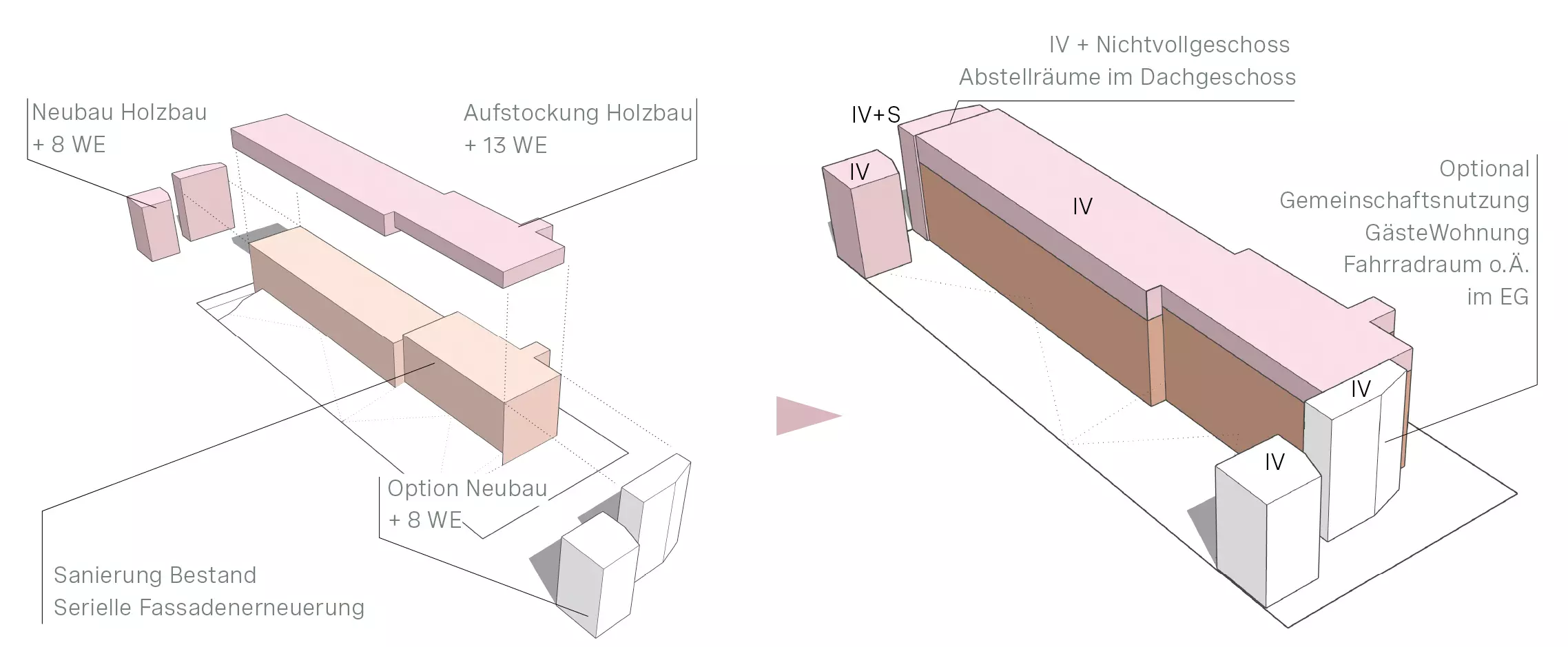 Der Dreiklang aus Sanierung, Aufstockung und Neubau nutzt den Bestand als Ressource und ergänzt ihn dort, wo es städtebaulich und genehmigungslogisch Sinn ergibt. Die serielle Sanierung mit Holzmodulen reduziert Baustellenzeit und Emissionen und wertet die Gebäudehülle gestalterisch auf. Die Aufstockung in Leichtbauweise schafft zusätzlichen Wohnraum bei minimierten Eingriffen in die Tragstruktur. Die Stirnseiten-Neubauten folgen einem Effizienzprinzip: Ein genehmigungsfähiger Baukörper wird konsequent wiederholt (optional gespiegelt) – mit Einsparungen in Planung und Ausführung.